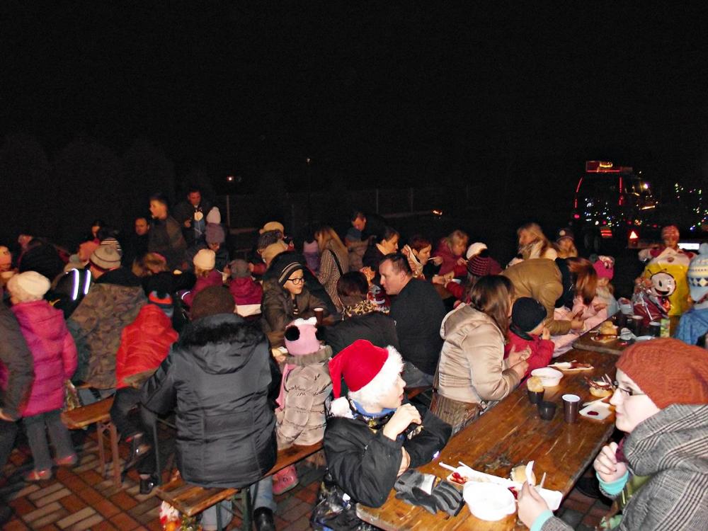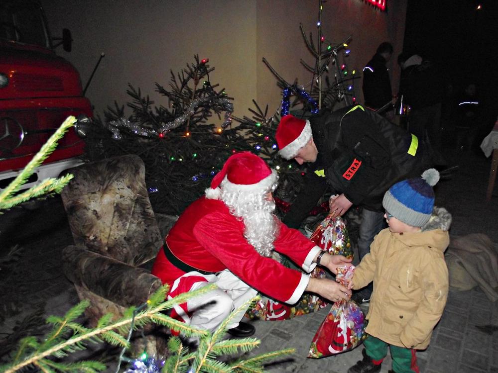 Największe wrażenie zrobił wjazd Mikołaja, na specjalnie przygotowanej przyczepie, ciągnionej przez naszego pożarniczego Jeepa Nissana Terano, na sygnałach dźwiękowych. Patron tego dnia nie zapomniał o prezentach dla najmłodszych.