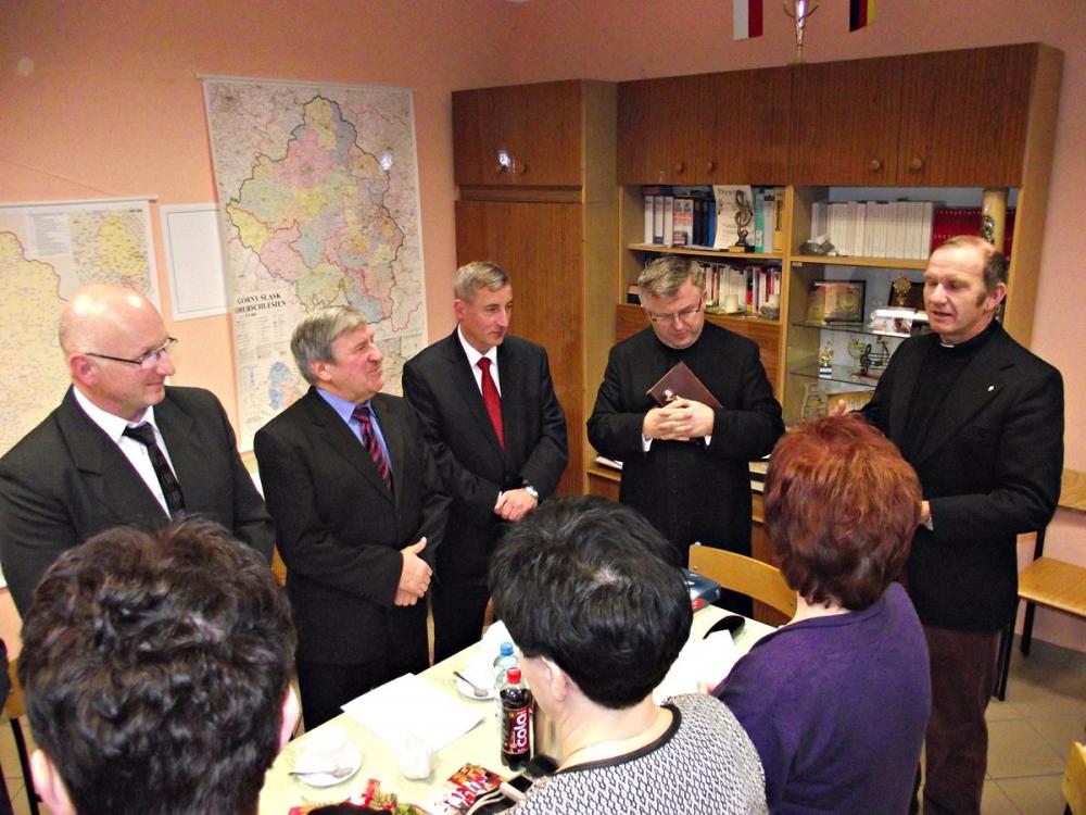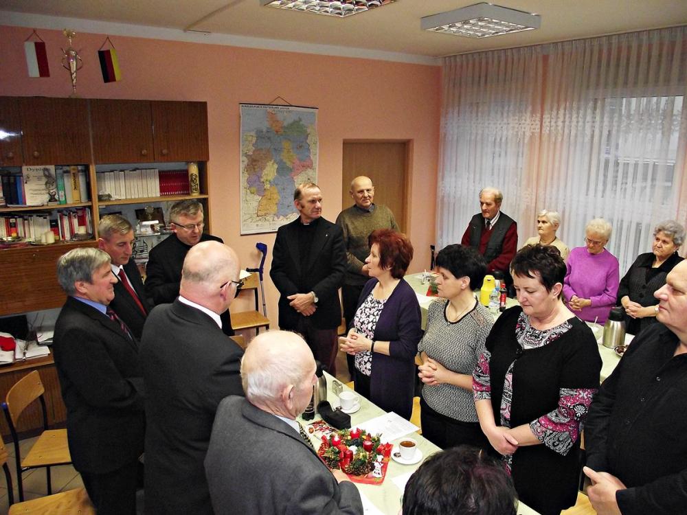Proboszcz odczytał fragment ewangelii związany z narodzeniem Dzieciątka Jezus oraz pobłogosławił opłatki, którymi później się dzielono, składając sobie najlepsze życzenia. Do wspólnego śpiewu kolęd i pastorałek przygrywał Józef Palt. Burmistrz Jan Labus oraz Radny Ryszard Koźlik złożyli życzenia świąteczno-noworoczne oraz podziękowali za uczestnictwo w wyborach. Do życzeń przyłączyli się również obecni duszpasterzy i przewodniczący koła DFK.