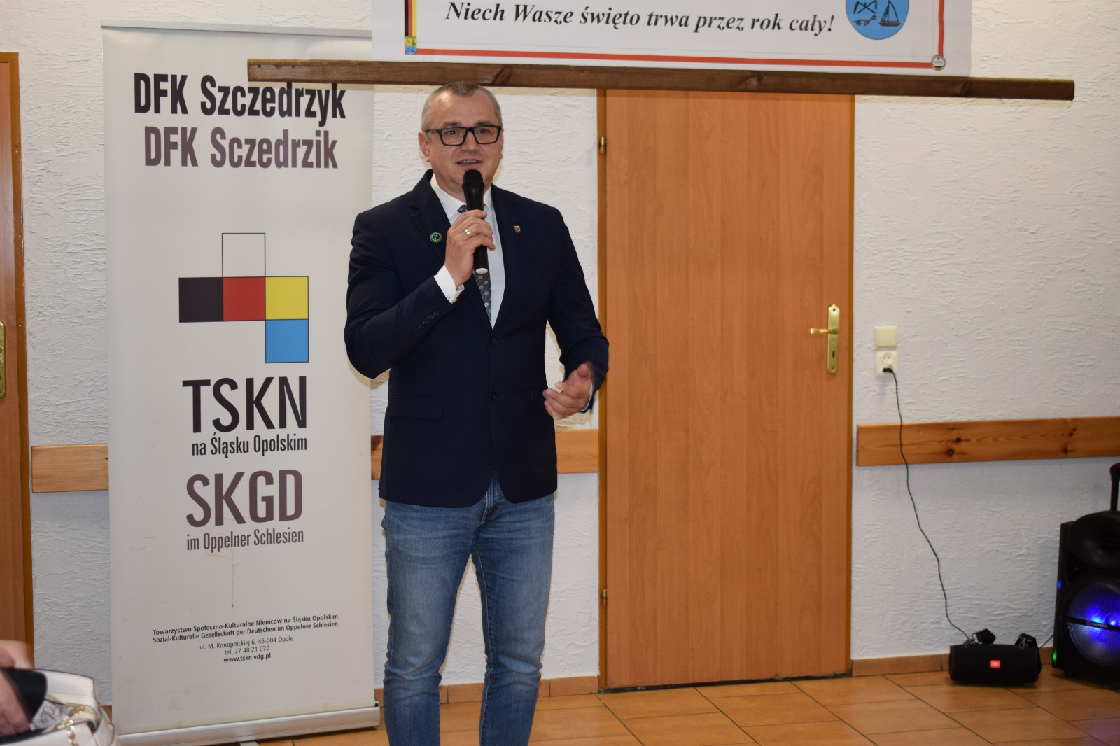 Do świetlicy w Szczedrzyku zaproszono członków mniejszości niemieckiej oraz gości, których przywitała przewodnicząca Koła Ewa Feliks: Burmistrza Ozimka Mirosława Wieszołka, radnego powiatowego Antoniego Gryca, sołtys Iwonę Feliks-Wójcik, przewodniczącą Stowarzyszenia Przyjaciół Szczedrzyka Beatę Wiorę oraz proboszcza ks. Krzysztofa Matyska, który wcześniej w kościele parafialnym odprawił mszę świętą w intencji matek i ojców z parafii Szczedrzyk.