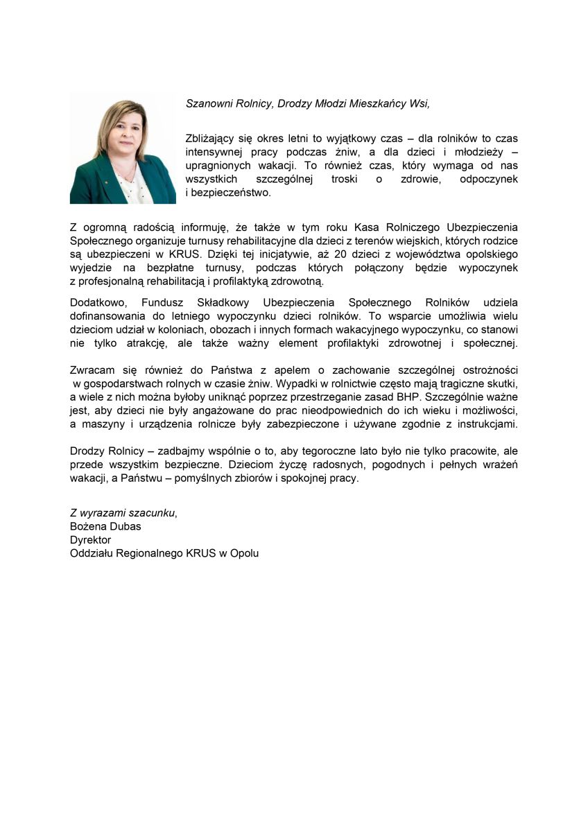 Pismo do rolników od Dyrektora Oddziału Regionalnego KRUS w Opolu