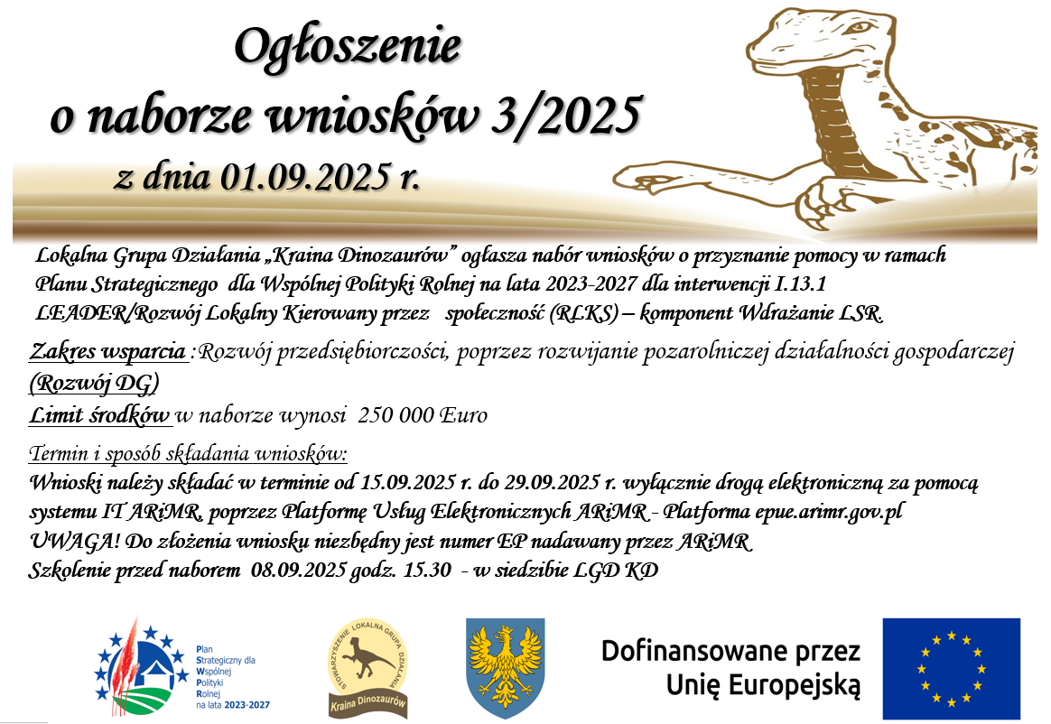 Więcej informacji na stronie: https://krainadinozaurow.pl/620/ogloszenie-o-naborze-32025.html oraz w biurze LGD KD
