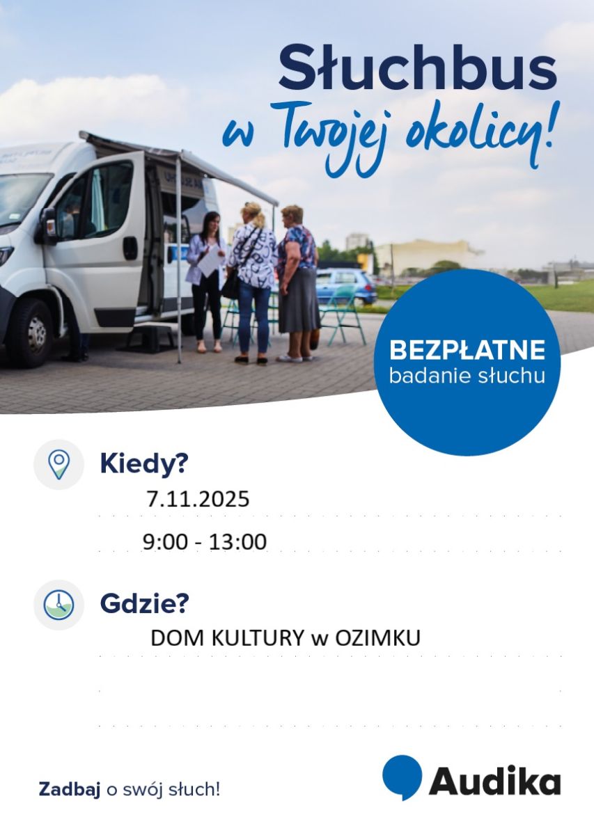 Masz problemy ze słuchem, chcesz profilaktycznie sprawdzić stan swojego słuchu, ale brakuje Ci czasu na dojazd do specjalisty? Teraz to specjalista przyjedzie do Ciebie! Skorzystaj z bezpłatnego badania słuchu w moblinym gabinecie Audikabus, które odbędzie się