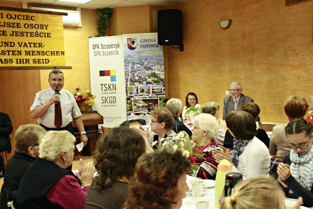 Przewodniczący koła Klaus Leschik przywitał wszystkich uczestników spotkania, ze szczególnym wyróżnieniem Przewodniczącego Rady Miejskiej w Ozimku Joachima Wiesbacha i Przewodniczącego Rady Sołeckiej Wsi Szczedrzyk Kazimierza Udolfa, Przewodniczącą Caritas Szczedrzyk Bernadettę Golomb i Dyrektora Przedszkola w Szczedrzyku Bożenę Stylską.