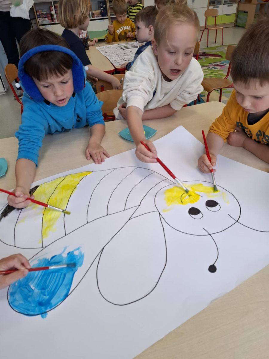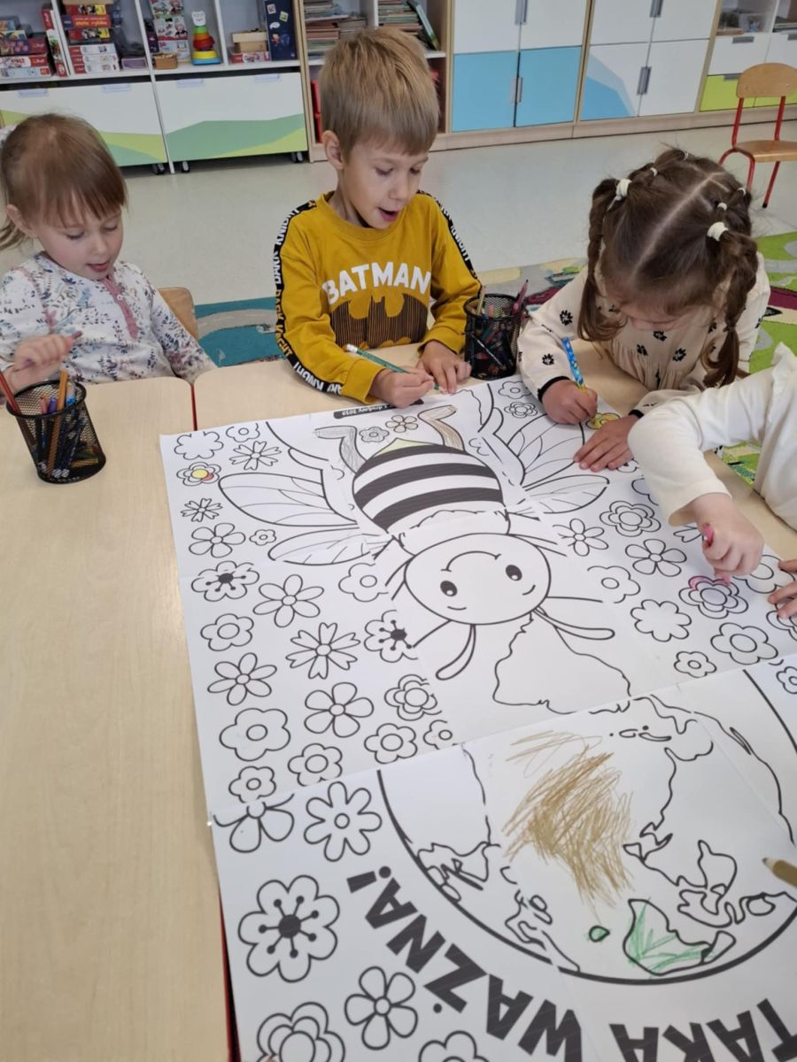 Dnia 20 maja obchodzimy Światowy Dzień Pszczół, który postanowiły świętować nasze przedszkolaki. Na początku dzieci dowiedziały się co to za święto, poznały jak wygląda proces tworzenia miodu, później odbyły się zabawy matematyczne oraz ruchowe. Dzieci pomalowały farbami ogromną pszczołę oraz pokolorowały plakat , który mówił o tym jak ważne są pszczoły w życiu człowieka. Na koniec zjadły słodkie ciasto, które upiekła mama Emilki za co przedszkolaki ogromnie dziękują.
