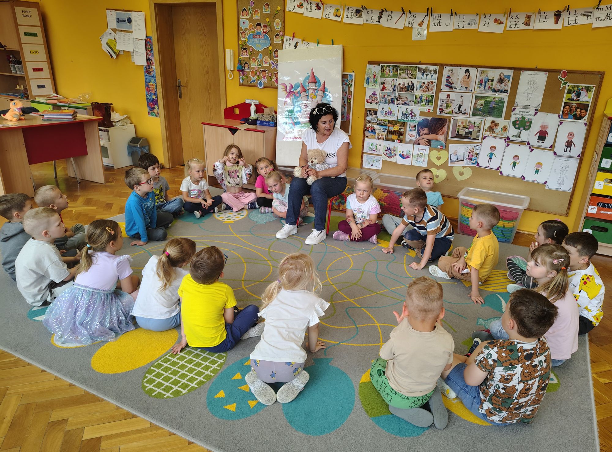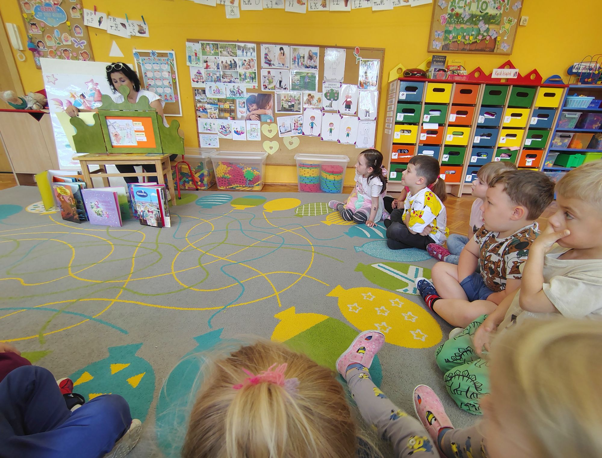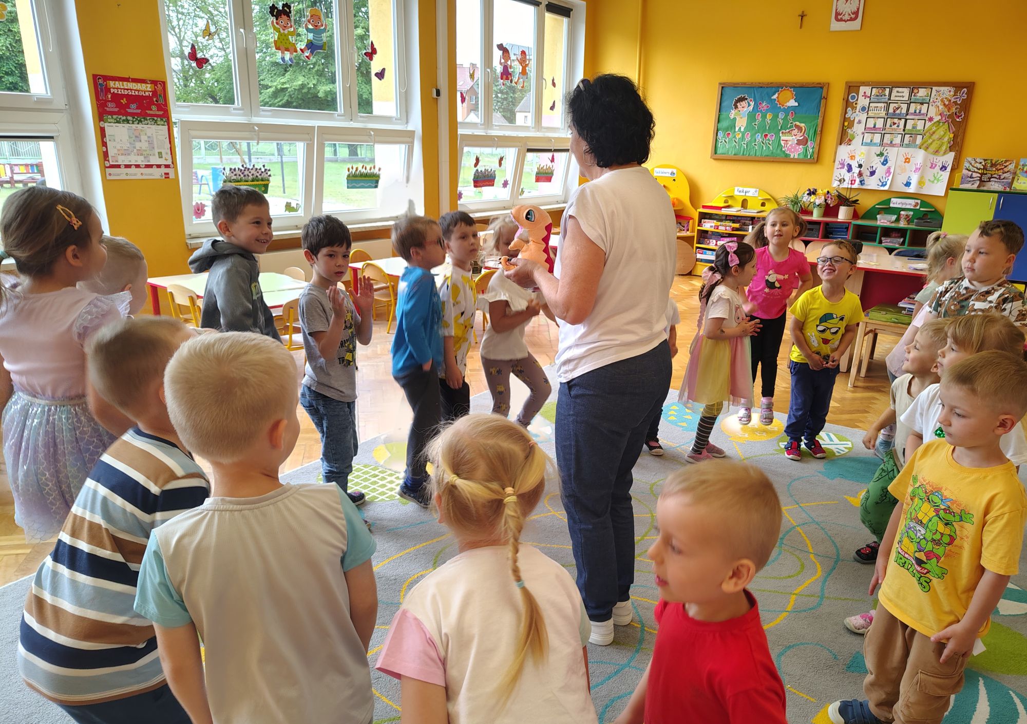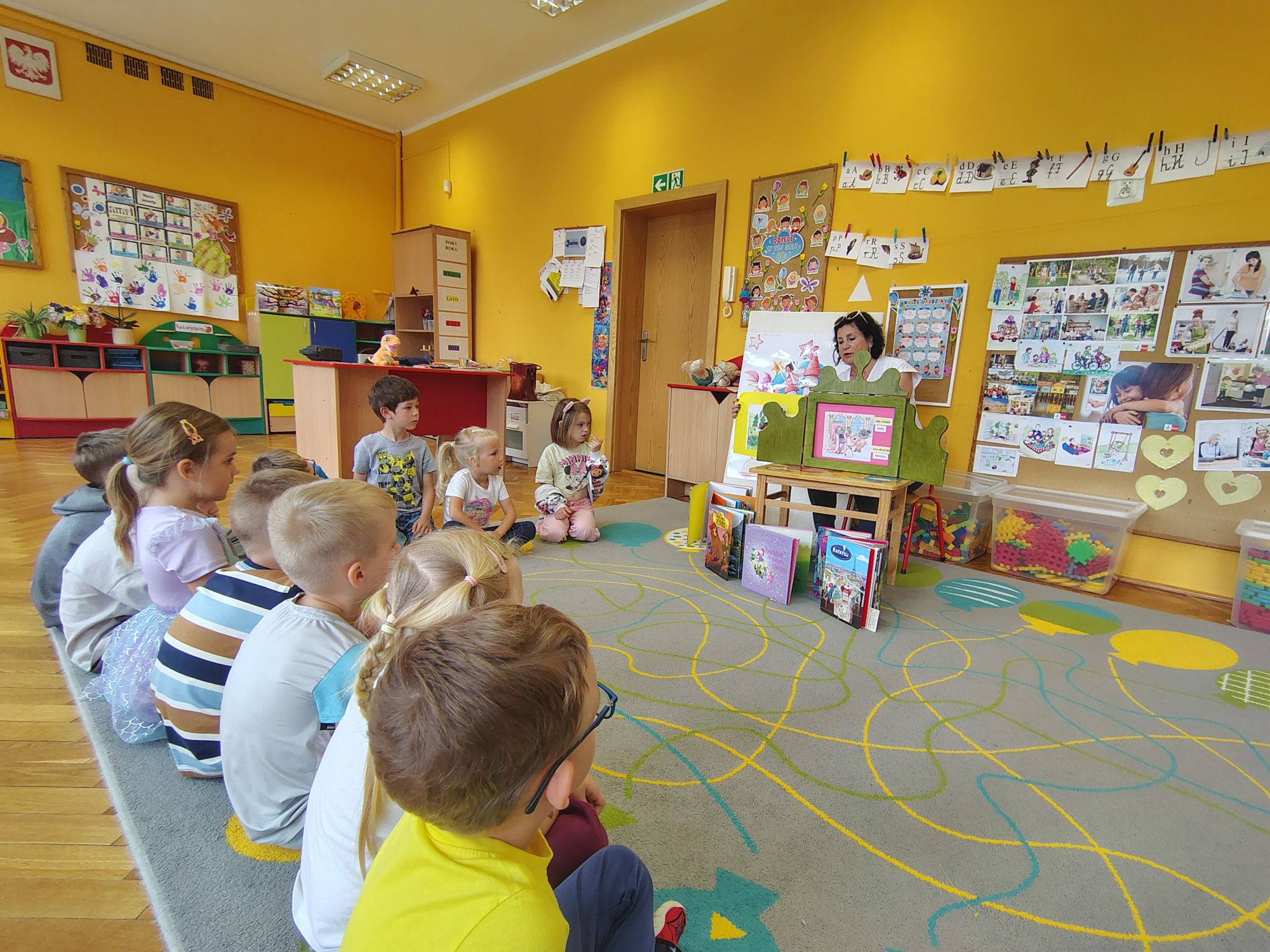 22 maja grupę Jagódek z Przedszkola Publicznego Nr 1 w Ozimku odwiedziła pani bibliotekarka Grażyna Świercz z Publicznej Szkoły Podstawowej Nr 1 w Ozimku z teatrzykiem kamishibai pt. „Kot w butach”. Zaciekawione przedszkolaki z zapartym tchem śledziły losy bohaterów. ,,Jagódki” z radością rozwiązywały zagadki związane z ulubionymi bajkami oraz za pomocą latarki odkrywały to, co niewidoczne gołym okiem znajduje się w zamku, tworząc atmosferę tajemnicy i ekscytacji. Nie zabrakło również zabaw muzyczno – ruchowych oraz słodkiego poczęstunku. Radość naszych przedszkolaków była przeogromna. Serdecznie dziękujemy Pani Grażynie Świercz za przeprowadzenie ciekawych, bardzo wartościowych zajęć w grupie ,,Jagódek”. Dzięki kreatywnemu podejściu do przekazywania wiedzy, pasji dzieci miały możliwość rozwijać swoje umiejętności oraz wspaniale spędzić czas.