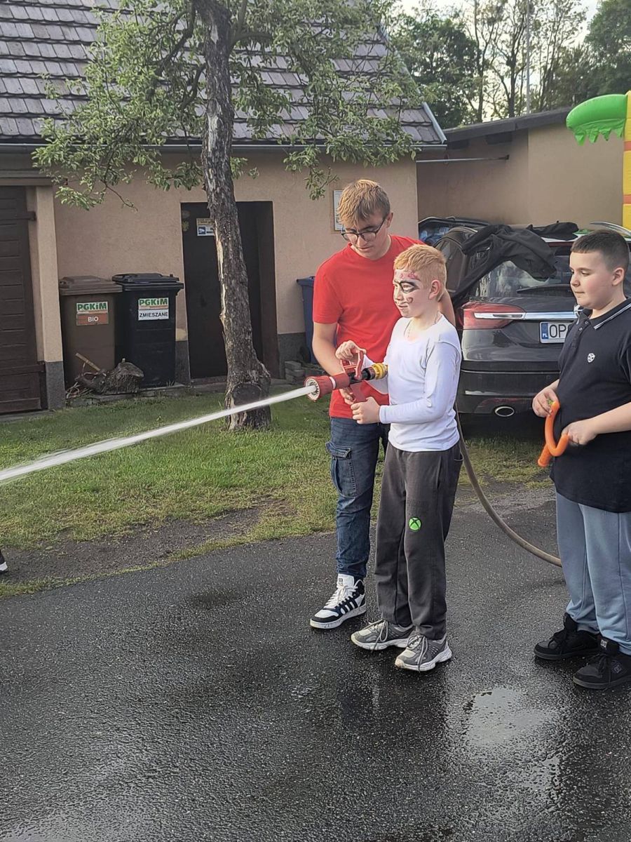 Odwiedziła nas też Ochotnicza Straż Pożarna ze Schodni, która zapewniła mnóstwo atrakcji – strażacy lali wodą, a dzieci mogły same spróbować strzelać z węża strażackiego. Było przy tym dużo radości i świetnej zabawy. Dodatkowo dzieci mogły zobaczyć wóz strażacki i się w nim rozgościć, co wzbudziło w nich ogromne zainteresowanie.
