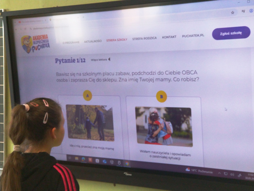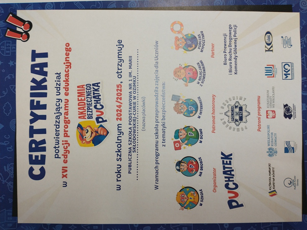Uczniowie klasy IA brali udział w ogólnopolskim programie edukacyjnym „Akademia Bezpiecznego Puchatka”. Program obejmuje tematykę związaną z bezpieczeństwem dzieci w sześciu obszarach: w szkole, na drodze, w domu, w Internecie, w relacjach z rówieśnikami oraz podczas wypoczynku.