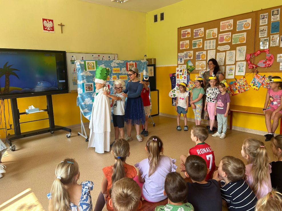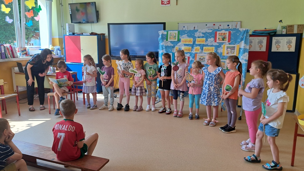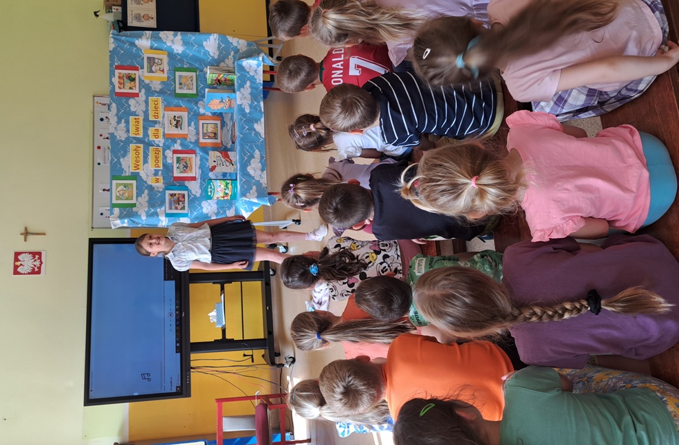 Następnie przedszkolaki zaprezentowały swoje talenty recytowały wierszyki, w tym znany utwór „Na straganie”, trzymając w rączkach piękne rekwizyty warzyw. Występy zakończyły się pięknym wierszem "Idzie niebo" wykonanym przez Hanię Wilczek. Na zakończenie czekał na nas słodki poczęstunek, a potem wspólna zabawa na szkolnym placu zabaw.