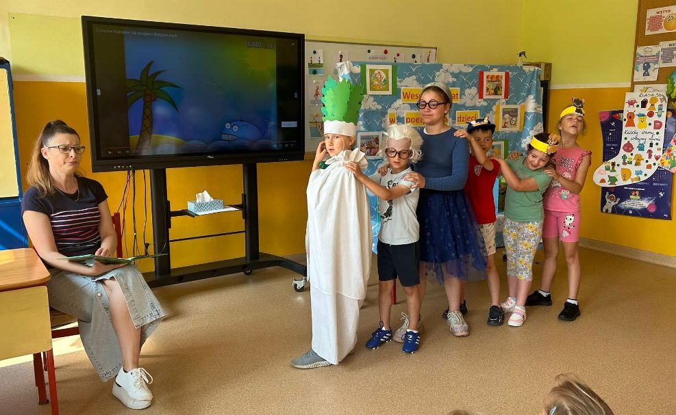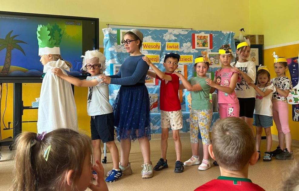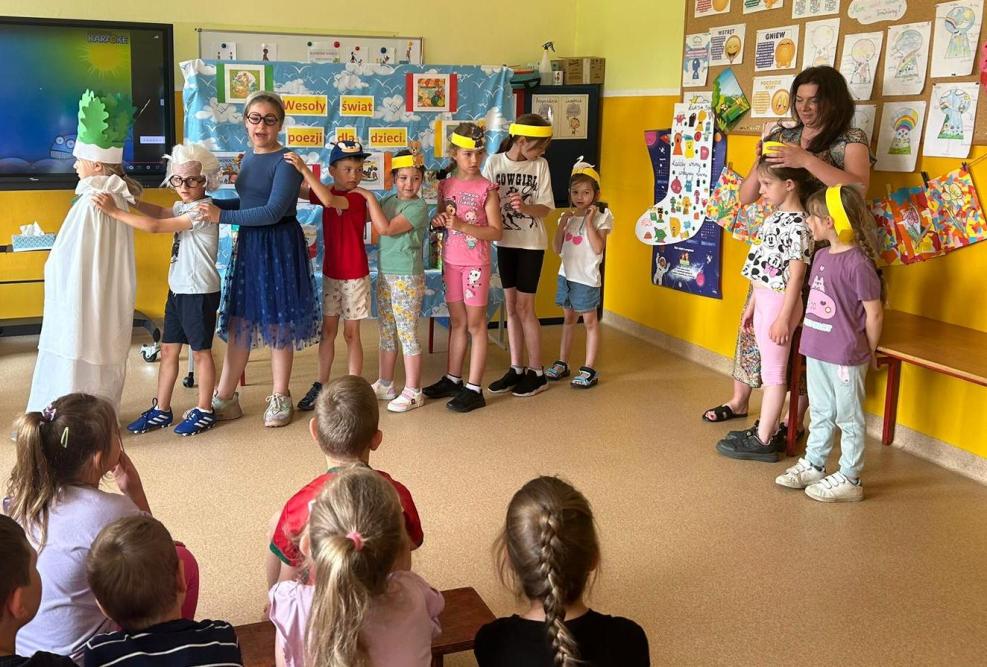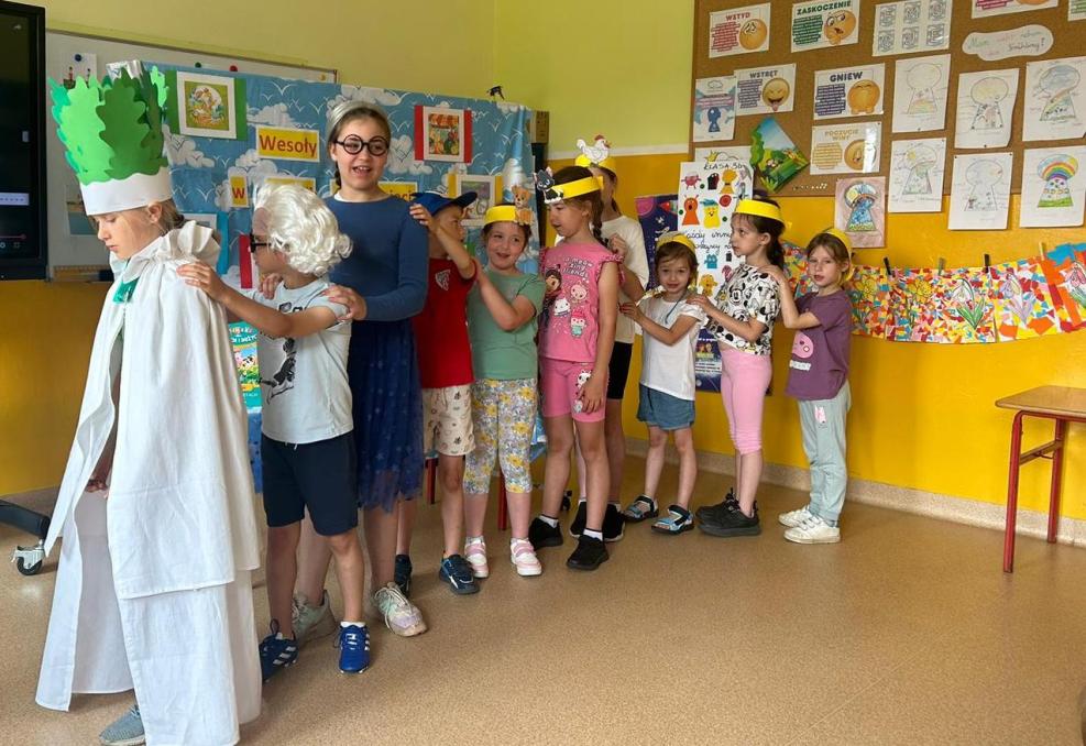 Uczniowie klasy 3b rozpoczęli spotkanie radośnie, śpiewając wspólnie dwie piosenki: „Kaczkę Dziwaczkę” oraz „Na wyspach Bergamutach”. Następnie pani Karolina przeczytała dzieciom wiersz „Rzepka” Juliana Tuwima. W rolę tytułowej rzepki wcielił się nasz uczeń Dominik, który jako pierwsza postać stanął dumnie w pięknym, specjalnie przygotowanym stroju. Do inscenizacji chętnie dołączały kolejne dzieci – zarówno nasi uczniowie, jak i przedszkolaki – odgrywając postaci z wiersza. Wychodziły kolejno, zgodnie z tekstem, i „ciągnęły rzepkę”, aż w końcu wszyscy… z uśmiechem wylądowali na podłodze! Występ sprawił dzieciom mnóstwo radości i wywołał dużo śmiechu, było to prawdziwie żywe czytanie! Po tej zabawnej scenie nasza uczennica Antonina Pytel zachwyciła wszystkich wykonaniem piosenki „Leń”, którą zaśpiewała z wielkim wdziękiem.