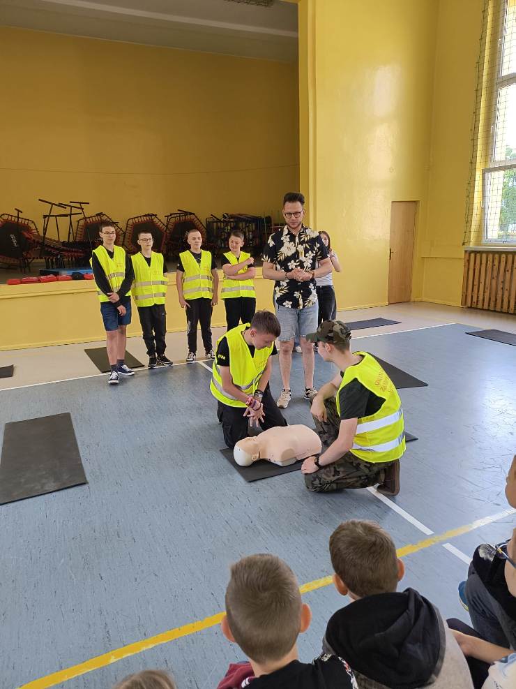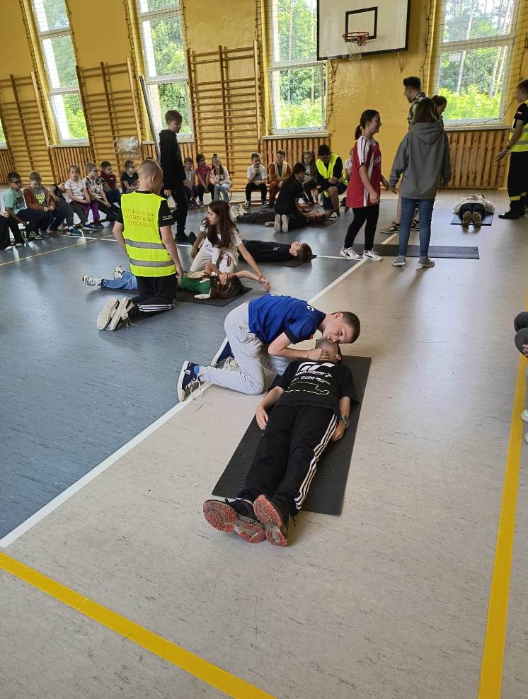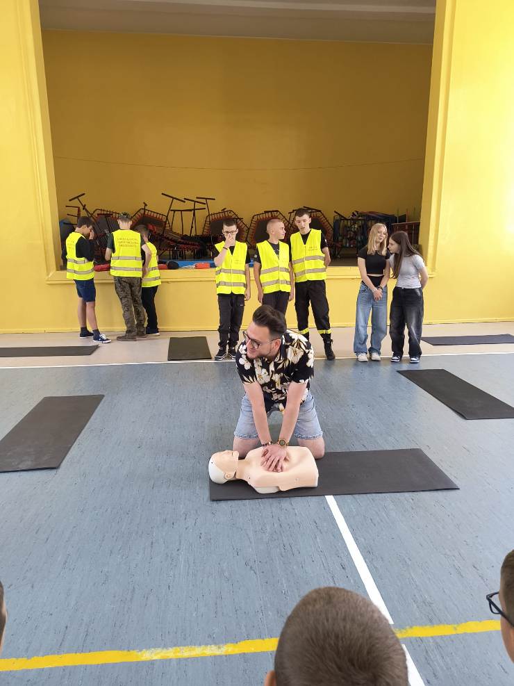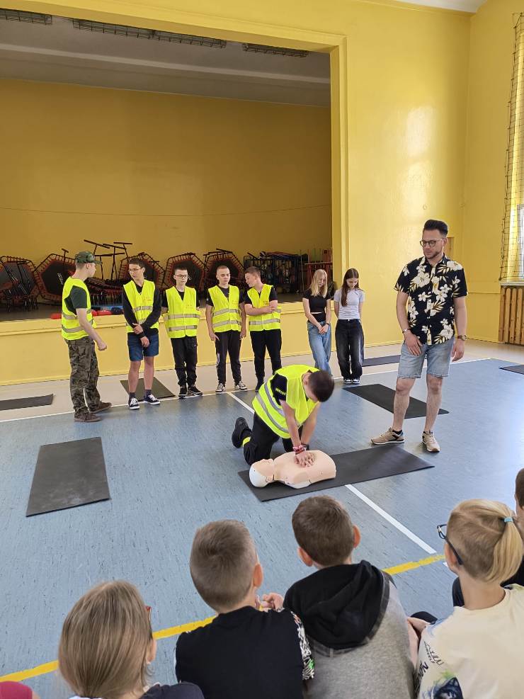 W czasie spotkania uczniowie zostali zapoznani z procedurami i sposobem postępowania na miejscu zdarzenia, a także ze sposobem postępowania z poszkodowanym nieprzytomnym oddychającym oraz nieprzytomnym bez wyczuwalnego oddechu. Mieli okazję przećwiczyć, jak należy sprawdzić oddech u osoby nieprzytomnej, ułożyć poszkodowanego w pozycji bocznej bezpiecznej oraz wykonać resuscytację krążeniowo-oddechową na fantomie. Pod bacznym okiem pana Białka uczniowie klas młodszych w asyście starszych kolegów wykonywali wszystkie ćwiczenia. Wszyscy z dużym zaangażowaniem i zainteresowaniem uczestniczyli w tych bardzo ciekawych zajęciach.