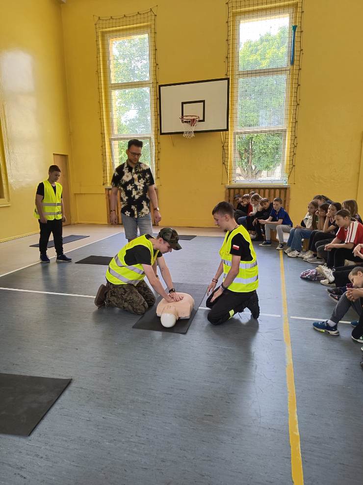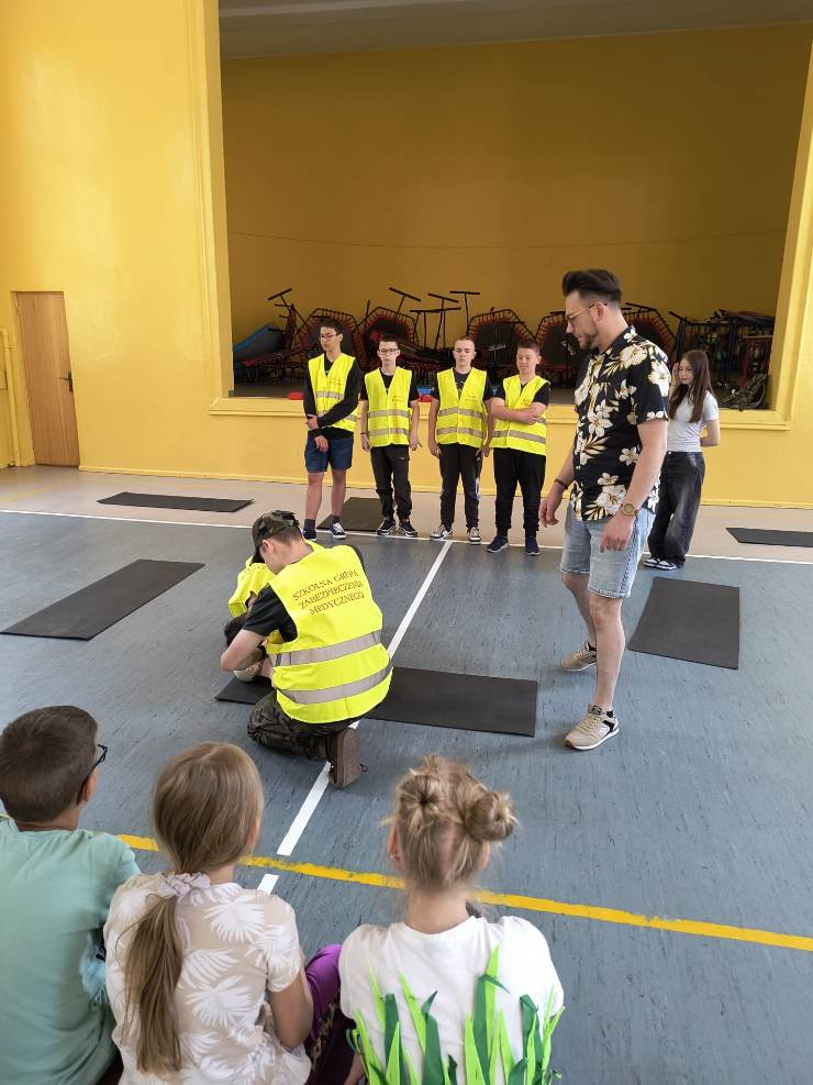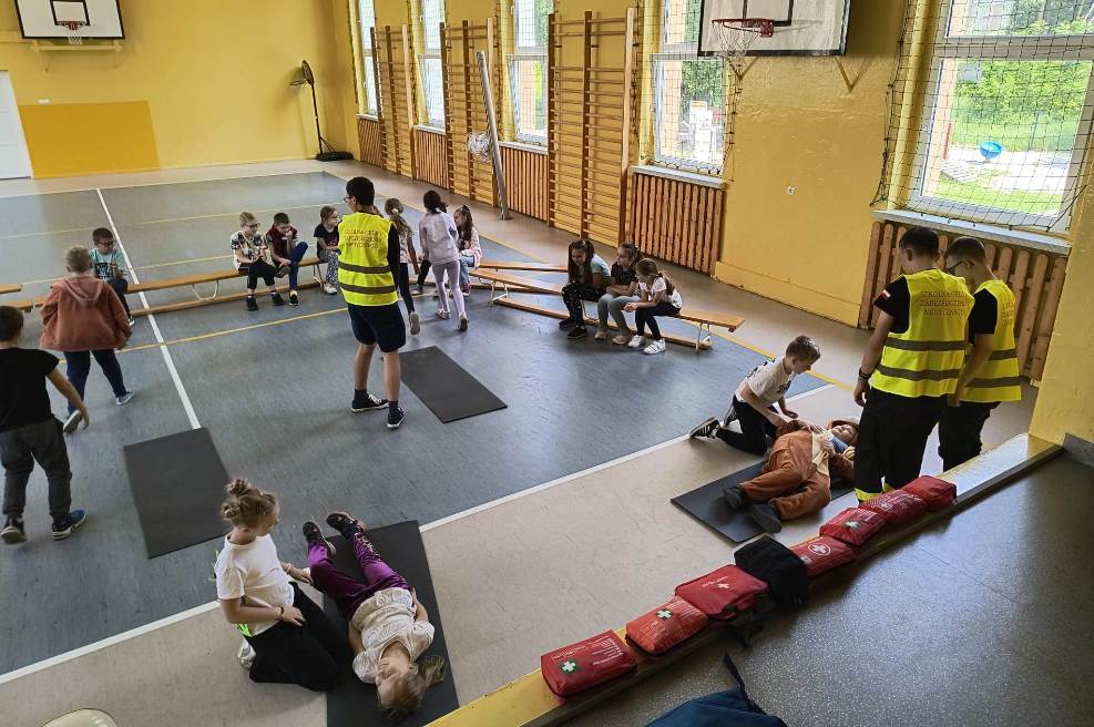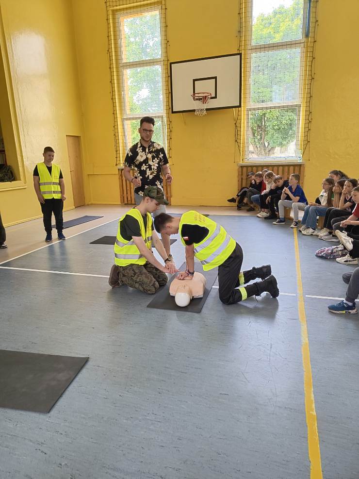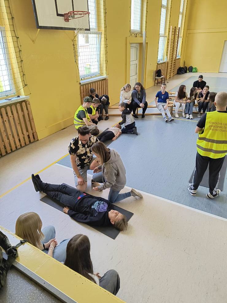 W czasie spotkania uczniowie zostali zapoznani z procedurami i sposobem postępowania na miejscu zdarzenia, a także ze sposobem postępowania z poszkodowanym nieprzytomnym oddychającym oraz nieprzytomnym bez wyczuwalnego oddechu. Mieli okazję przećwiczyć, jak należy sprawdzić oddech u osoby nieprzytomnej, ułożyć poszkodowanego w pozycji bocznej bezpiecznej oraz wykonać resuscytację krążeniowo-oddechową na fantomie. Pod bacznym okiem pana Białka uczniowie klas młodszych w asyście starszych kolegów wykonywali wszystkie ćwiczenia. Wszyscy z dużym zaangażowaniem i zainteresowaniem uczestniczyli w tych bardzo ciekawych zajęciach.