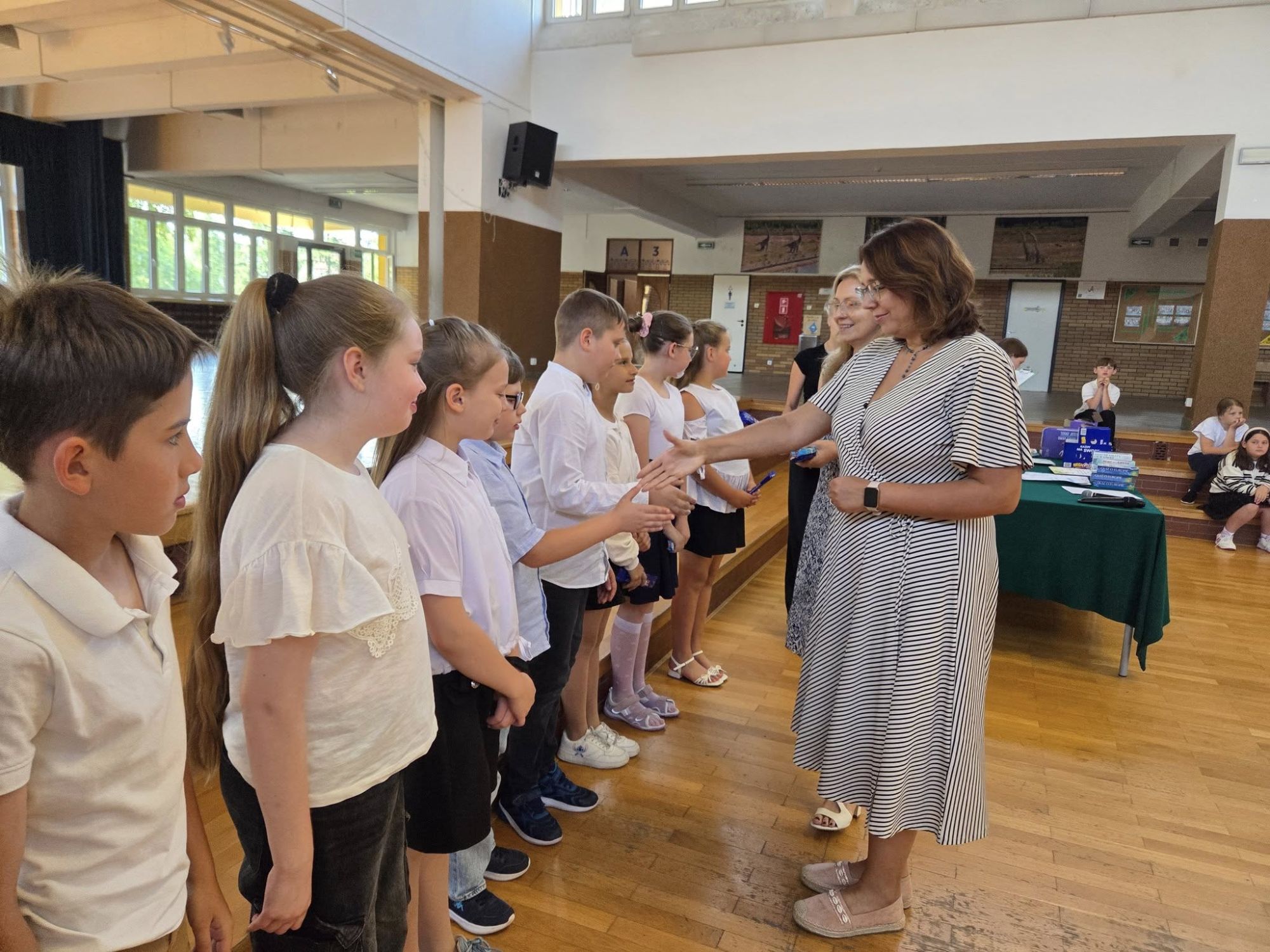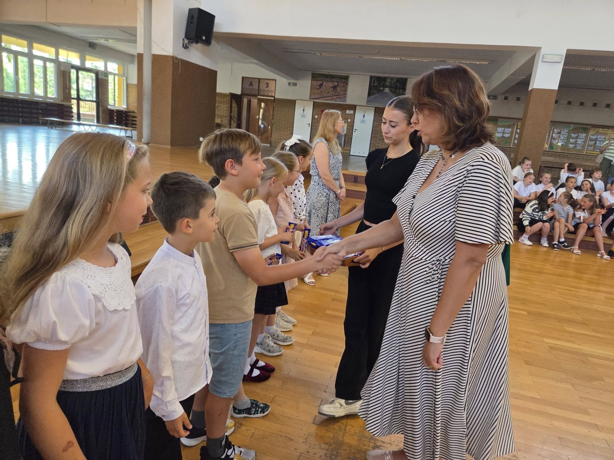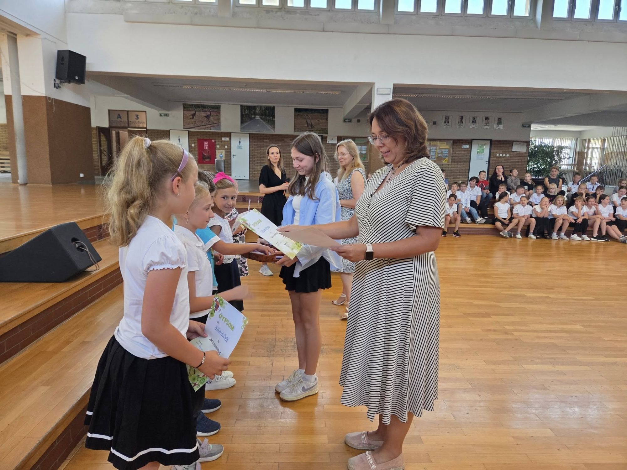 Pani Dyrektor Jolanta Bajor powitała uczniów, nauczycieli i wychowawców oraz dokonała krótkiego podsumowania minionych miesięcy. Był to czas intensywnej pracy, licznych aktywności i wielu sukcesów naszych uczniów. Nagrody za wzorową frekwencję, zbiórki surowców, wybitne osiągnięcia w konkursach, a także reprezentowanie szkoły w zawodach sportowych wręczyły Pani Dyrektor i Pani Wicedyrektor Małgorzata Korniak, które złożyły osobiste gratulacje wszystkim uczniom za ich wspaniałe osiągnięcia.
