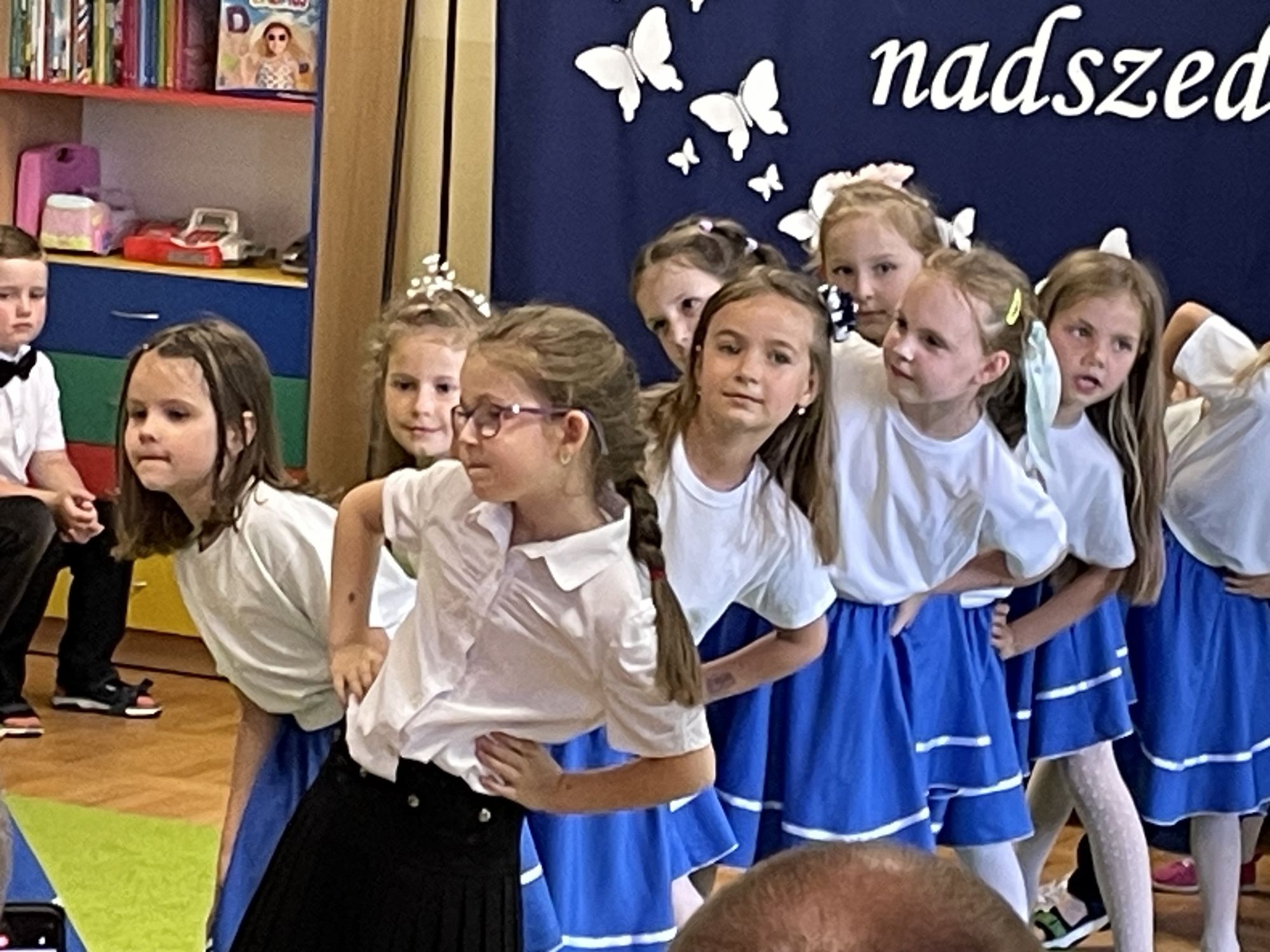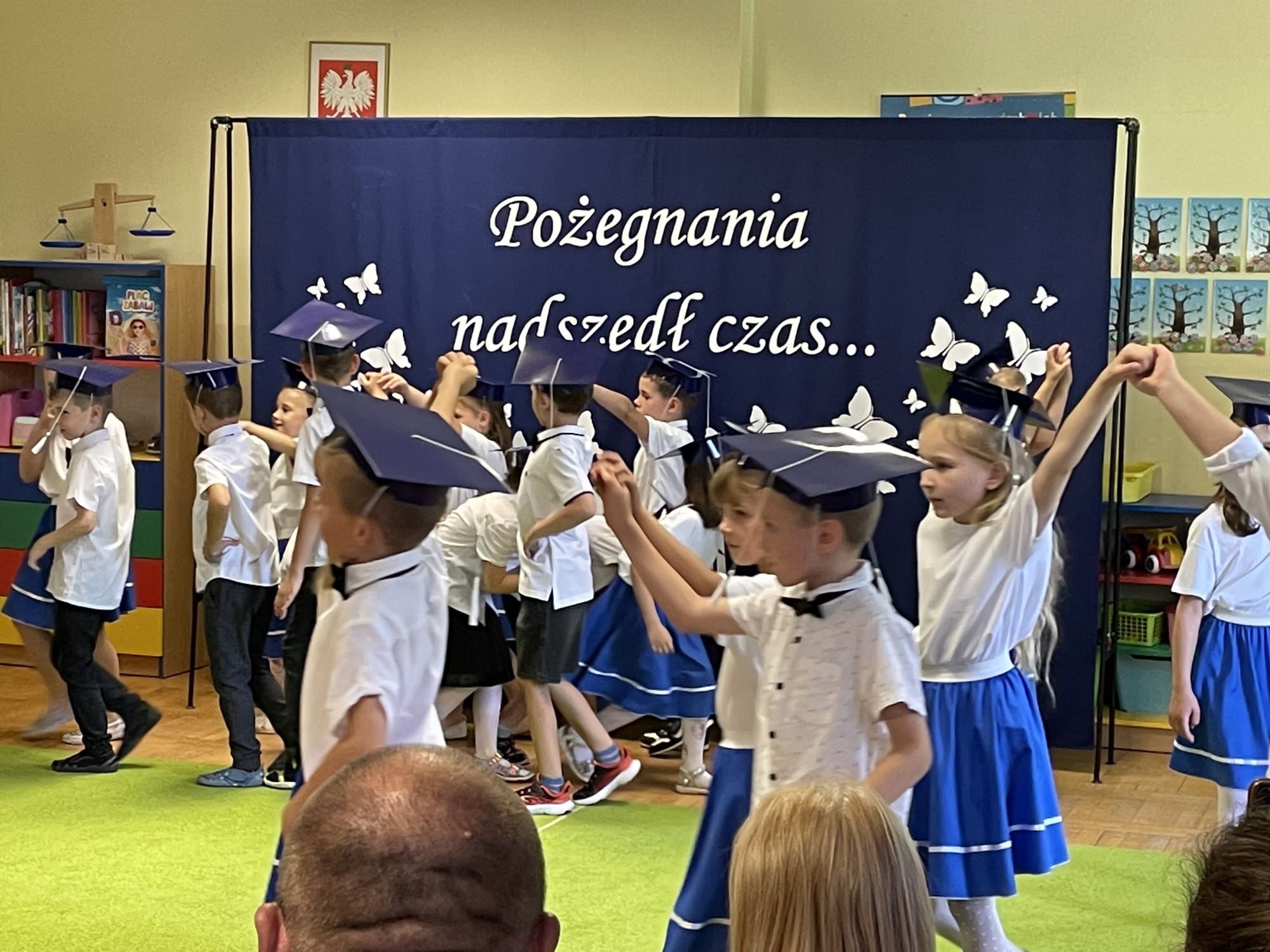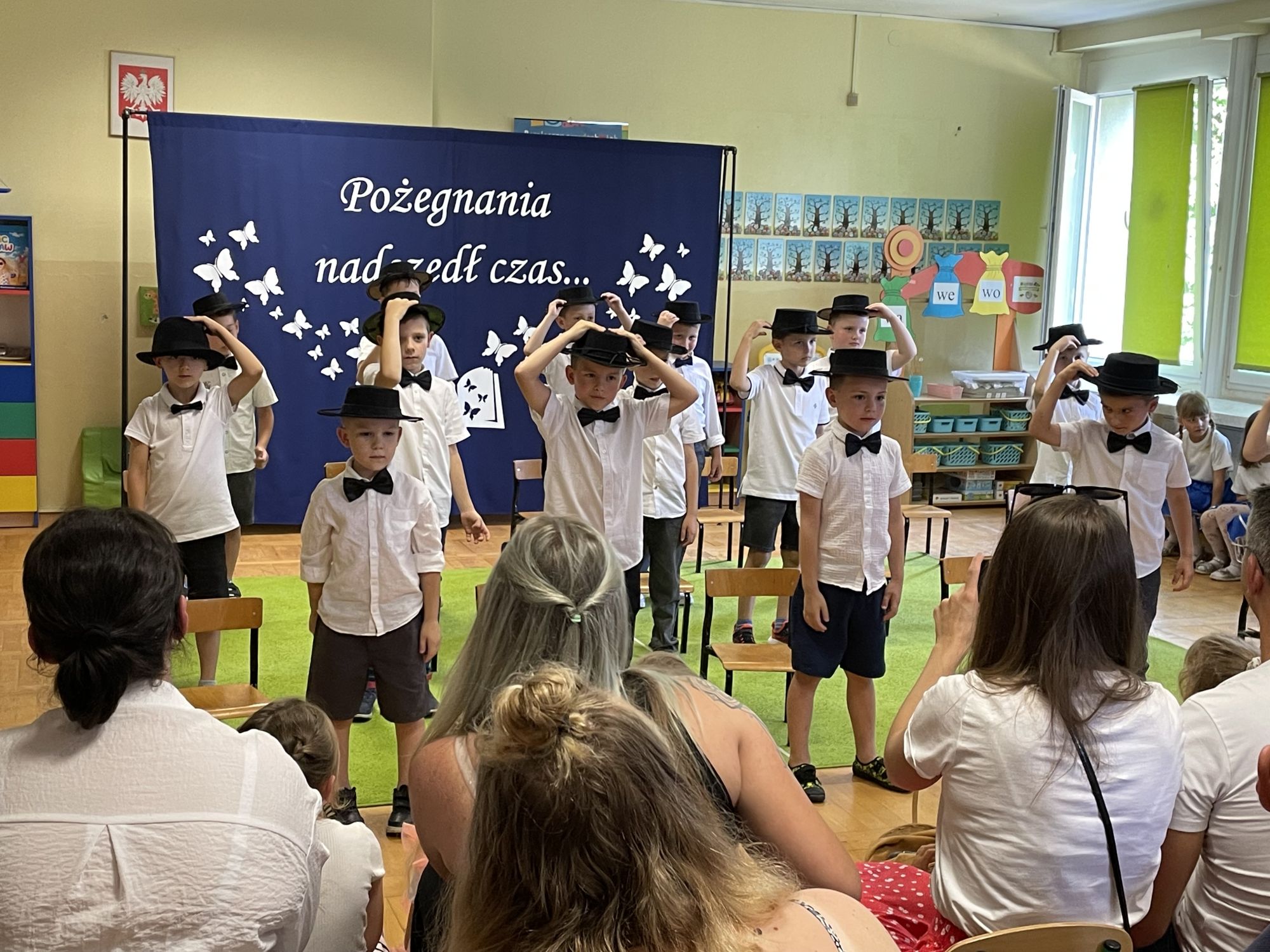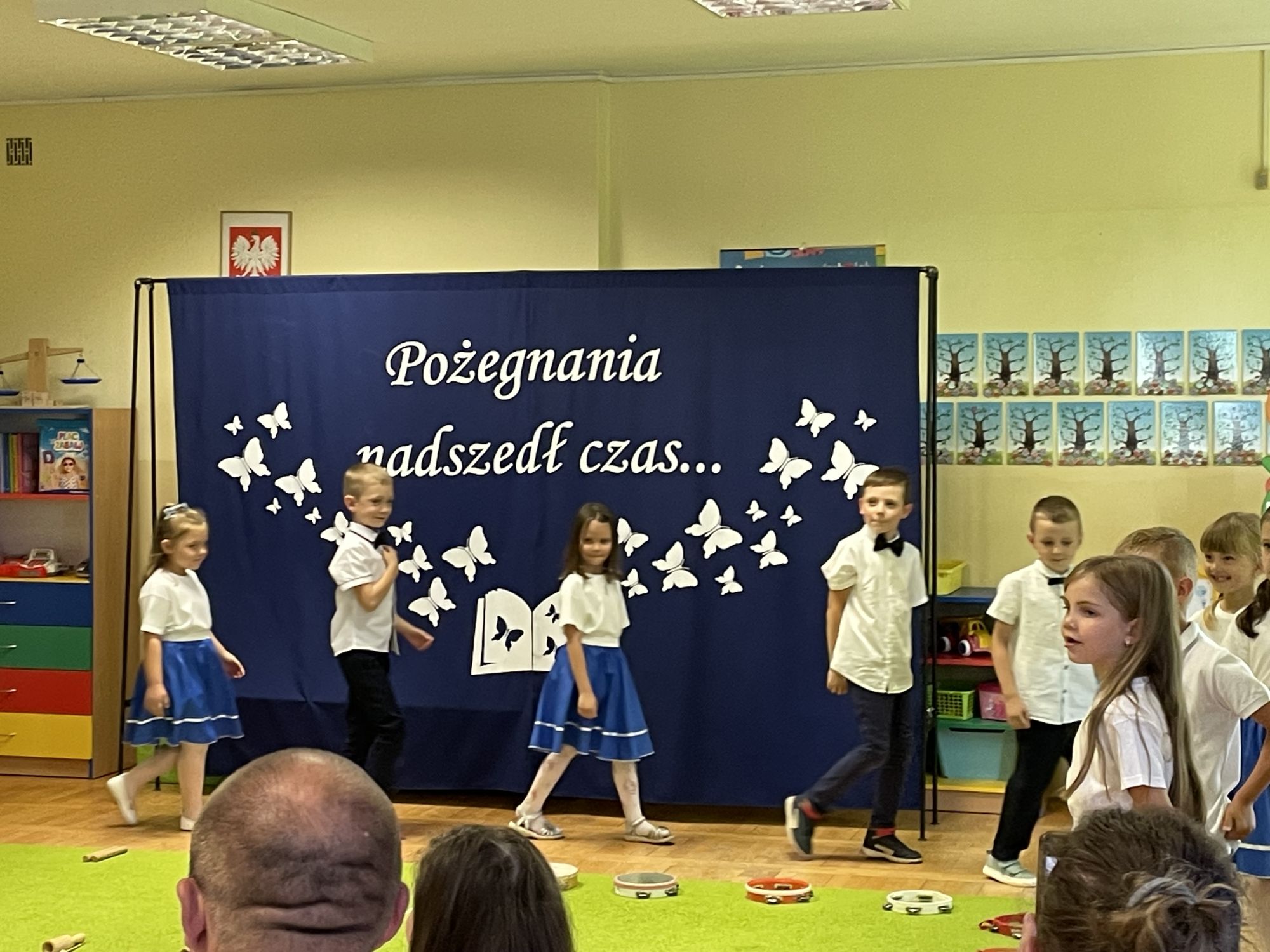 Punktem kulminacyjnym programu był tradycyjny polonez, który dzieci zatańczyły z wyjątkową gracją i skupieniem. Taniec ten stał się symbolicznym pożegnaniem z przedszkolem i pięknym zwieńczeniem wspólnie spędzonych lat.
