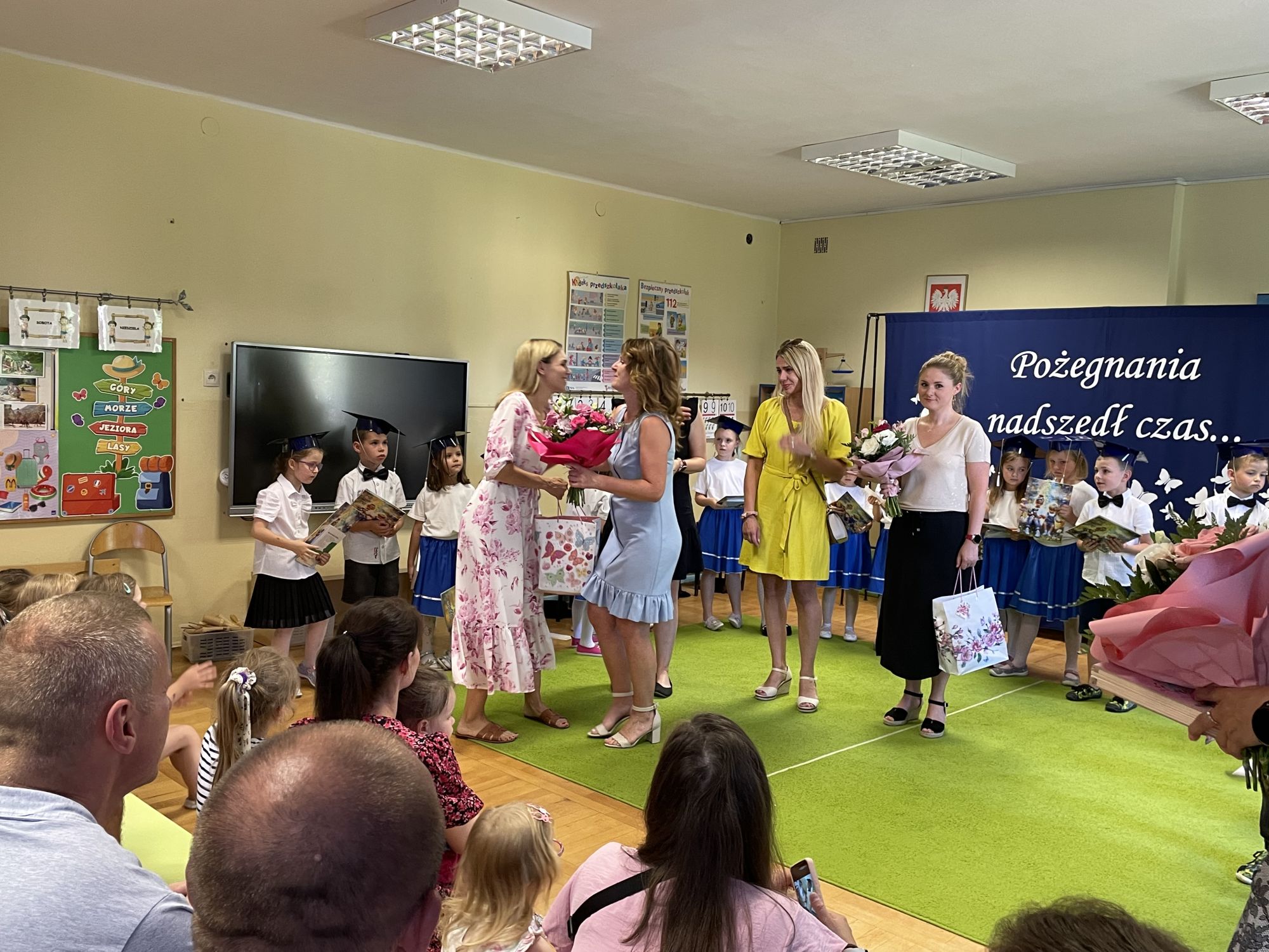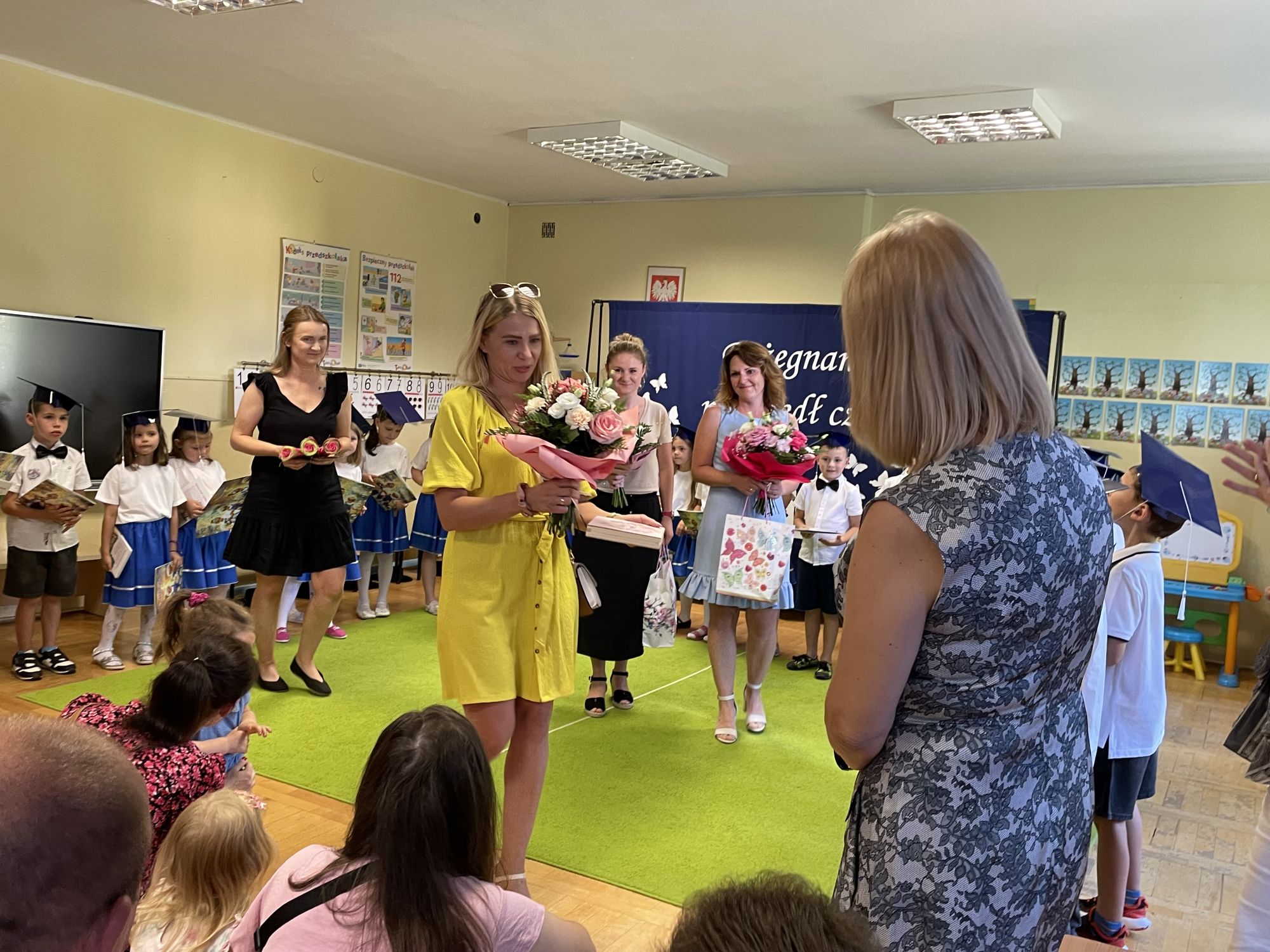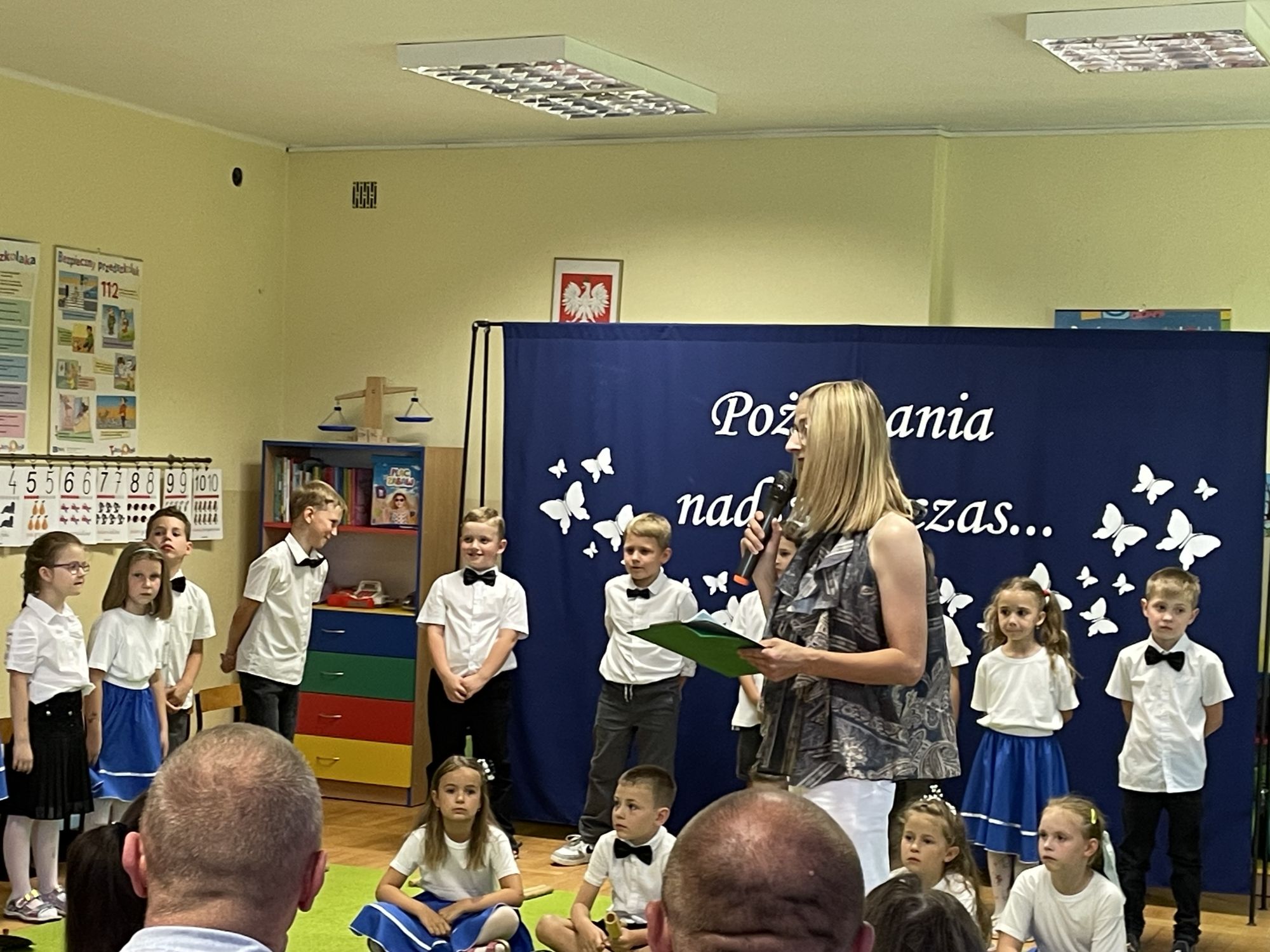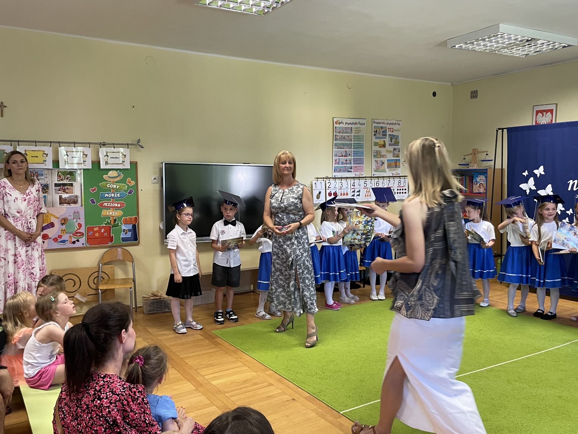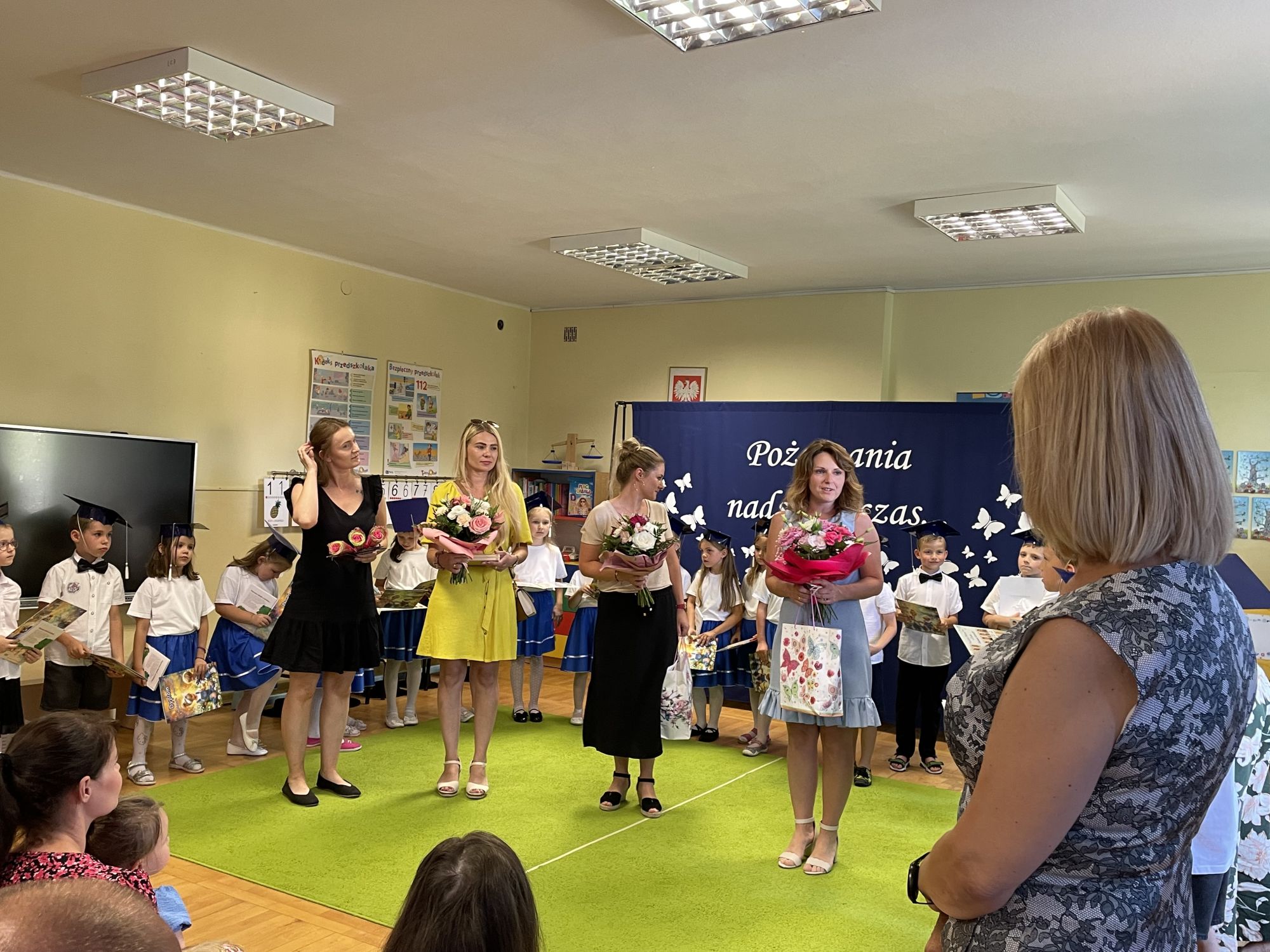 Spotkanie rozpoczęła Pani Dyrektor Ewa Dziemba, która wraz z wychowawczyniami: Panią Magdaleną Skibą, Panią Nikolą Krok i Panią Ewą Helman, serdecznie powitała wszystkich zebranych. W swoim przemówieniu Pani Dyrektor wyraziła wdzięczność wobec rodziców za ich całoroczne zaangażowanie i wsparcie, a następnie wręczyła im pamiątkowe podziękowania. Szczególne słowa uznania i podziękowania skierowała również do nauczycielek, doceniając ich trud, pasję i serce włożone w przygotowanie tej wyjątkowej uroczystości.