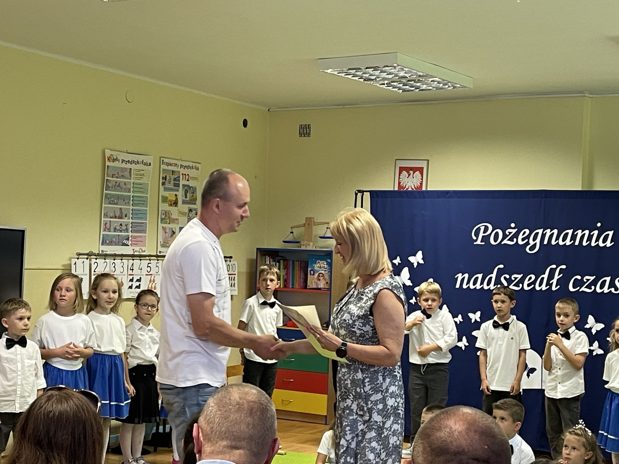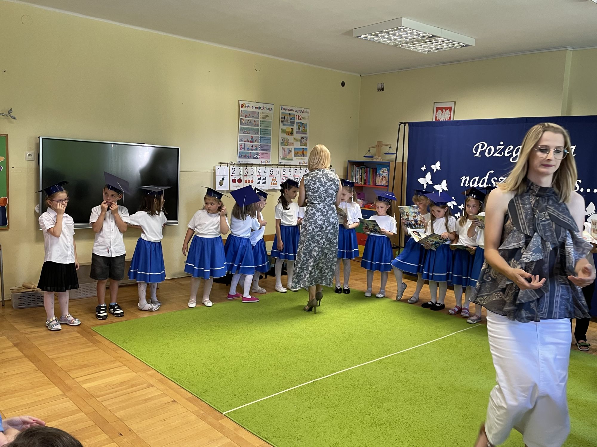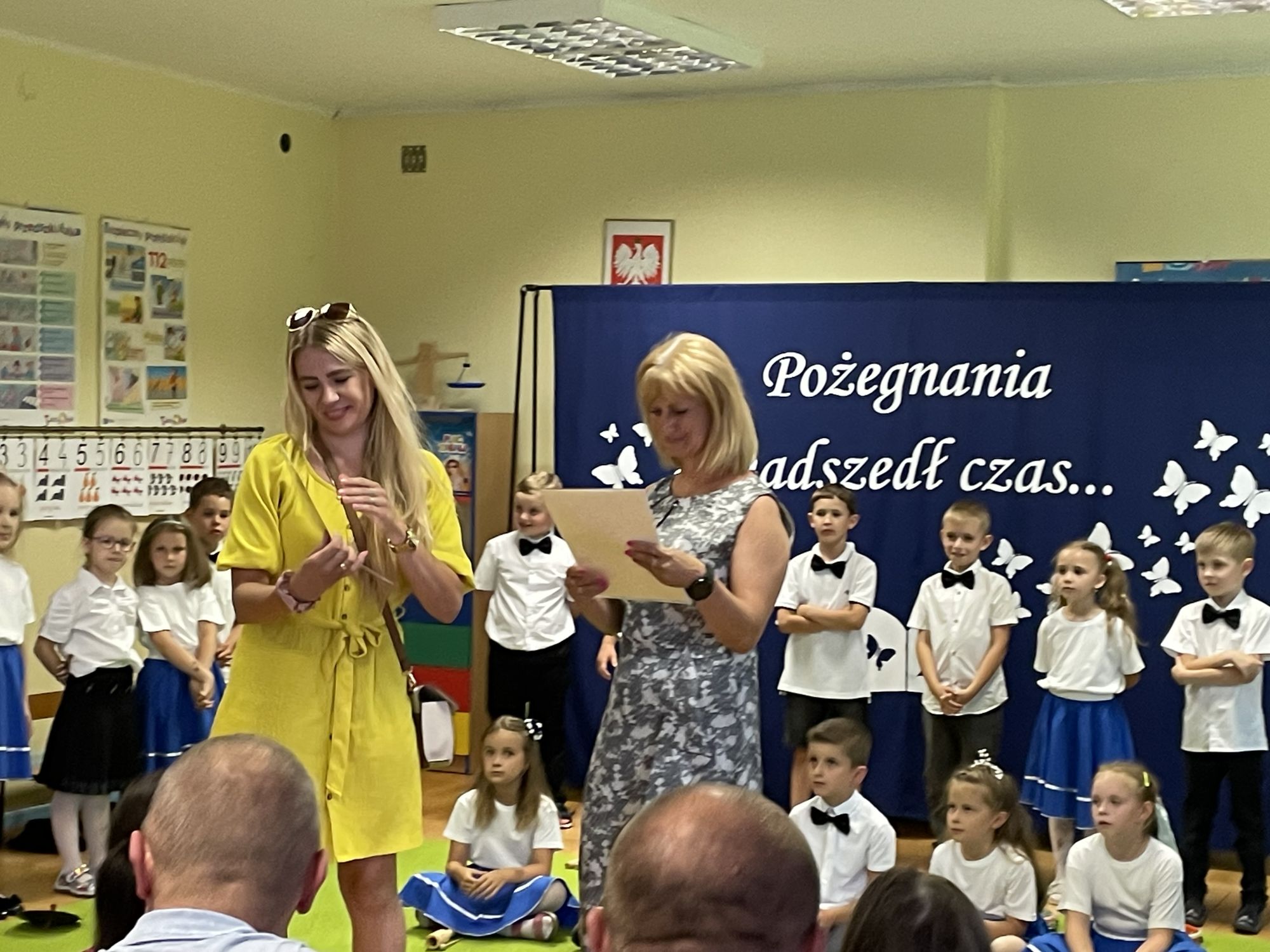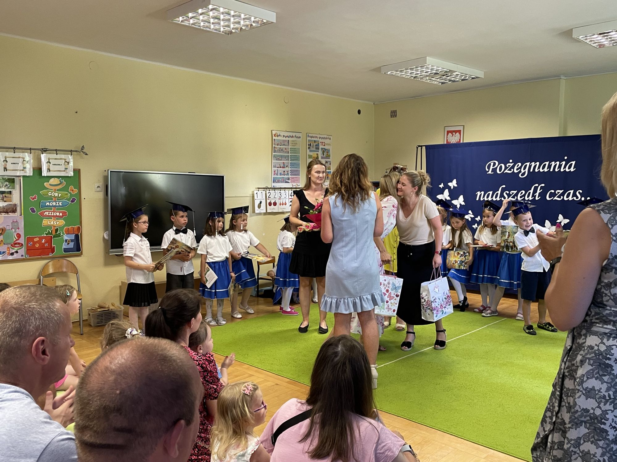 Spotkanie rozpoczęła Pani Dyrektor Ewa Dziemba, która wraz z wychowawczyniami: Panią Magdaleną Skibą, Panią Nikolą Krok i Panią Ewą Helman, serdecznie powitała wszystkich zebranych. W swoim przemówieniu Pani Dyrektor wyraziła wdzięczność wobec rodziców za ich całoroczne zaangażowanie i wsparcie, a następnie wręczyła im pamiątkowe podziękowania. Szczególne słowa uznania i podziękowania skierowała również do nauczycielek, doceniając ich trud, pasję i serce włożone w przygotowanie tej wyjątkowej uroczystości.