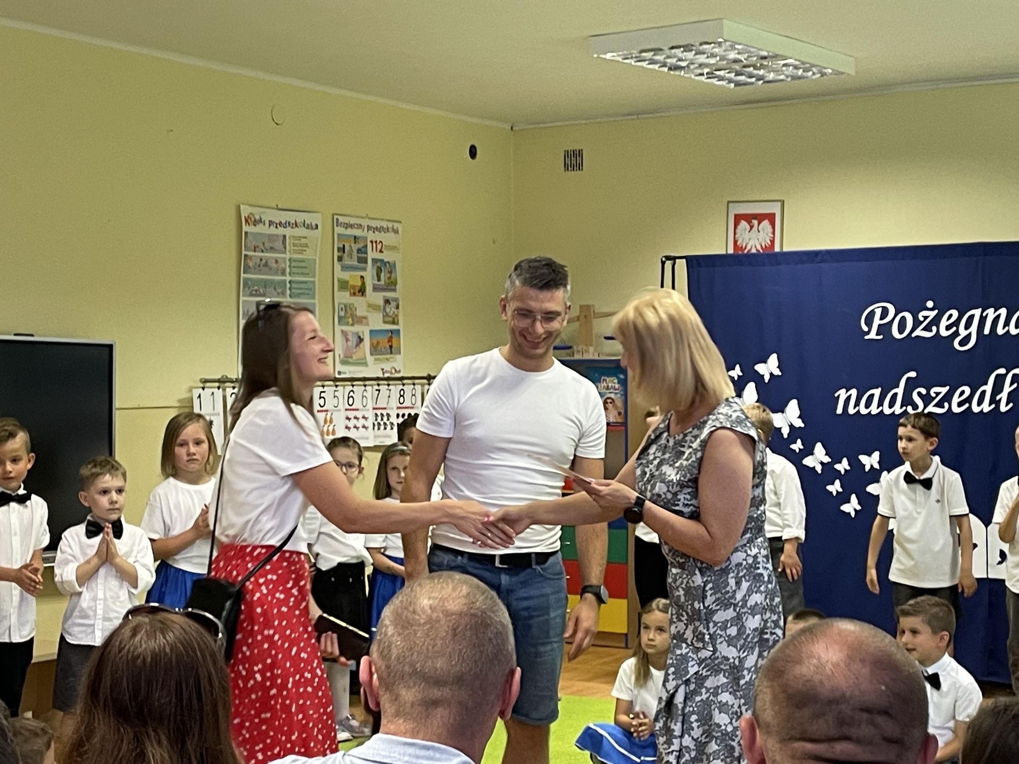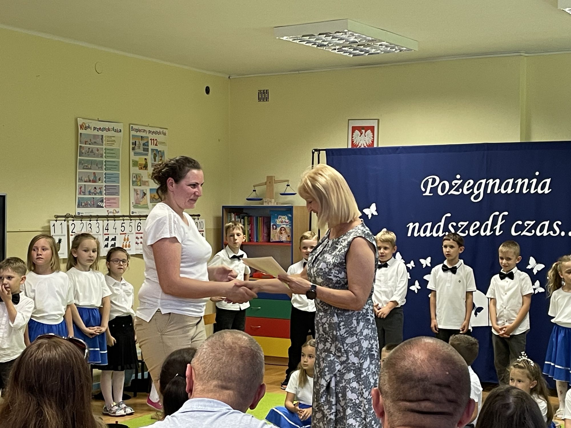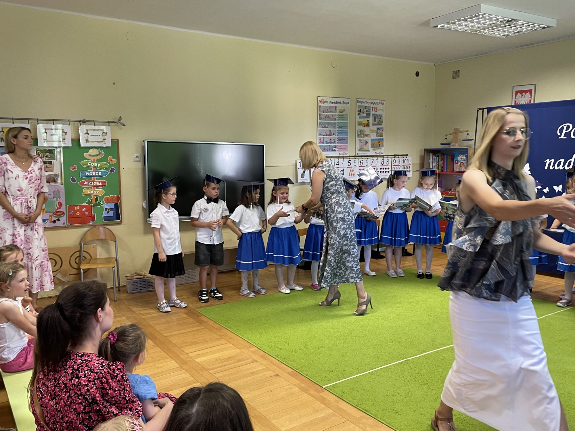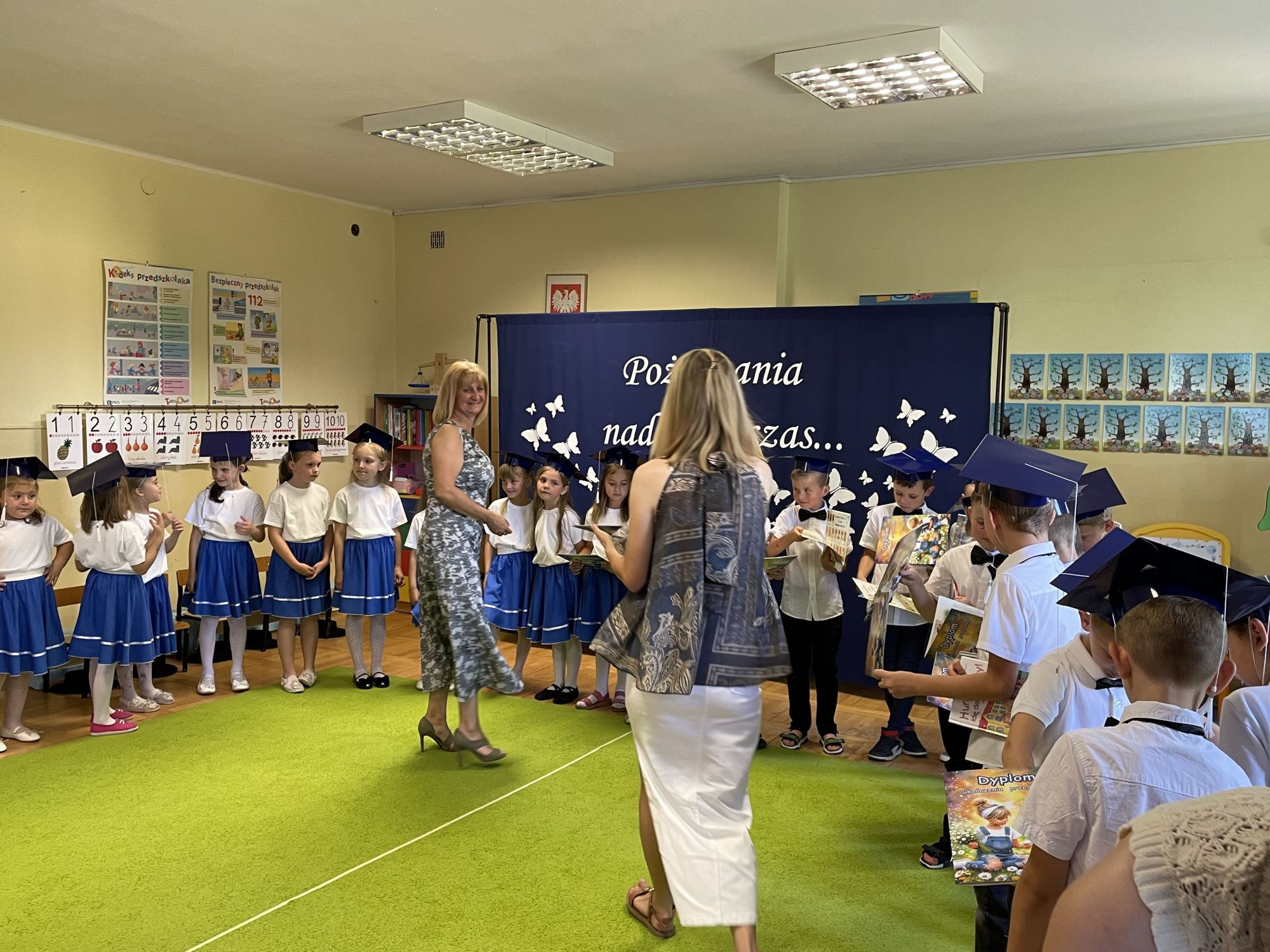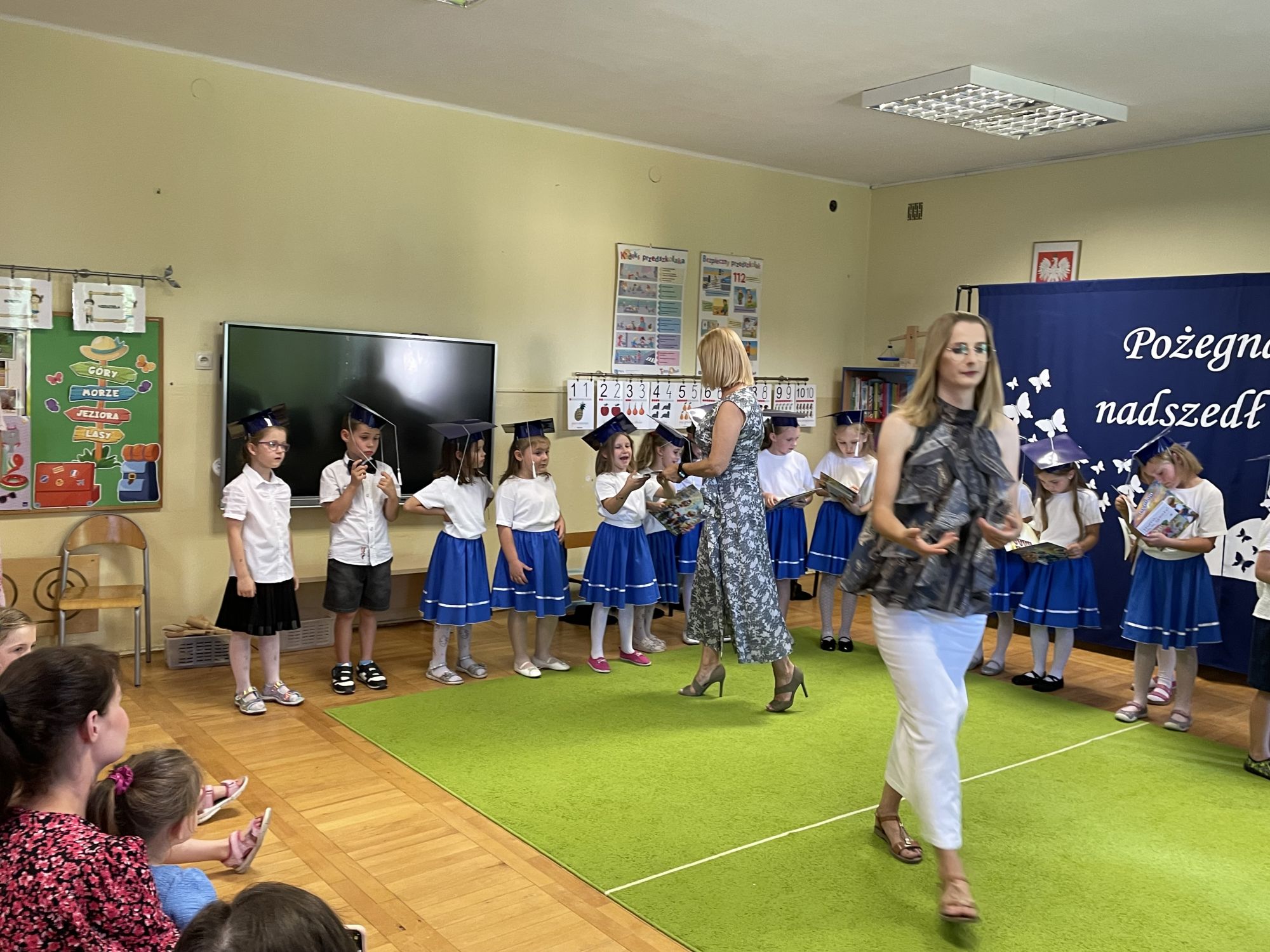 Spotkanie rozpoczęła Pani Dyrektor Ewa Dziemba, która wraz z wychowawczyniami: Panią Magdaleną Skibą, Panią Nikolą Krok i Panią Ewą Helman, serdecznie powitała wszystkich zebranych. W swoim przemówieniu Pani Dyrektor wyraziła wdzięczność wobec rodziców za ich całoroczne zaangażowanie i wsparcie, a następnie wręczyła im pamiątkowe podziękowania. Szczególne słowa uznania i podziękowania skierowała również do nauczycielek, doceniając ich trud, pasję i serce włożone w przygotowanie tej wyjątkowej uroczystości.
