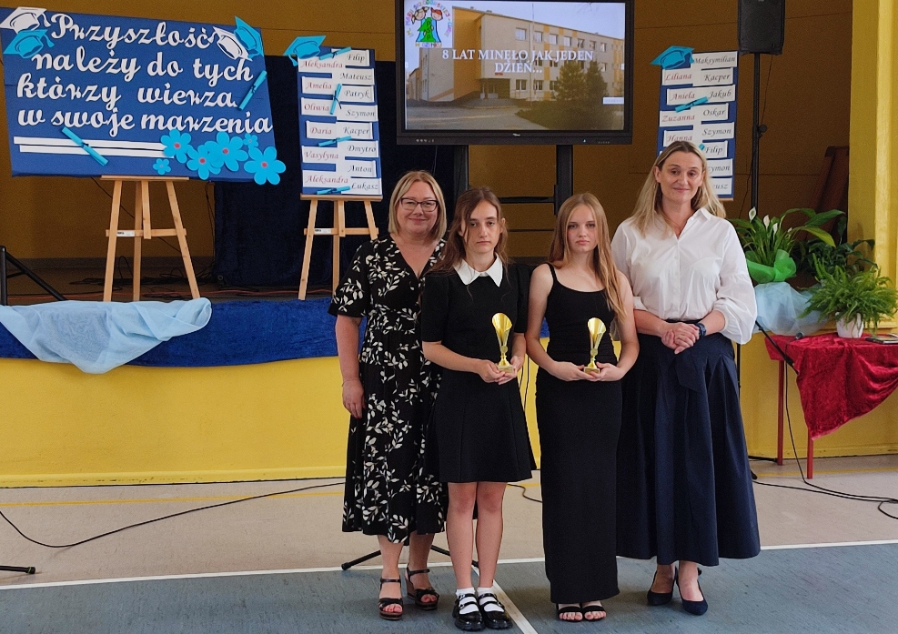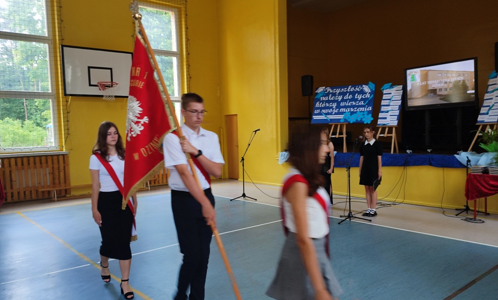 Nasi wspaniali ÓSMOKLASIŚCI pożegnali się ze szkołą. Tanecznym krokiem Poloneza weszli w nowy etap swojego życia. Towarzyszyli im rodzice i dziadkowie, nauczyciele i pracownicy szkoły. Uroczystość zaszczycili swoją obecnością Burmistrz Ozimka Mirosław Wieszołek i Ksiądz Proboszcz Marian Demarczyk. Po pięknych przemówieniach przyszli absolwenci złożyli ślubowanie na sztandar szkoły, a potem nastąpiło przekazanie sztandaru uczniom klasy siódmej. Ósmoklasiści otrzymali, oprócz świadectw, nagrody książkowe za bardzo dobre wyniki w nauce, dyplomy za osiągnięcia sportowe i za ofiarność oraz poświęcenie w szkolnym Wolontariacie. Burmistrz Mirosław Wieszołek wręczył im także stypendia naukowe. Dyrektor Małgorzata Wronowska przekazała dwie statuetki PRYMUSA PSP NR 1 W OZIMKU uczennicom: Liliannie Błażejewskiej i Aleksandrze Wiernej. Rodzice uczniów otrzymali Listy Gratulacyjne i Podziękowania, a w ich imieniu wystąpiła Pani Barbara Krawczuk, która ze wzruszeniem podziękowała za te osiem wspaniałych, wspólnych lat. Uczniowie klasy 7a podarowali śliczne upominki swoim starszym koleżankom i kolegom. Dla nich też wystąpiły uczennice z klasy 6a w żywiołowym tańcu oraz uczniowie klasy 7a w nostalgicznej piosence. Na zakończenie uczniowie klasy ósmej zagrali na gitarach i zaśpiewali piosenki, by pożegnać się ze szkołą ...śpiewająco i wzruszająco. Ósmoklasiści wręczyli kwiaty i podziękowania na ręce Pani dyrektor, kwiaty i podziękowania nauczycielom i pracownikom administracji i obsługi szkoły, ale przede wszystkim pożegnali się ze swoją długoletnią wychowawczynią, Panią Grażyną Łygą. Pani Łyga życząc swoim wychowankom powodzenia i sukcesów, powiedziała, że "na świadectwie nie ma ocen za wytrwałość i odwagę, za empatię i przyjaźń, za kreatywność i poczucie humoru, za trudne decyzje i pokorę, bo świadectwo to papier, a człowiek to opowieść!"