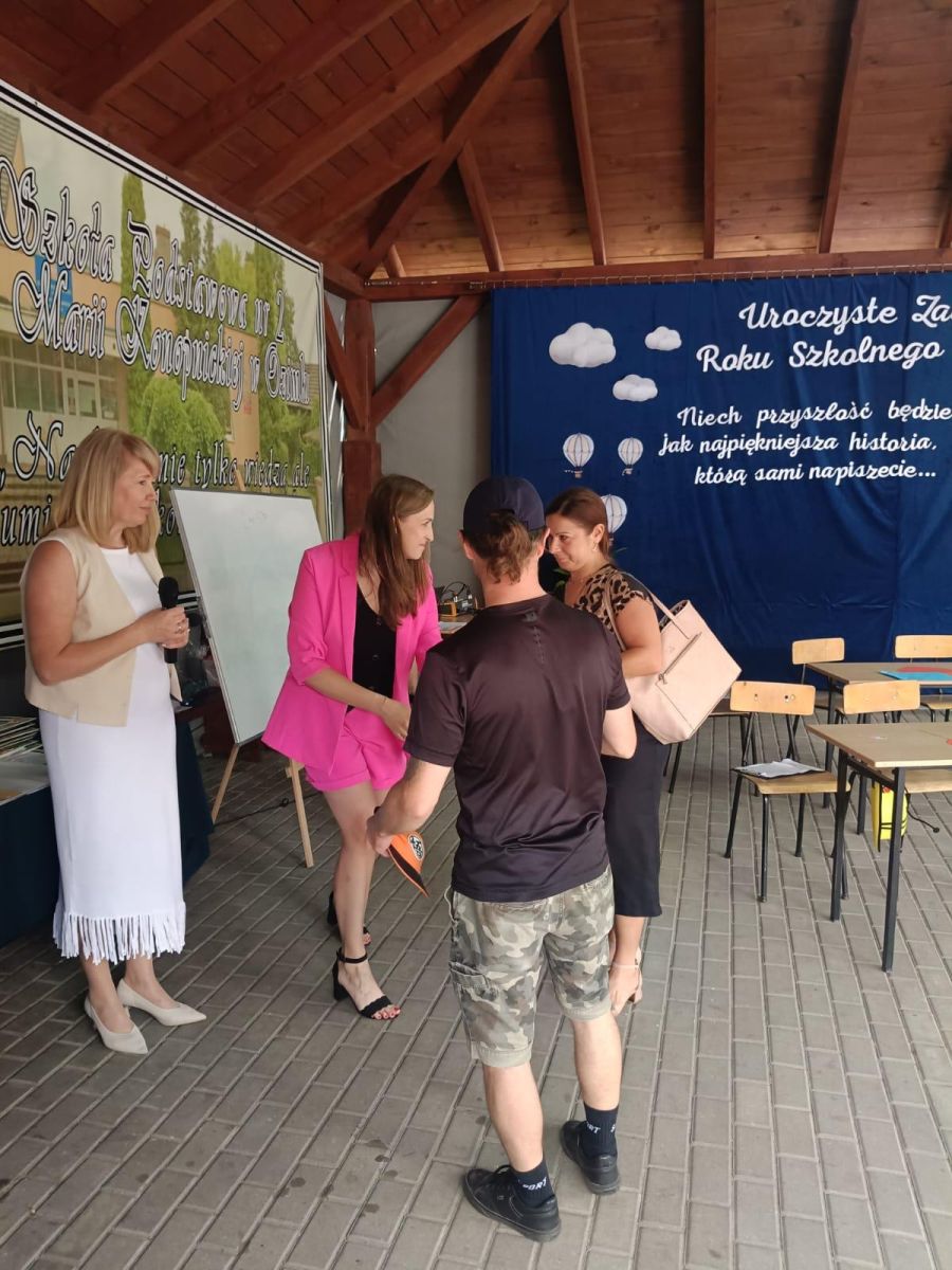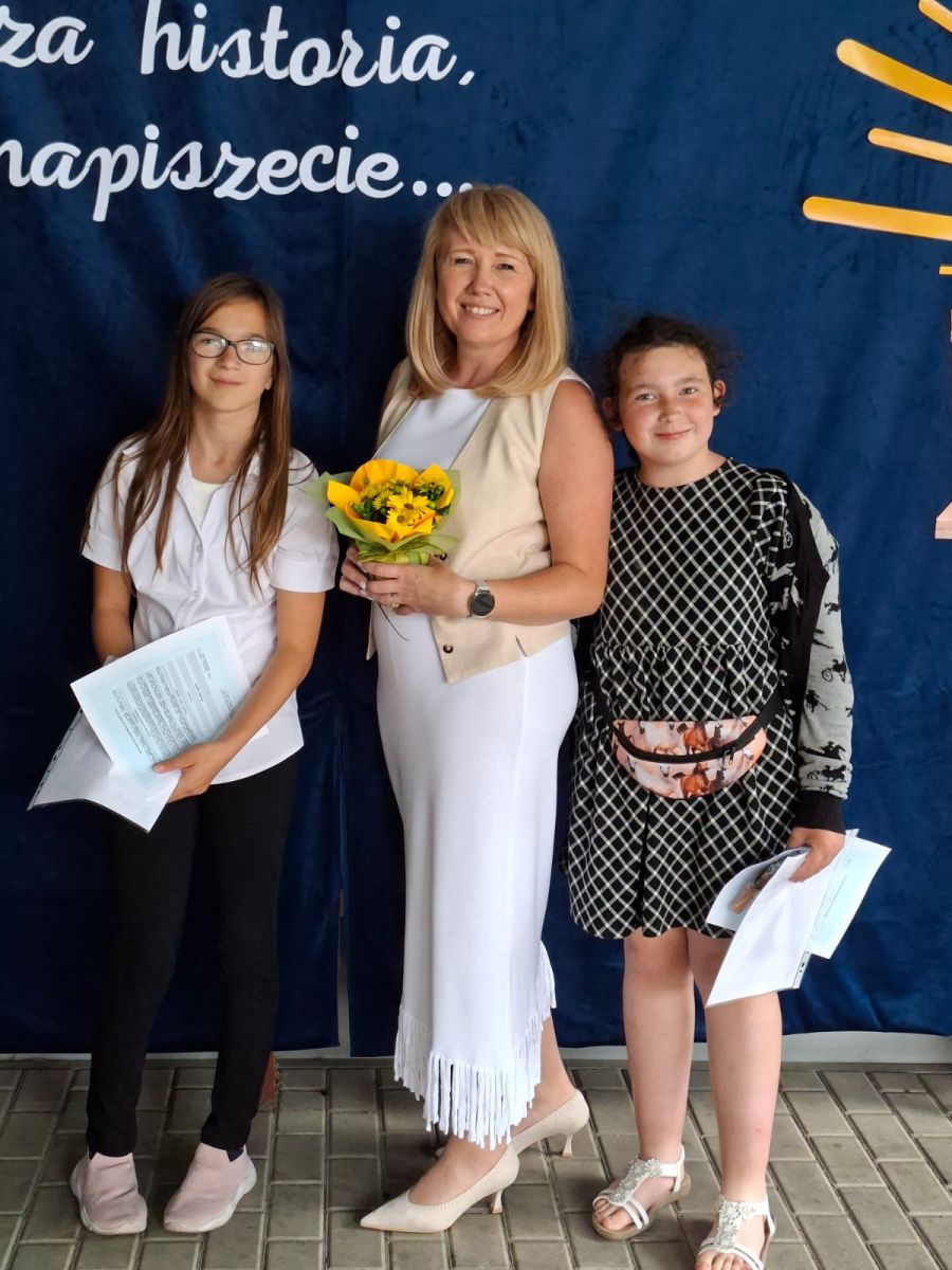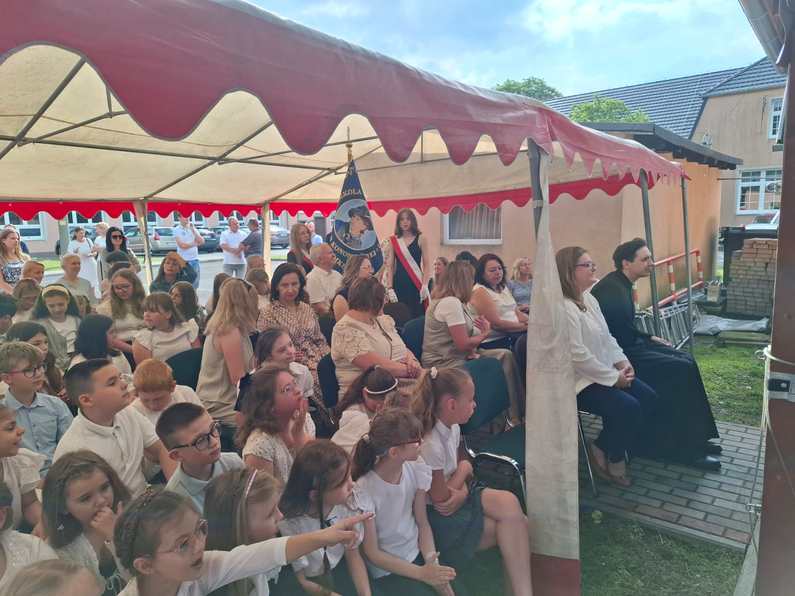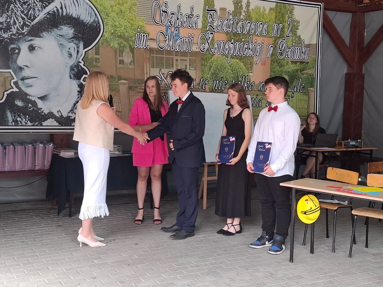 Był to wyjątkowy moment – pełen wzruszeń, uśmiechów i refleksji nad tym, co udało się wspólnie osiągnąć w minionych miesiącach. Pani dyrektor Anna Gaszczyk powitała wszystkich gości, w szczególności panią Justynę Bęben – przedstawiciela organu prowadzącego, księdza Dominika Sowę, uczniów, ich rodziców, nauczycieli oraz pracowników administracyjno-obsługowych. Następnie zaprosiła publiczność na część artystyczną przygotowaną przez ósmoklasistów. Uczniowie zaprezentowali wspomnienia z ostatnich lat swojej nauki. Nie zabrakło śmiechu, ale i chwil wzruszeń. Na zakończenie występu podziękowali nauczycielom, pracownikom szkoły oraz swoim rodzicom. Odbyła się również ceremonia przekazania sztandaru oraz wręczone zostały podziękowania za godne reprezentowanie szkoły w poczcie sztandarowym. Po części artystycznej zostały wręczone uczniom świadectwa ukończenia szkoły oraz świadectwa z wyróżnieniem wraz z bonami zasponsorowanymi przez Radę Rodziców. Najlepsi uczniowie otrzymali stypendia ufundowane przez Burmistrza Ozimka, które wręczyła pani Justyna Bęben. Pani Ewa Dorynek podziękowała uczniom klasy ósmej za zaangażowanie w wolontariat oraz uczniom klasy czwartej za przygotowywane przedstawienia teatralne. Tego dnia wręczono również podziękowania „Przyjaciołom Szkoły”, dzięki którym nasza placówka może się rozwijać, a rzeczy niemożliwe stają się możliwe. Raz jeszcze dziękujemy: Państwu Maj, panu Voloschukowi oraz panu Grzegorzowi Filipkowi. Na zakończenie pani dyrektor Anna Gaszczyk serdecznie podziękowała za współpracę organowi prowadzącemu, pracownikom szkoły, Radzie Rodziców oraz rodzicom, którzy z zaangażowaniem wspierają szkołę i chętnie podejmują inicjatywy na jej rzecz. Na koniec życzyła wszystkim udanych i bezpiecznych wakacji.