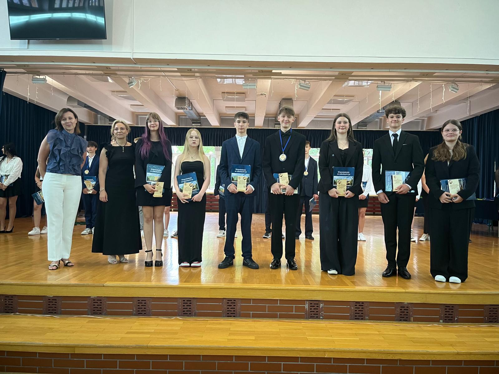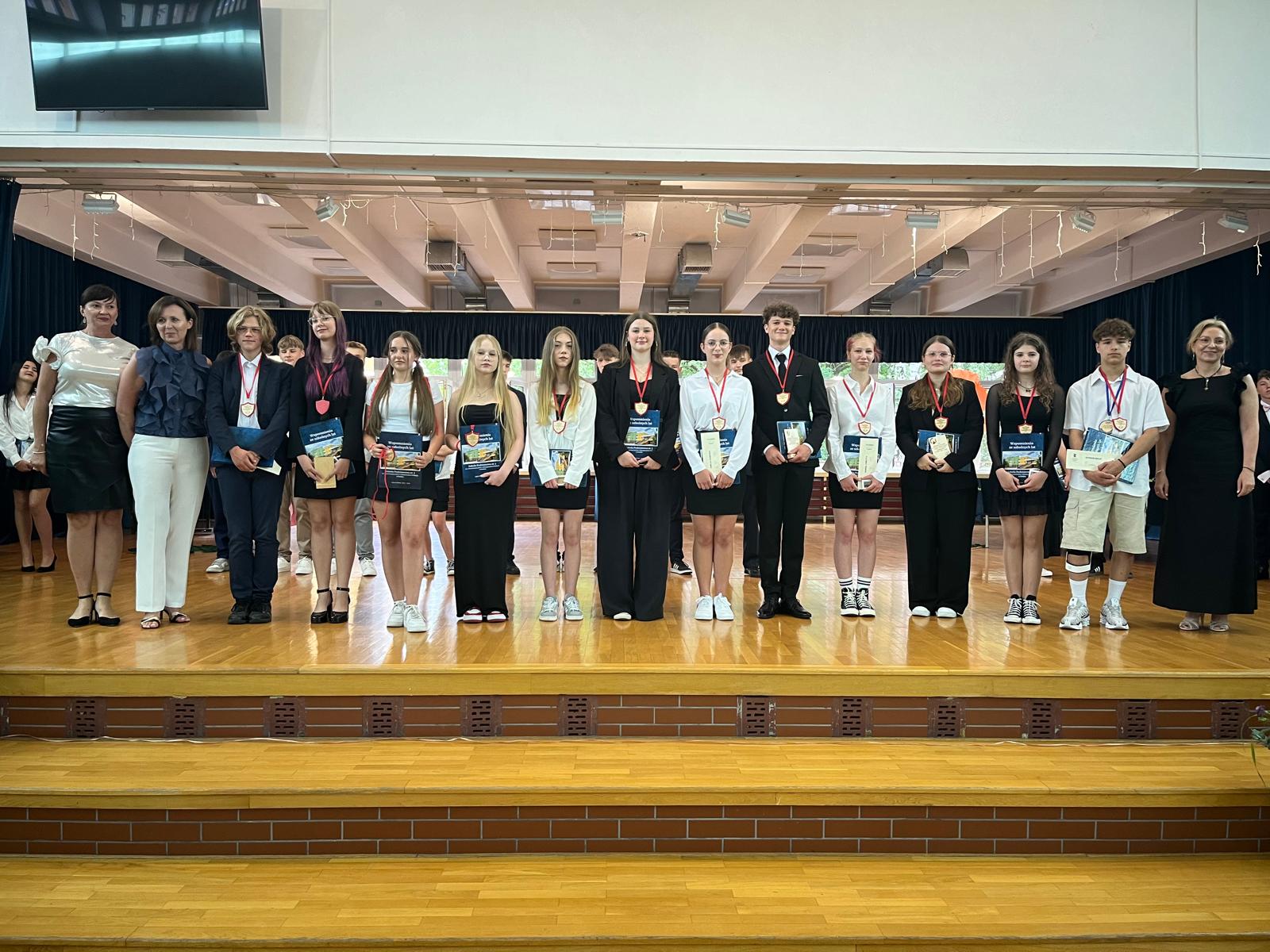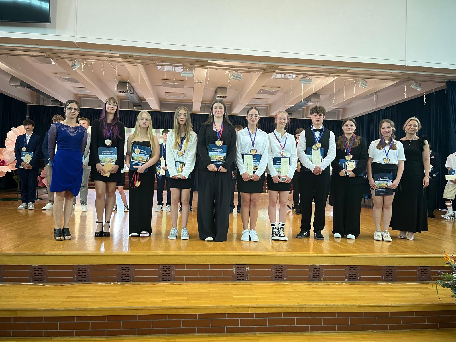 Na scenie Dyrekcja i Grono Pedagogiczne uhonorowało wyróżnionych Uczniów – Laureatów i Finalistów konkursów wojewódzkich, sportowców, artystów – którzy odebrali nagrody, medale, a także stypendia przyznane przez Urząd Miasta i Gminy Ozimek. Wyrazy uznania dla ich Rodziców osobiście złożyli Pan Burmistrz, Pani Dyrektor i Pani Wicedyrektor Małgorzata Korniak, dziękując za wsparcie i wychowanie tak wspaniałych młodych ludzi.