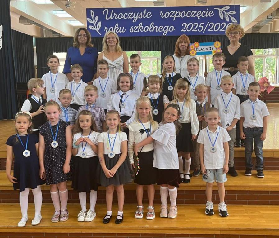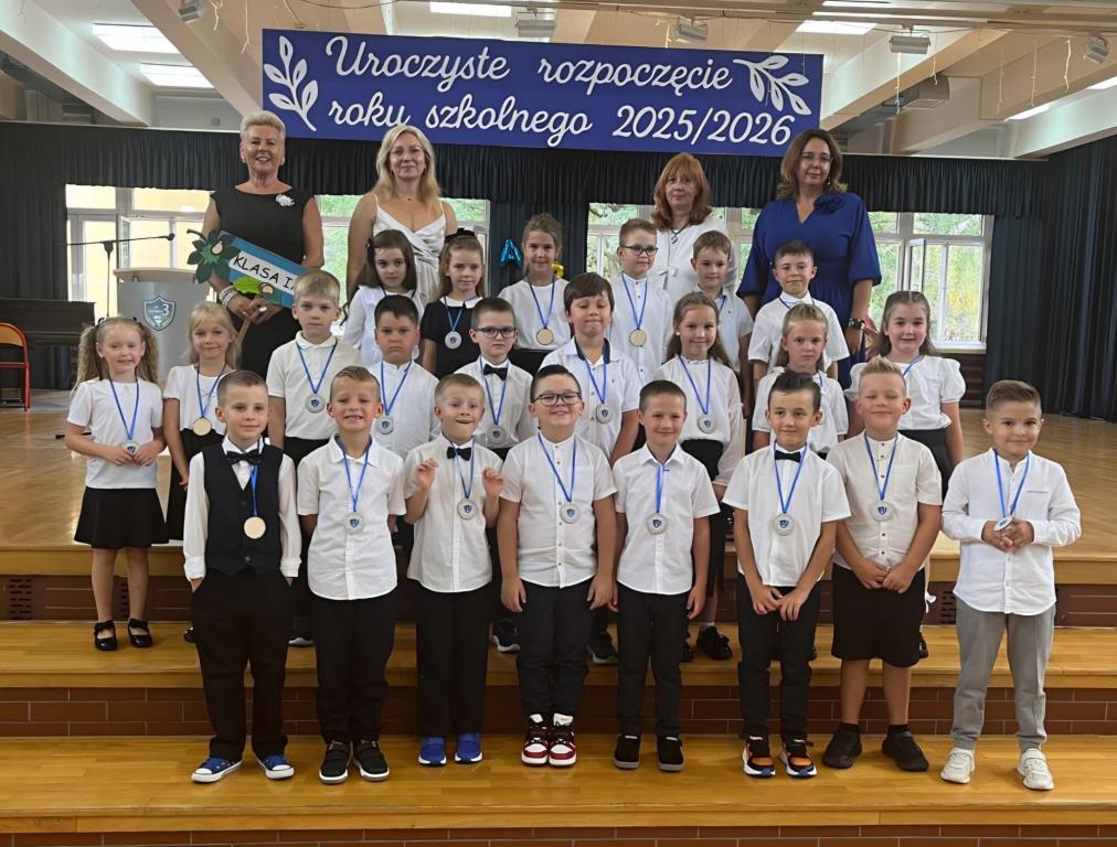 Następnie na scenę zostali zaproszeni uczniowie klas pierwszych, którzy po raz pierwszy oficjalnie rozpoczęli swoją edukacyjną przygodę w naszej szkole. Powitali ich wychowawcy: Pani Violetta Wińska (1a) oraz Pani Dorota Olearczyk (1b). Każde dziecko zostało przywitane uściskiem dłoni od Pani Dyrektor i Pań Wicedyrektor, a na pamiątkę tego dnia otrzymało pamiątkowy medal z wizerunkiem tarczy szkoły. Pamiątkowe zdjęcia każdej klasy wykonał Pan Michał Bienias.