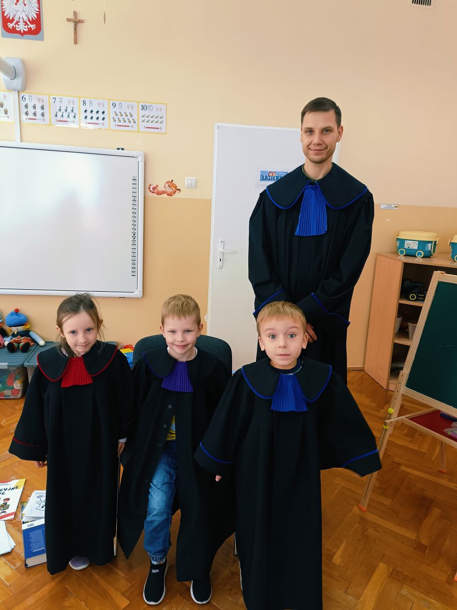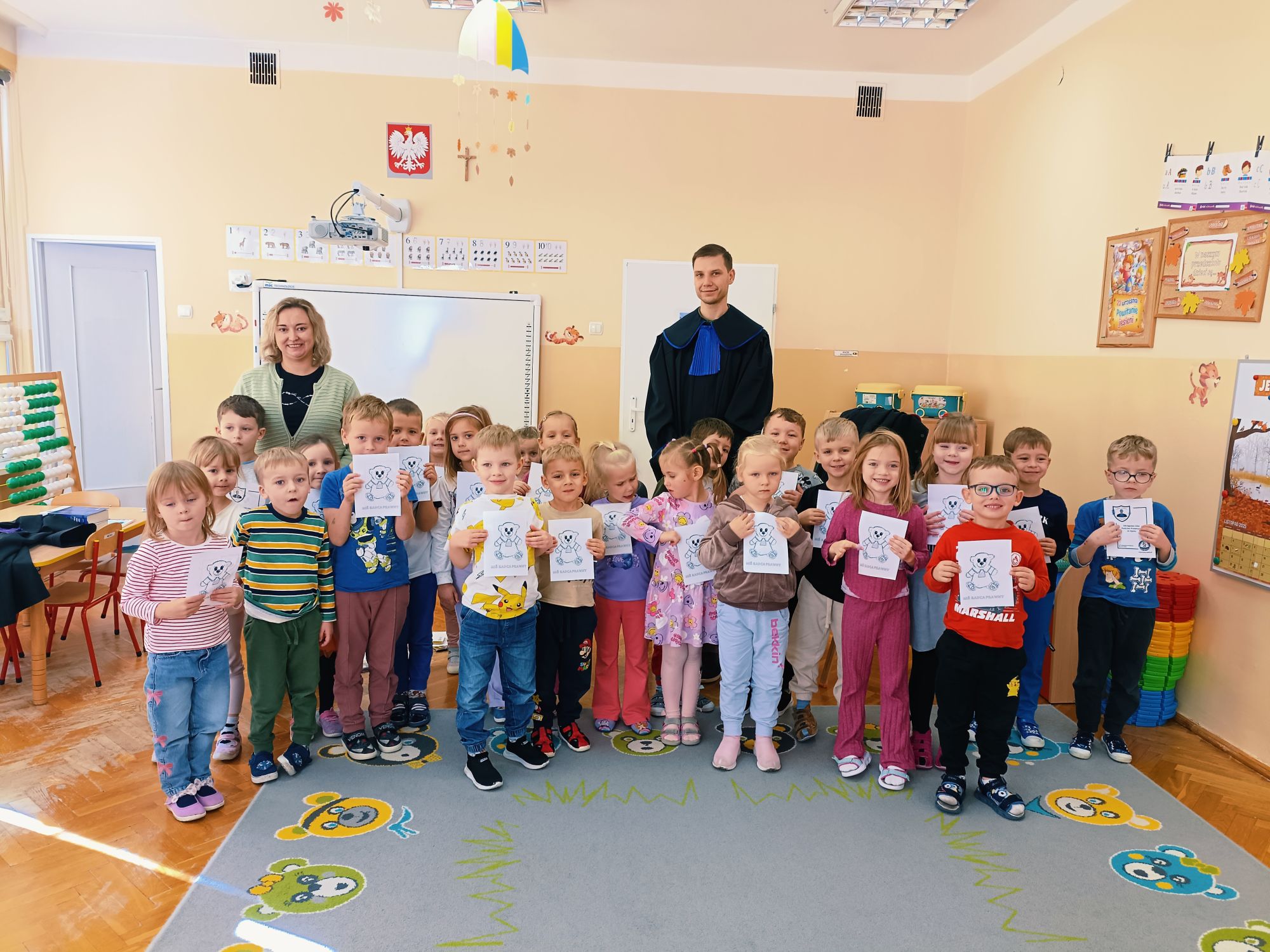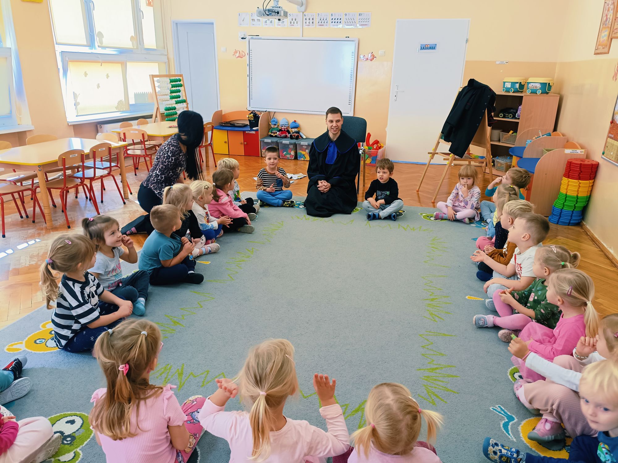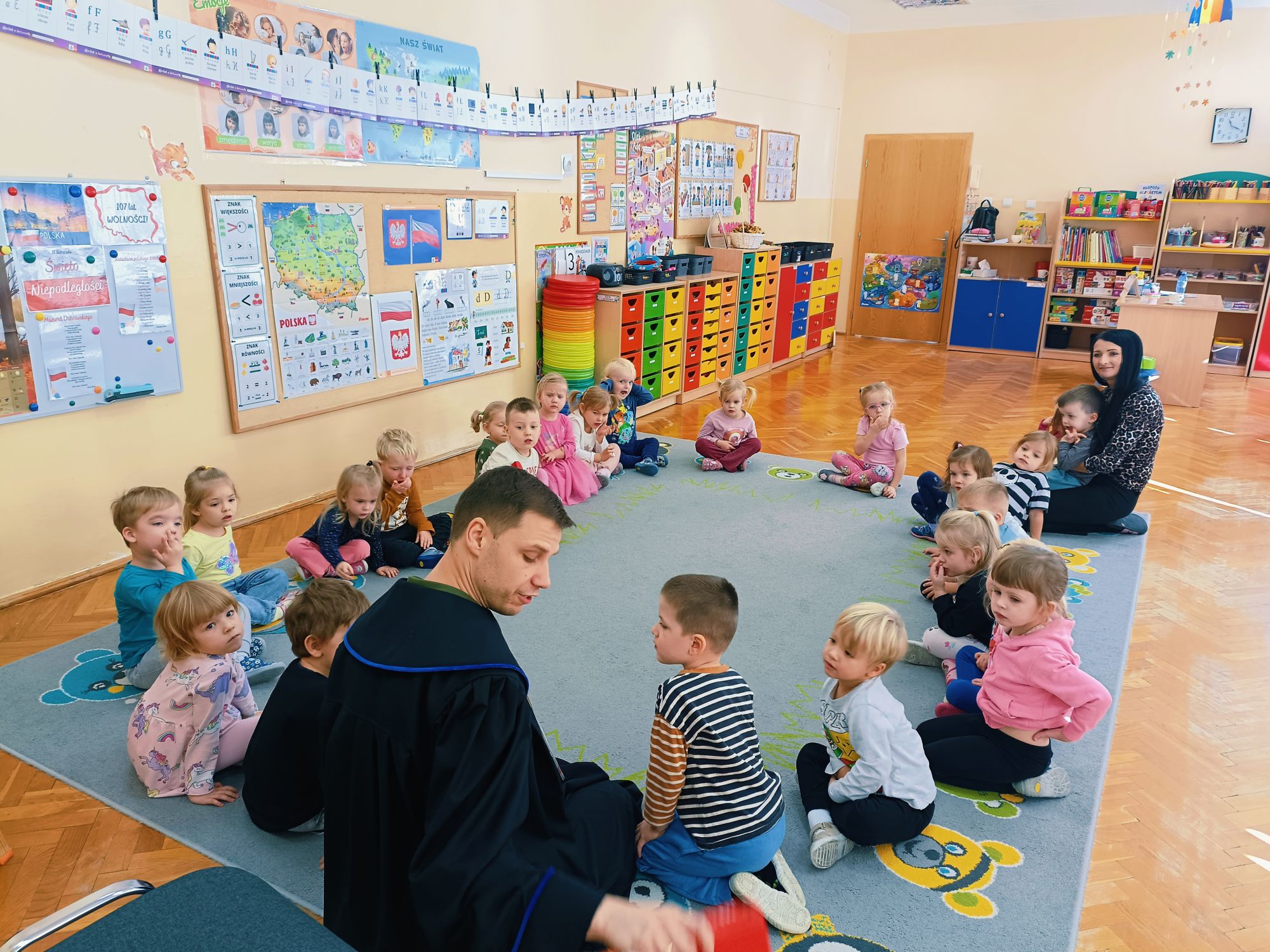Dnia 4 listopada 2025r. Przedszkole Publiczne Nr 1 w Ozimku odwiedził tato Kajetana , pan Damian Dulnik. Podczas zajęć ,dla każdej grupy naszego przedszkola przybliżył dzieciom zakres pracy radców prawnych. Sala zamieniła się w sądową wokandę. Pokazał swój urzędowy strój – toga i żabot. Nauczył dzieci rozpoznawać skład sędziowski. Przedszkolaki z zainteresowaniem przyglądały się togom i chętnie je przymierzały. Tata Kajetana pokazał dzieciom książeczki, które w atrakcyjny sposób prezentują pracę radcy prawnego. Przedszkolaki mogły dowiedzieć się do czego potrzebne są w życiu regulacje i przepisy, jakie dzieci mają obowiązki i prawa oraz jak mogą ich dochodzić. Wszystko dzięki ogólnopolskiemu projektowi z zakresu edukacji prawnej Krajowej Izby Radców Prawnych, który objął swoim zasięgiem przedszkola publiczne w całej Polsce. Na zakończenie nasz gość przygotował dzieciom drobne upominki, które sprawiły im wiele radości. Dzieci wręczyły podziękowania panu Damianowi za ciekawe i pouczające spotkanie, pełne radości i inspiracji.