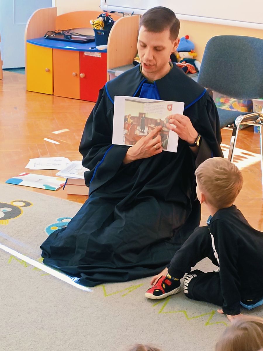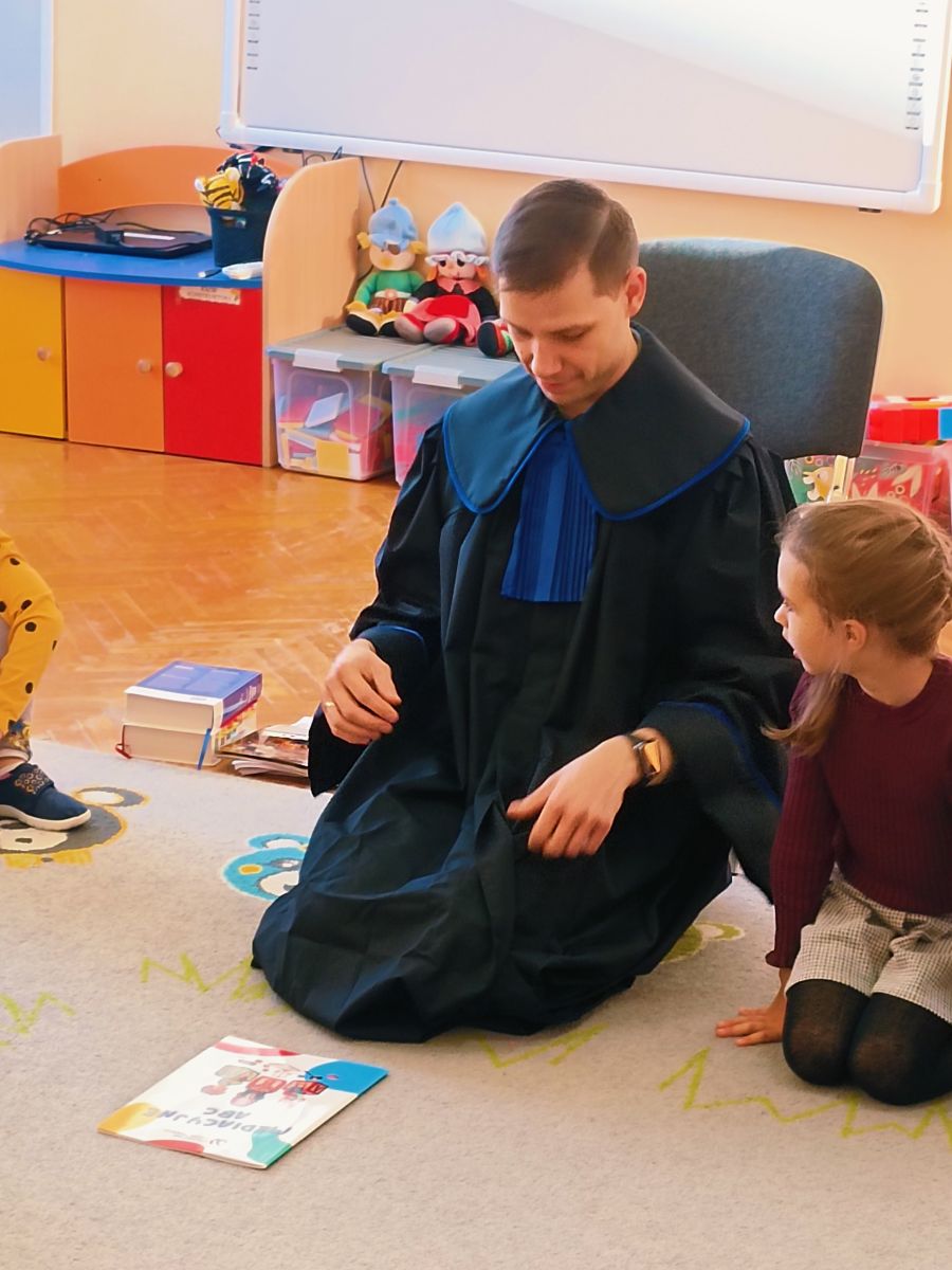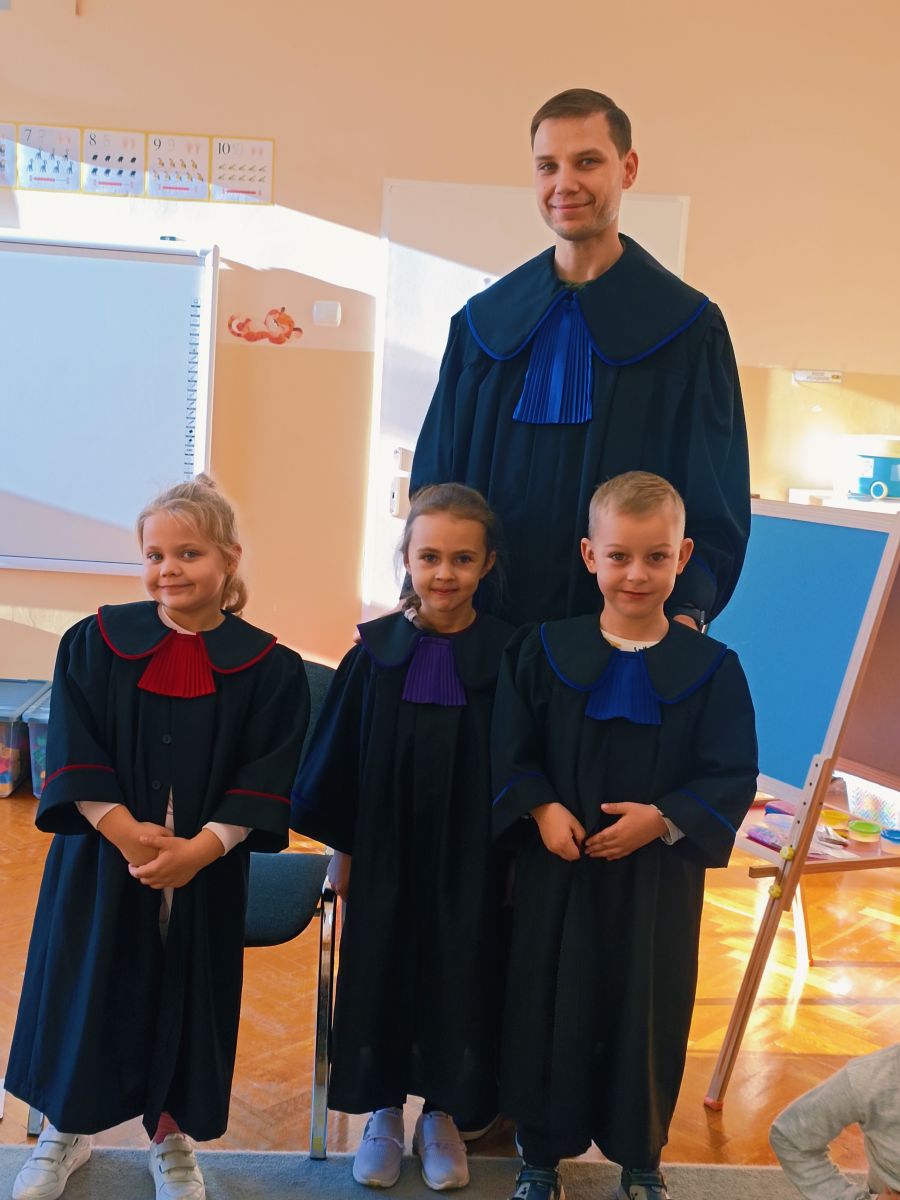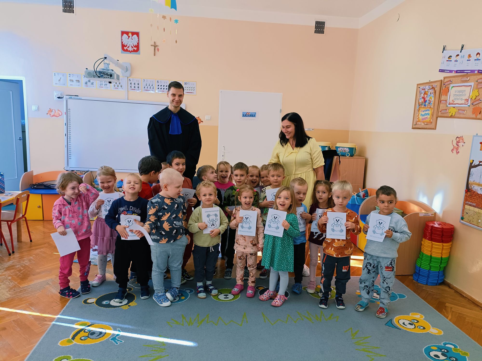 Dnia 4 listopada 2025r. Przedszkole Publiczne Nr 1 w Ozimku odwiedził tato Kajetana , pan Damian Dulnik. Podczas zajęć ,dla każdej grupy naszego przedszkola przybliżył dzieciom zakres pracy radców prawnych. Sala zamieniła się w sądową wokandę. Pokazał swój urzędowy strój – toga i żabot. Nauczył dzieci rozpoznawać skład sędziowski. Przedszkolaki z zainteresowaniem przyglądały się togom i chętnie je przymierzały. Tata Kajetana pokazał dzieciom książeczki, które w atrakcyjny sposób prezentują pracę radcy prawnego. Przedszkolaki mogły dowiedzieć się do czego potrzebne są w życiu regulacje i przepisy, jakie dzieci mają obowiązki i prawa oraz jak mogą ich dochodzić. Wszystko dzięki ogólnopolskiemu projektowi z zakresu edukacji prawnej Krajowej Izby Radców Prawnych, który objął swoim zasięgiem przedszkola publiczne w całej Polsce. Na zakończenie nasz gość przygotował dzieciom drobne upominki, które sprawiły im wiele radości. Dzieci wręczyły podziękowania panu Damianowi za ciekawe i pouczające spotkanie, pełne radości i inspiracji.
