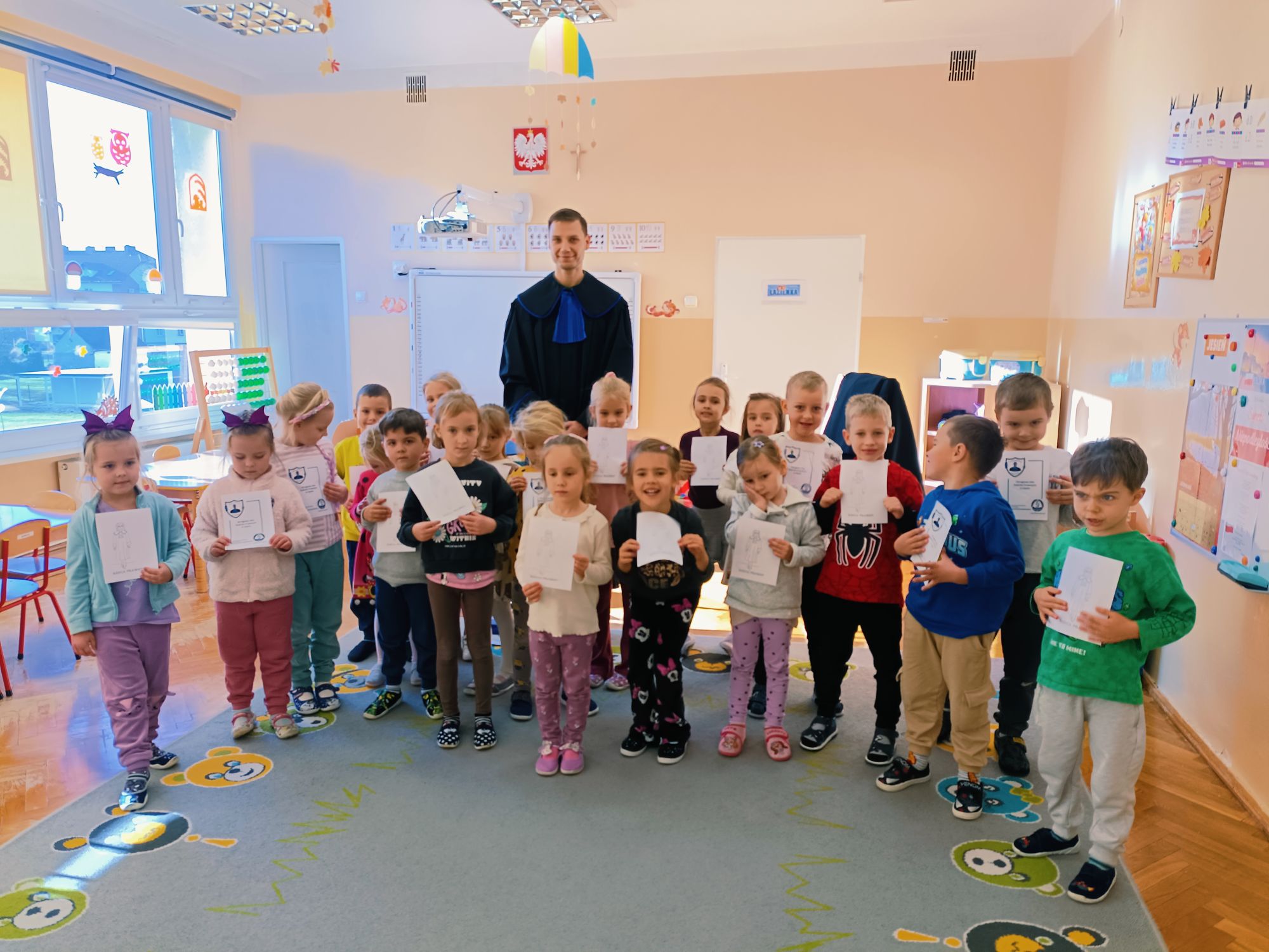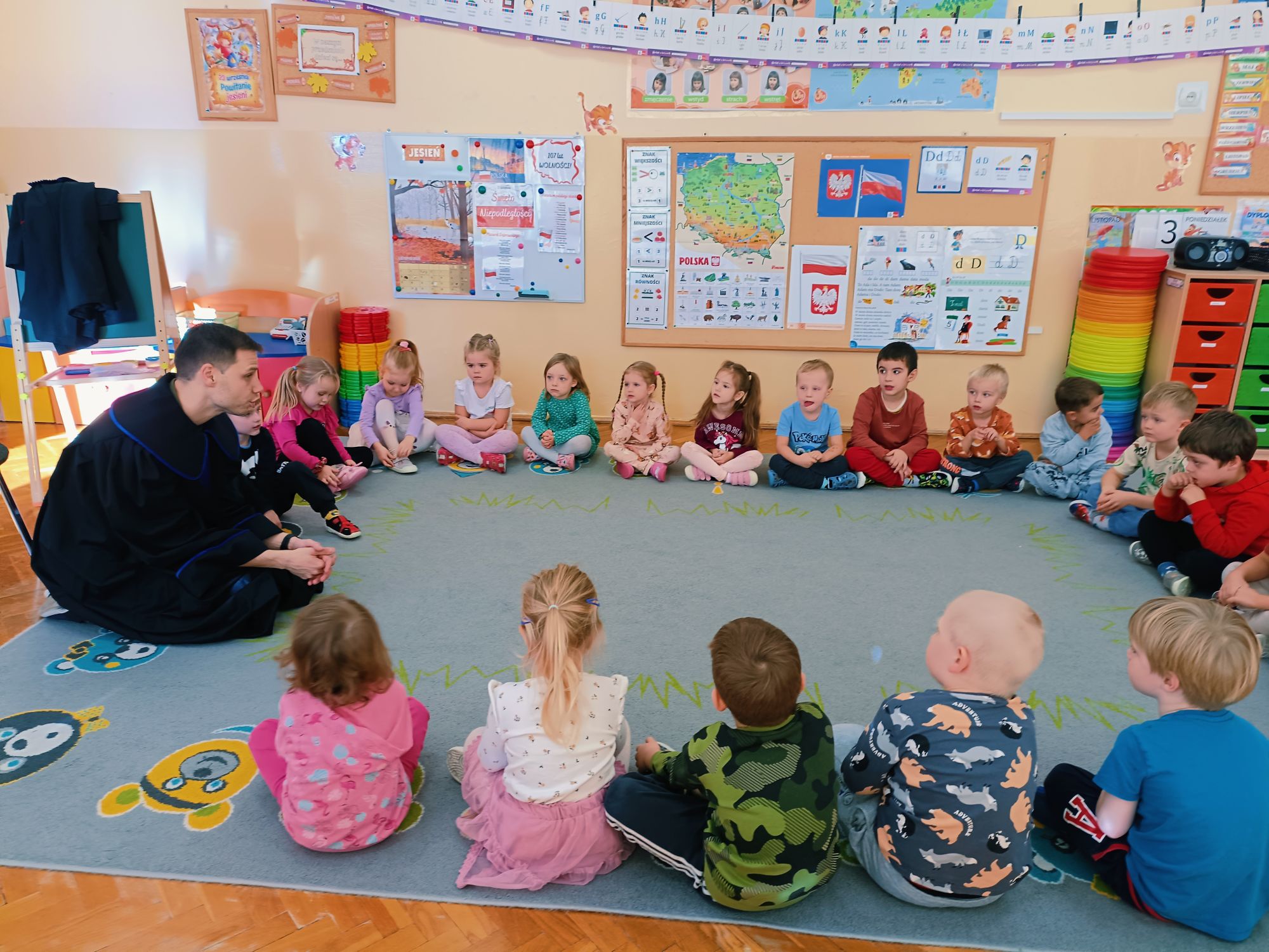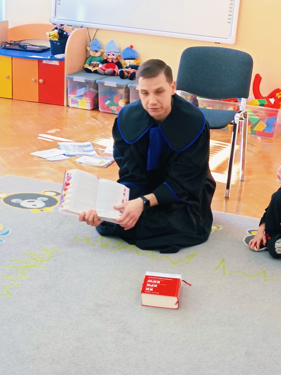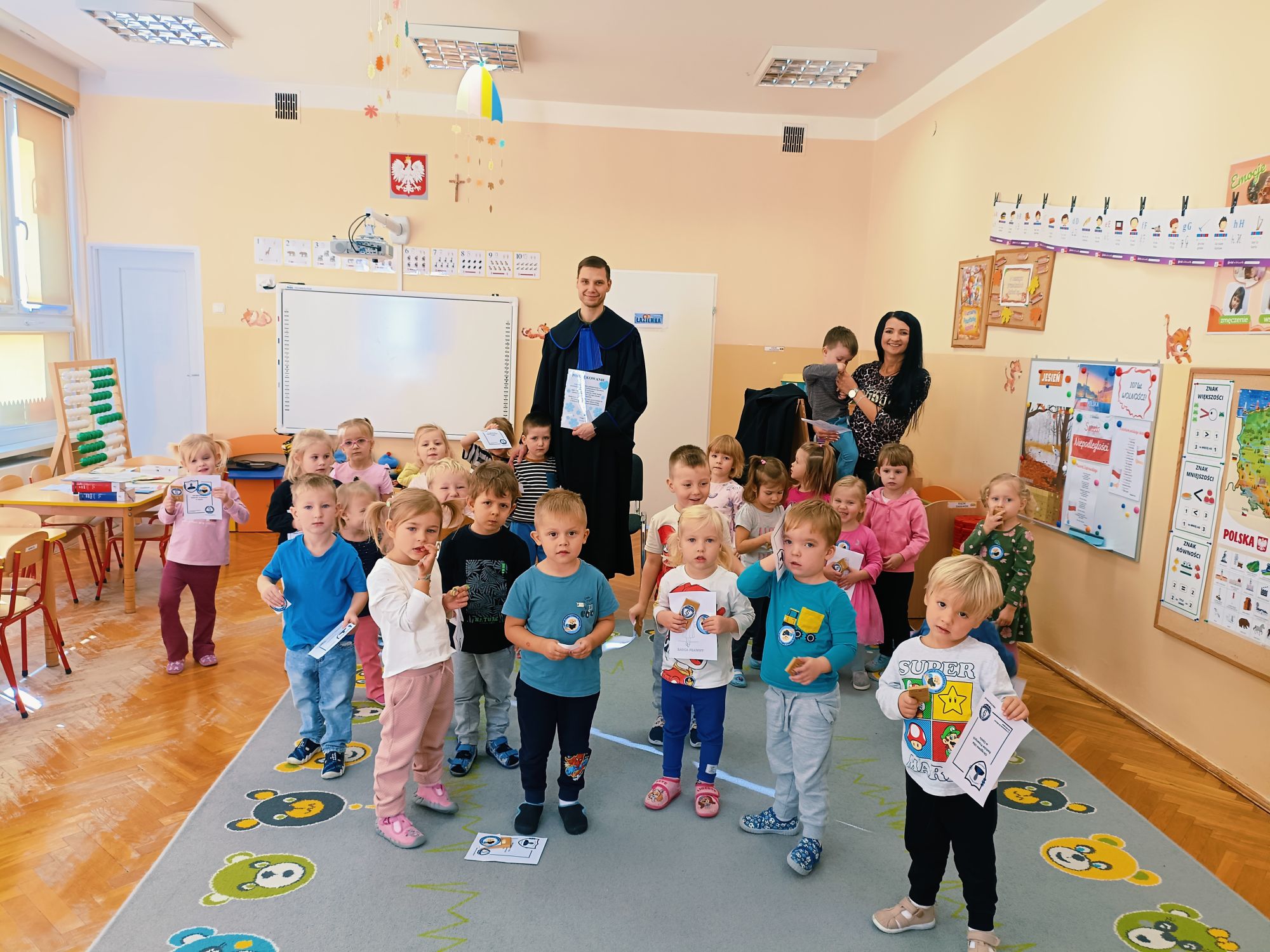 Dnia 4 listopada 2025r. Przedszkole Publiczne Nr 1 w Ozimku odwiedził tato Kajetana , pan Damian Dulnik. Podczas zajęć ,dla każdej grupy naszego przedszkola przybliżył dzieciom zakres pracy radców prawnych. Sala zamieniła się w sądową wokandę. Pokazał swój urzędowy strój – toga i żabot. Nauczył dzieci rozpoznawać skład sędziowski. Przedszkolaki z zainteresowaniem przyglądały się togom i chętnie je przymierzały. Tata Kajetana pokazał dzieciom książeczki, które w atrakcyjny sposób prezentują pracę radcy prawnego. Przedszkolaki mogły dowiedzieć się do czego potrzebne są w życiu regulacje i przepisy, jakie dzieci mają obowiązki i prawa oraz jak mogą ich dochodzić. Wszystko dzięki ogólnopolskiemu projektowi z zakresu edukacji prawnej Krajowej Izby Radców Prawnych, który objął swoim zasięgiem przedszkola publiczne w całej Polsce. Na zakończenie nasz gość przygotował dzieciom drobne upominki, które sprawiły im wiele radości. Dzieci wręczyły podziękowania panu Damianowi za ciekawe i pouczające spotkanie, pełne radości i inspiracji.