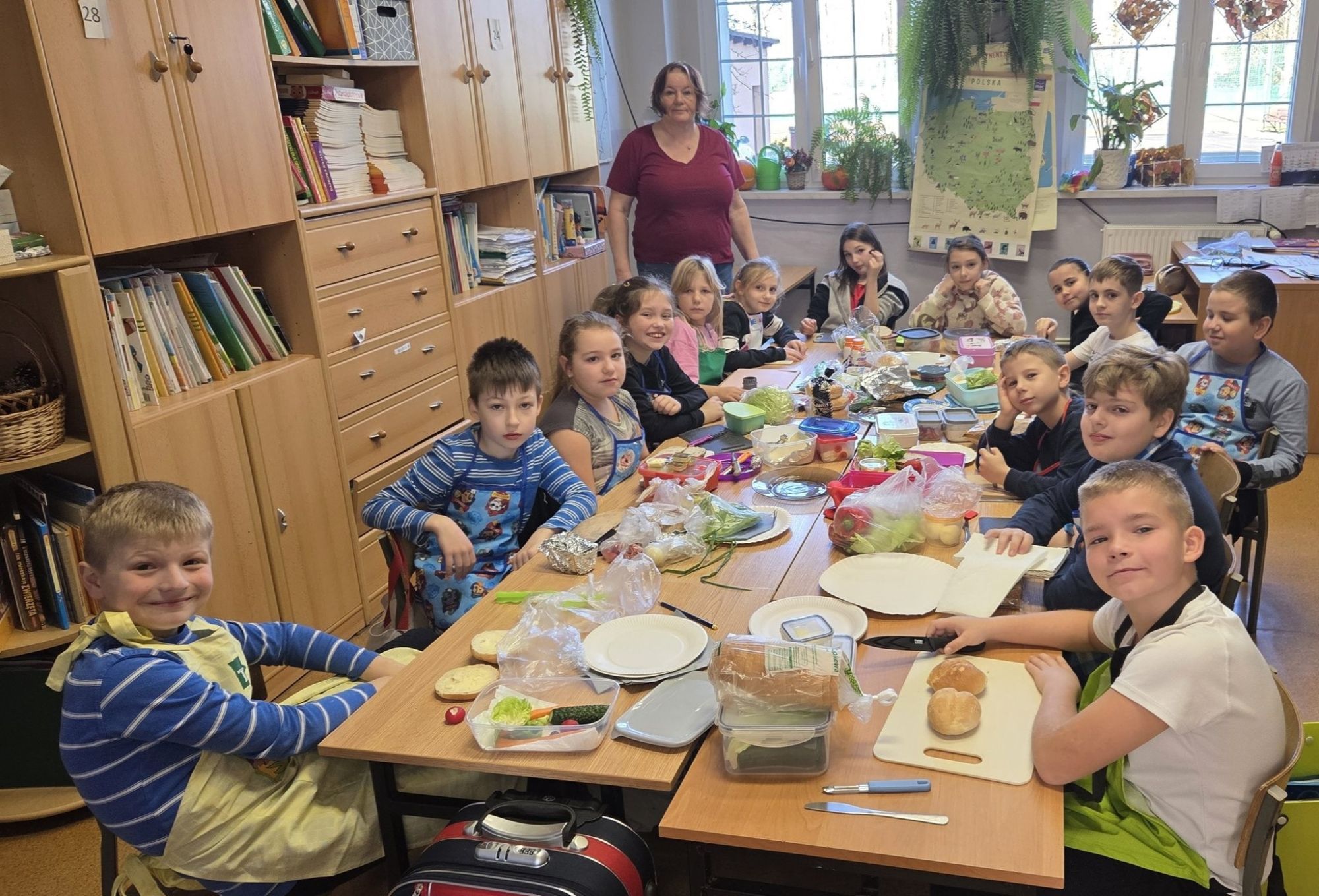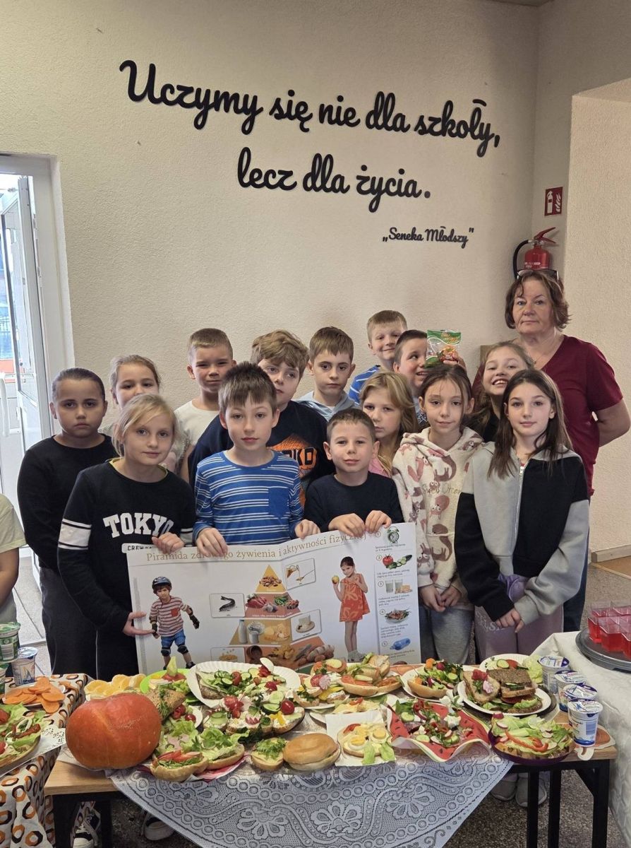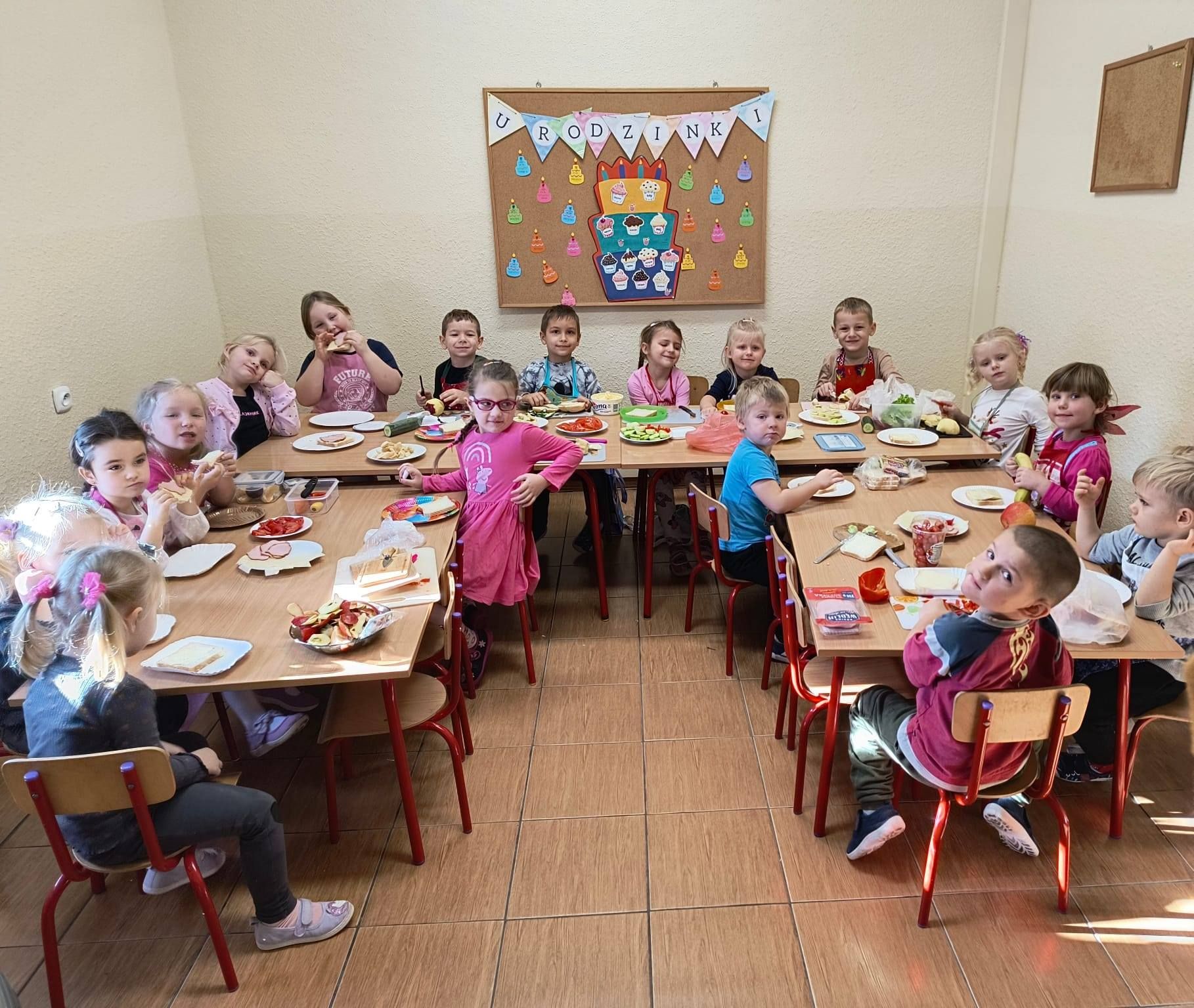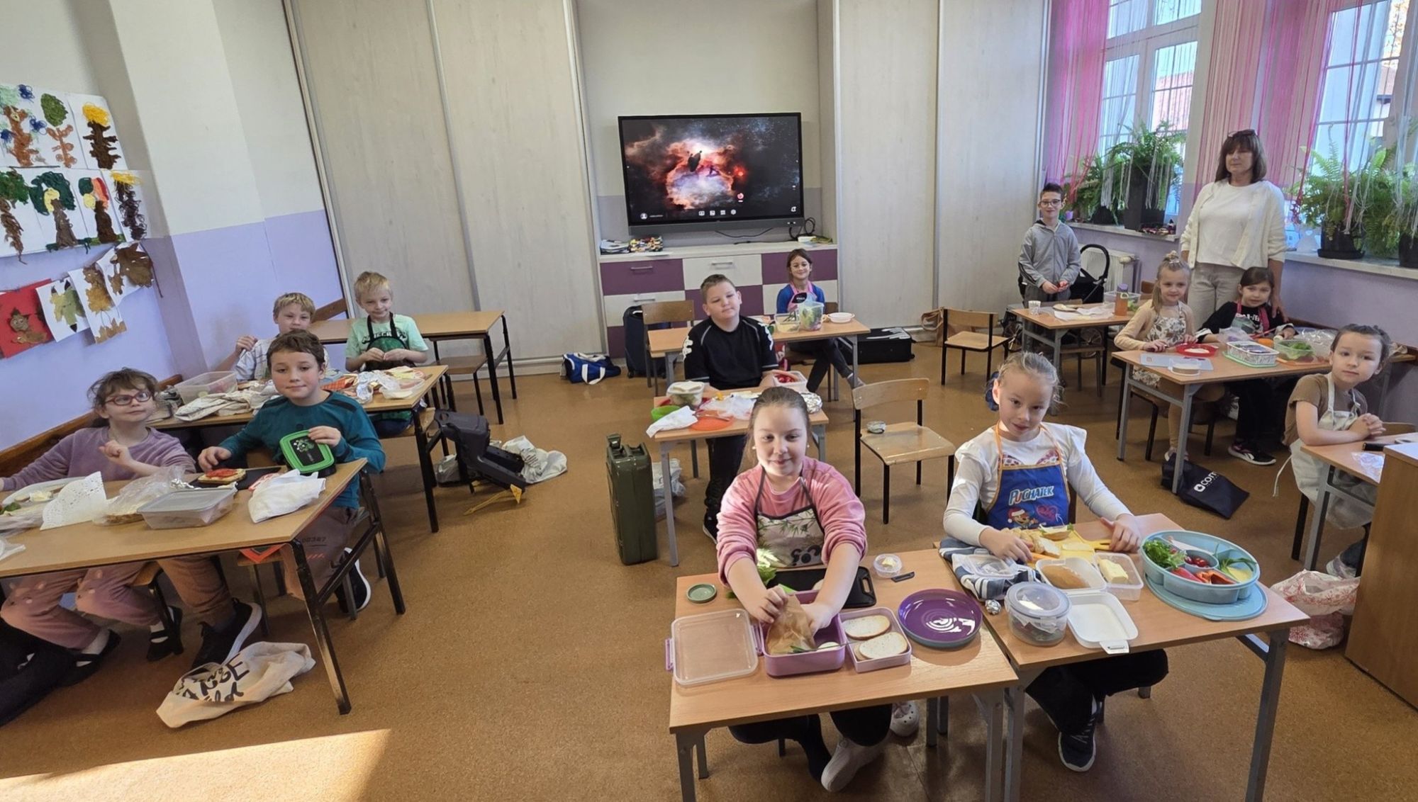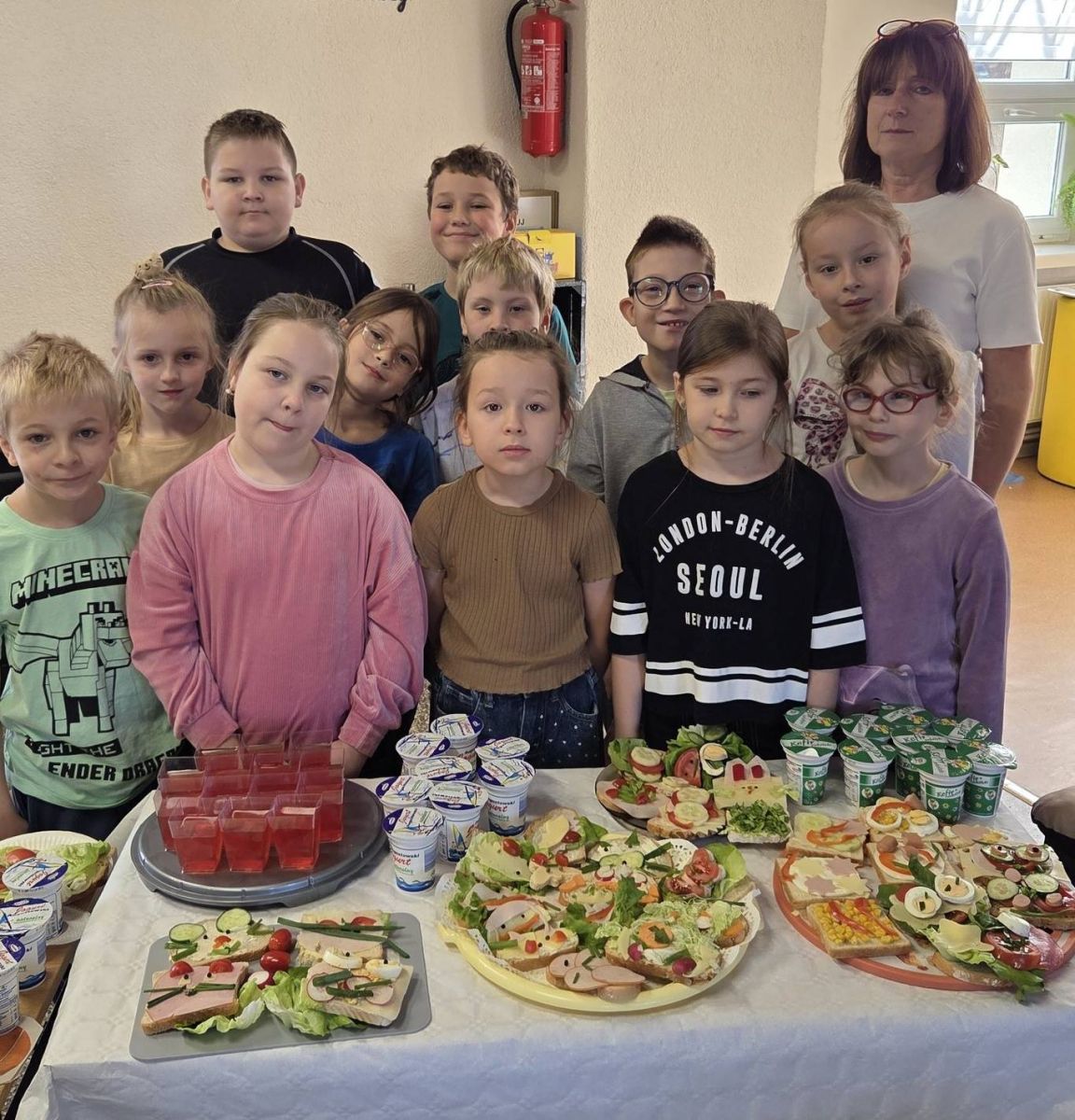 W piątek w naszej szkole odbyła się akcja „Śniadanie Daje Moc”, która jest częścią edukacyjnego programu promującego zdrowe odżywianie. Jak wszyscy wiemy – śniadanie to najważniejszy posiłek dnia! To właśnie ono daje nam energię do nauki, poprawia koncentrację i zapewnia siłę do zabawy. Wszystko zaczęło się już dwa tygodnie temu, kiedy uczniów odwiedziła pani Beata – pielęgniarka szkolna, która zapoznała ich z Piramidą Zdrowego Odżywiania i Aktywności Fizycznej. Opowiedziała, jakie produkty warto jeść najczęściej, a które należy ograniczać. W kolejnych dniach uczniowie uczestniczyli w cyklu zajęć takich jak: „Jak się zdrowo odżywiać?”, „Po co nam witaminy?”, „Jak nie marnować jedzenia?”. Zwieńczeniem całego cyklu była właśnie dzisiejsza akcja „Śniadanie Daje Moc”. Po omówieniu zasad bezpieczeństwa uczniowie z ogromnym entuzjazmem zabrali się do przygotowywania zdrowych potraw. Dzięki zaangażowaniu rodziców, którzy dostarczyli mnóstwo świeżych i pysznych produktów, stoły wypełniły się kolorowymi kanapkami, owocowymi galaretkami, deserkami i pieczonymi jabłkami. Zapach świeżego pieczywa i owoców roznosił się po całej szkole – trudno było nie zgłodnieć! Ten dzień to również jeden z ulubionych dni w naszym oddziale przedszkolnym! Tego dnia wszyscy razem przygotowujemy wspólne, kolorowe i pyszne śniadanie. Dzieci z radością kroją, smarują, układają i pomagają sobie nawzajem. Nie zabrakło też ciekawych pomysłów – najmłodsi tworzyli własne, oryginalne kanapki z owocami, a na niektórych pojawiły się nawet wesołe buźki! Wspólne śniadanie to nie tylko okazja do spróbowania nowych smaków, ale też do rozmów, śmiechu i integracji. Dzieci uczą się, że zdrowe jedzenie może być smaczne, kolorowe i wesołe – zwłaszcza, gdy przygotowujemy je razem! To był dzień pełen radości, zdrowych smaków i pozytywnej energii – bo przecież Śniadanie naprawdę Daje Moc! Serdecznie dziękujemy Rodzicom za pomoc i wsparcie w organizacji tego wyjątkowego dnia! Po takim śniadaniu nasze przedszkolaki, jak i nasi uczniowie mieli mnóstwo siły i energii, by z radością podejmować kolejne wyzwania!
