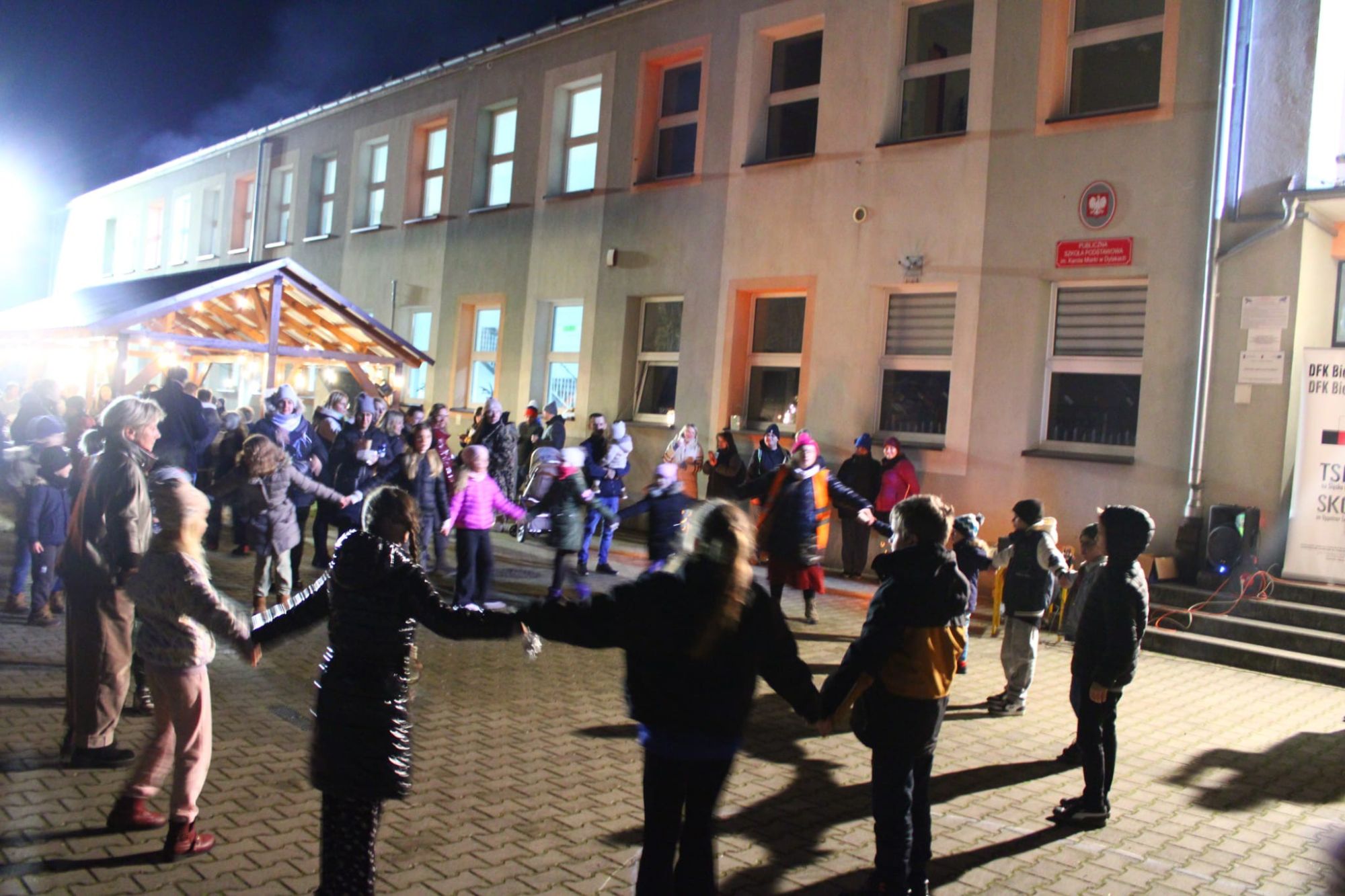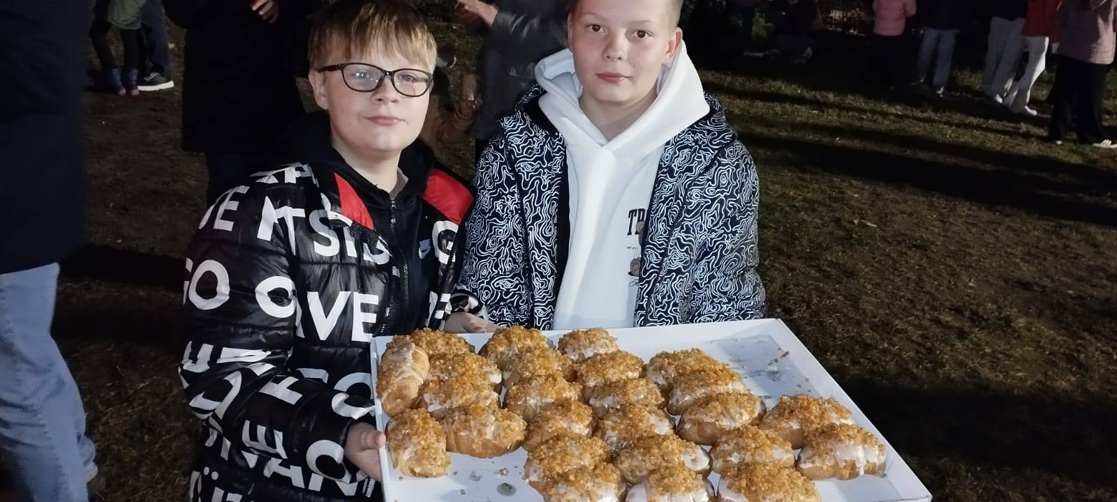 To wyjątkowe wydarzenie, które od lat wpisało się w tradycję szkoły oraz miejscowości Dylaki i Biestrzynnnik, ponownie zgromadziło dzieci, rodziców, nauczycieli i mieszkańców w duchu wspólnego świętowania. Uroczystość rozpoczęła się w kościele Mszą Świętą, podczas której dzieci zaprezentowały wzruszające występy oparte na historii Świętego Marcina – człowieka, który dzielił się sercem i płaszczem. Po nabożeństwie wyruszył barwny, rozświetlony korowód ze Świętym Marcinem na koniu, w którym uczestniczyli mieszkańcy Dylak, Biestrzynnika i okolic. Dzieci niosły własnoręcznie wykonane lampiony, dorośli – pochodnie, a nad całością unosiły się dźwięki orkiestry dętej grającej pieśni świętomarcińskie. Światło, muzyka i wspólny marsz stworzyły niepowtarzalny nastrój jedności i radości, który towarzyszył wszystkim uczestnikom aż do szkolnego dziedzińca, gdzie czekała dalsza część obchodów. Rozstawione paleniska, zapach pierogów z gęsiną, ciepłe napoje, rogaliki i rozmaite przekąski typu finger food wprowadziły wszystkich w ciepłą, jesienną atmosferę. Świętowanie rozpoczęliśmy od pięknego występu przedszkolaków z Przedszkola Publicznego nr 3 w Dylakach. W tym miejscu składamy serdeczne podziękowania Pani Joli Bienickiej za zaangażowanie, przygotowanie dzieci i udział w obchodach. Nie zabrakło również gier i zabaw dla dzieci, które z radością korzystały z przygotowanych atrakcji.