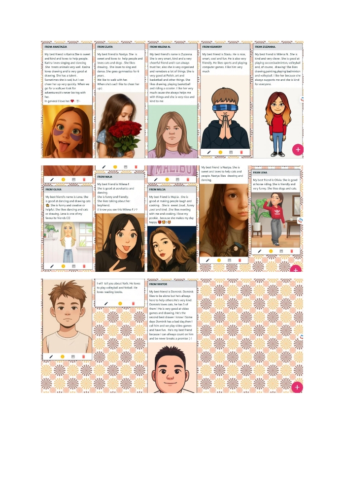 W ramach projektu „Moc relacji w edukacji-łączymy, aby zmieniać” uczniowie klas 6A i 7A stworzyli opisy swoich przyjaciół w języku angielskim. Dzięki tej aktywności uczniowie nie tylko podzielili się informacjami na temat swoich przyjaciół ale i usprawnili swoje umiejętności komunikacyjne w języku angielskim. Zapraszamy do obejrzeniaJ