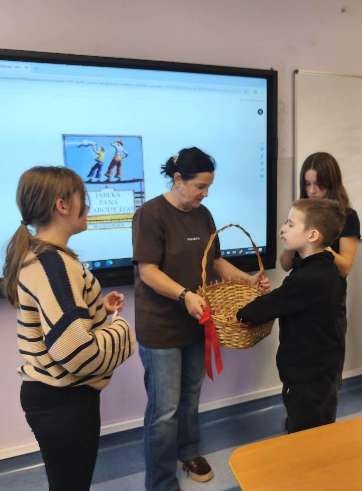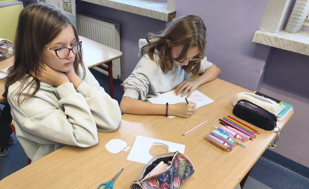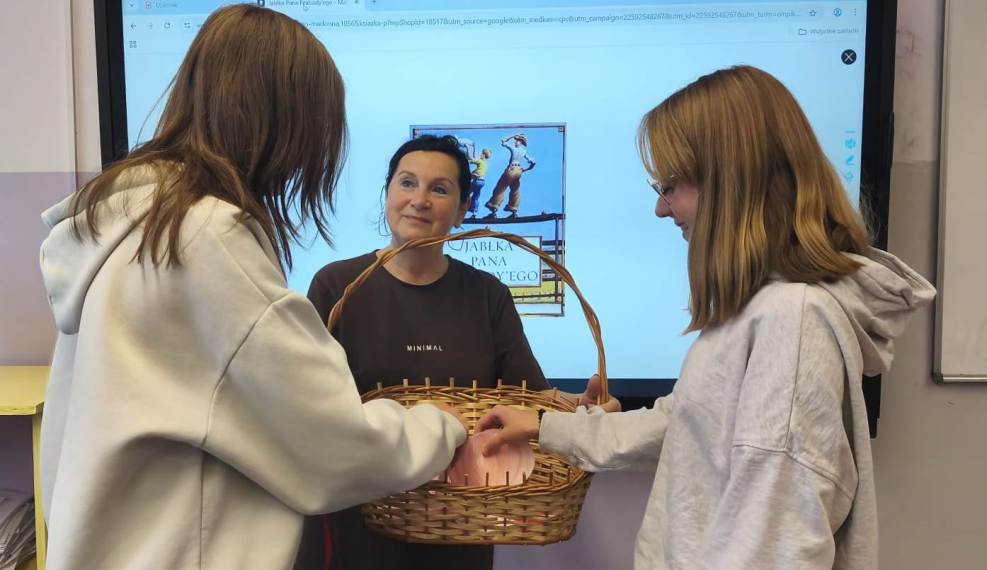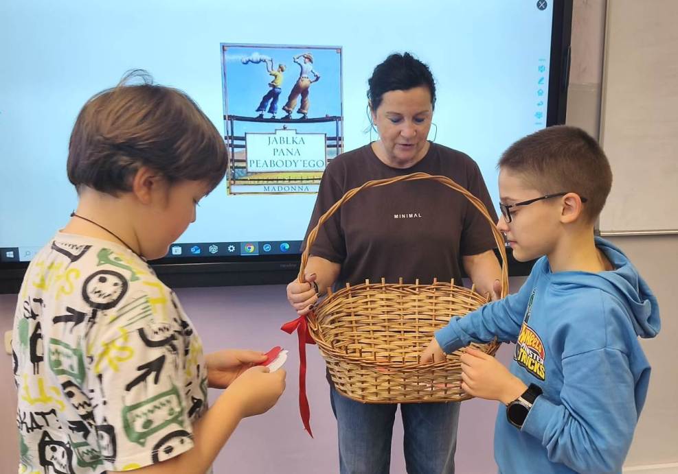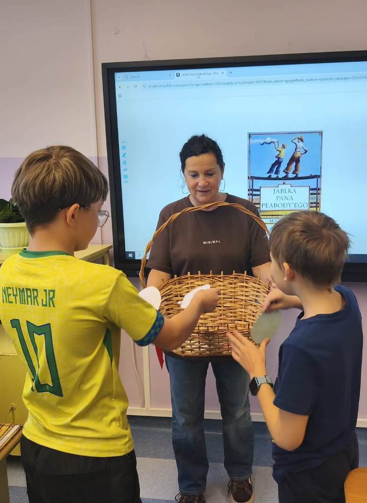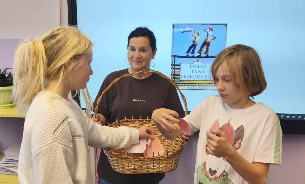 Wspólne głośne czytanie książki pozwoliło uczniom zanurzyć się w historii, poczuć emocje bohaterów i przeżywać fabułę razem. To wspaniały sposób na budowanie wspólnoty w klasie! Dyskusja skupiła się na relacjach Pana Peabody’ego z otoczeniem. Rozmawialiśmy o tym, jak zachowanie i postawy bohaterów zmieniały się w miarę rozwoju akcji, jak dostrzegali swoje błędy i jak ważna jest odwaga, by przyznać się do pomyłki. Kulminacją zajęć było piękne symboliczne ćwiczenie. Nawiązując do motywu jabłek z książki, na szablonach owoców uczniowie zapisali słowa, które podnoszą na duchu!
