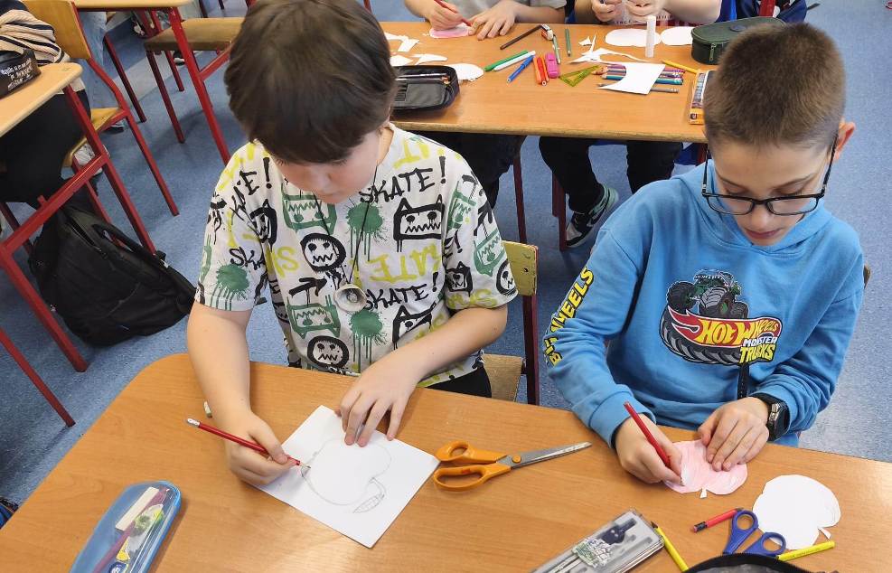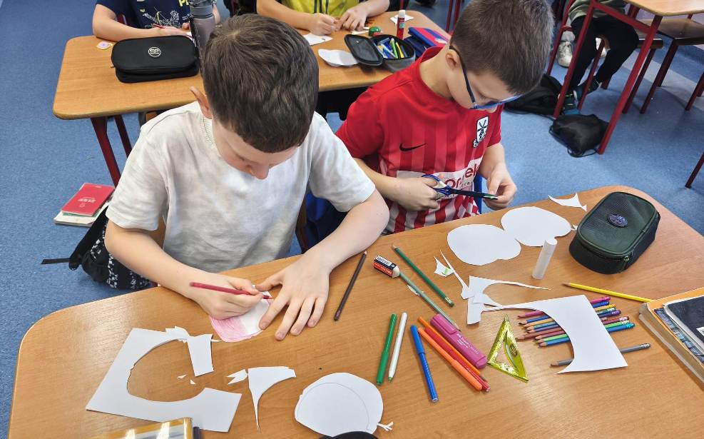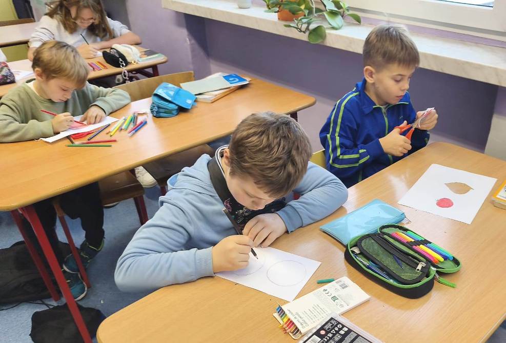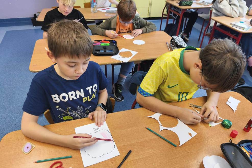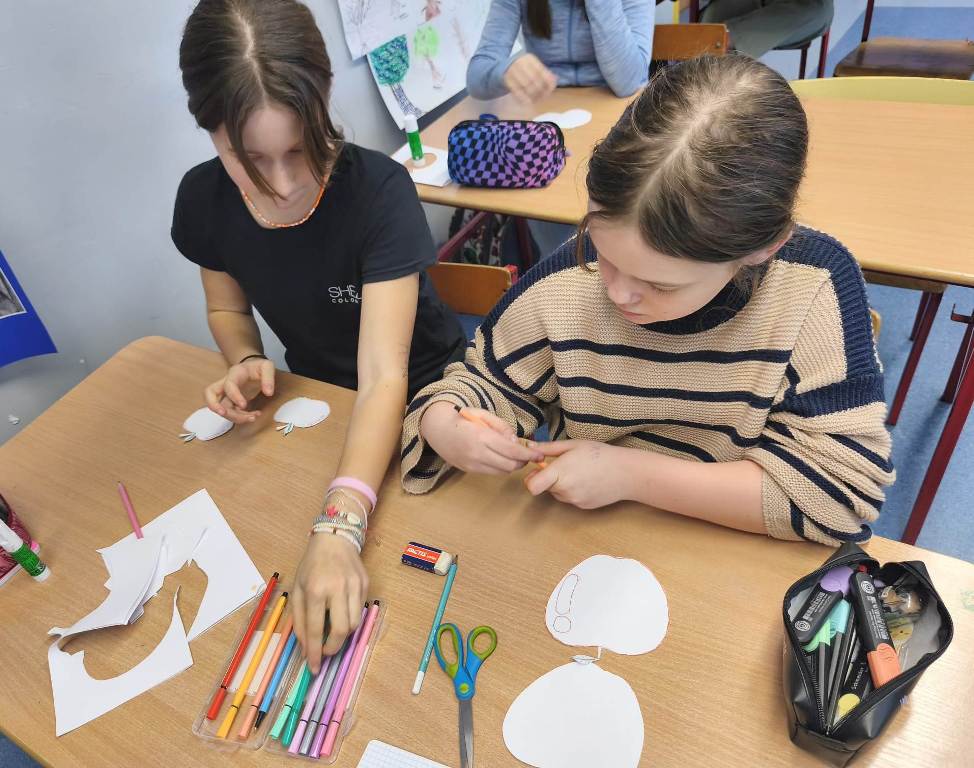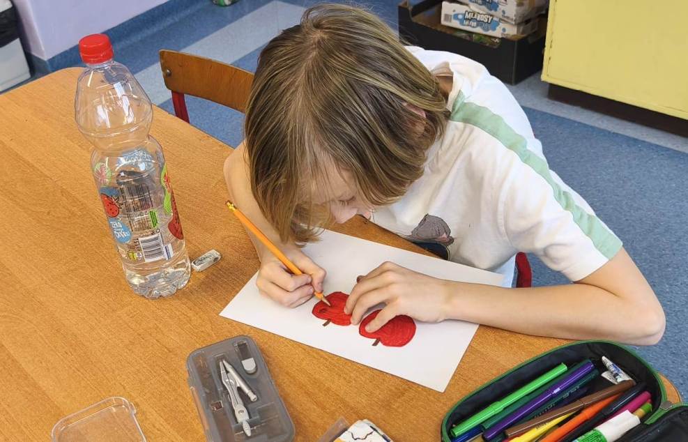 Wspólne głośne czytanie książki pozwoliło uczniom zanurzyć się w historii, poczuć emocje bohaterów i przeżywać fabułę razem. To wspaniały sposób na budowanie wspólnoty w klasie! Dyskusja skupiła się na relacjach Pana Peabody’ego z otoczeniem. Rozmawialiśmy o tym, jak zachowanie i postawy bohaterów zmieniały się w miarę rozwoju akcji, jak dostrzegali swoje błędy i jak ważna jest odwaga, by przyznać się do pomyłki. Kulminacją zajęć było piękne symboliczne ćwiczenie. Nawiązując do motywu jabłek z książki, na szablonach owoców uczniowie zapisali słowa, które podnoszą na duchu!