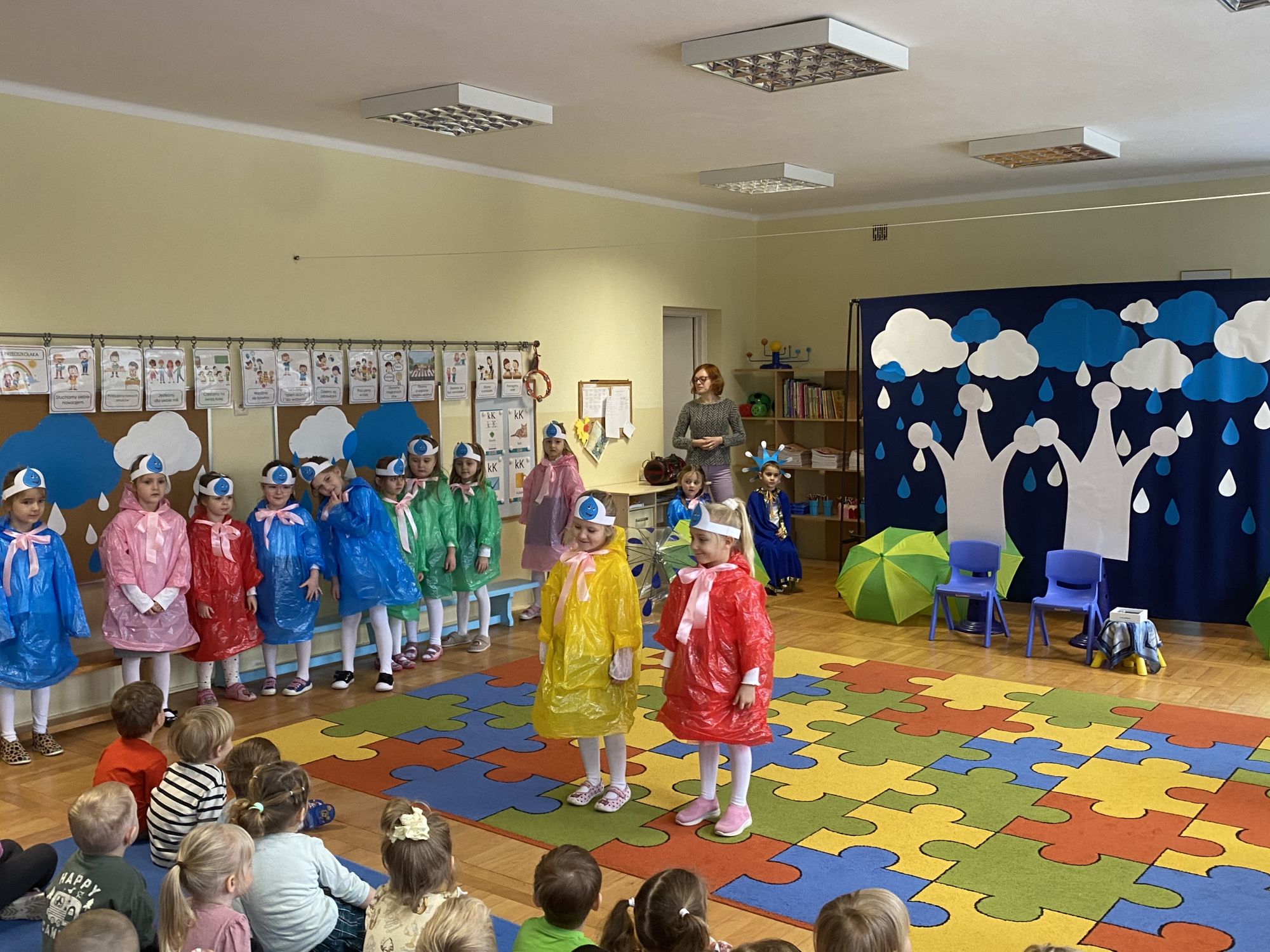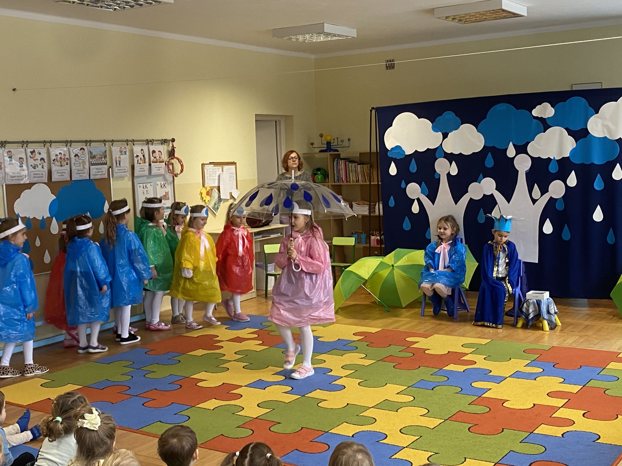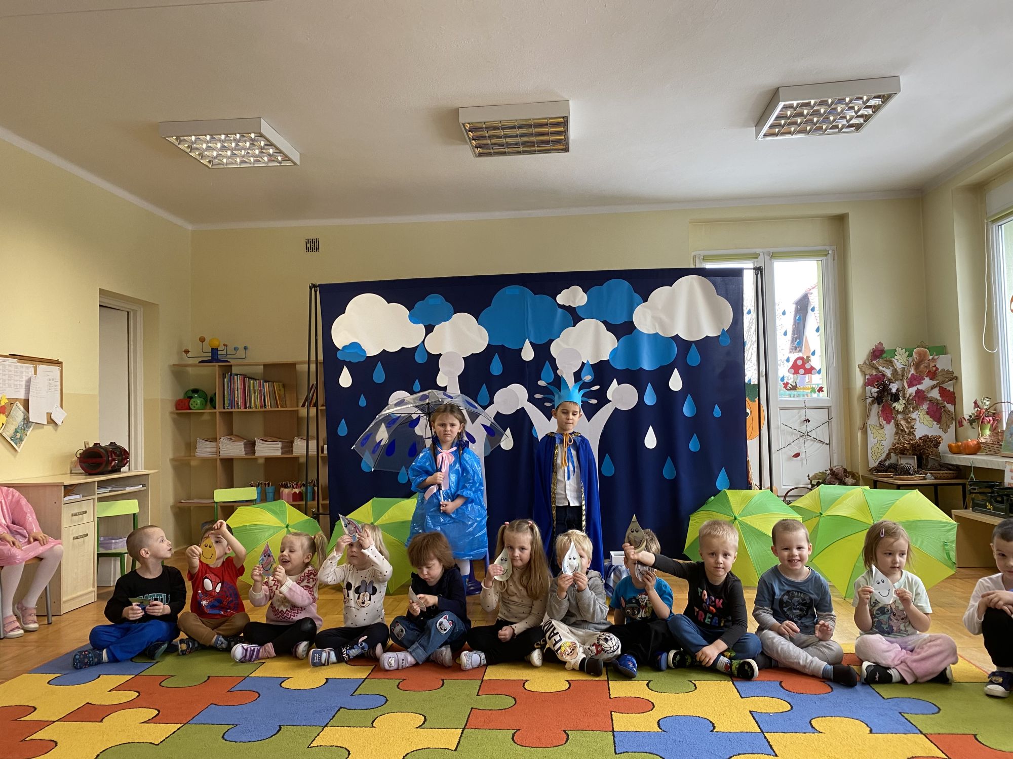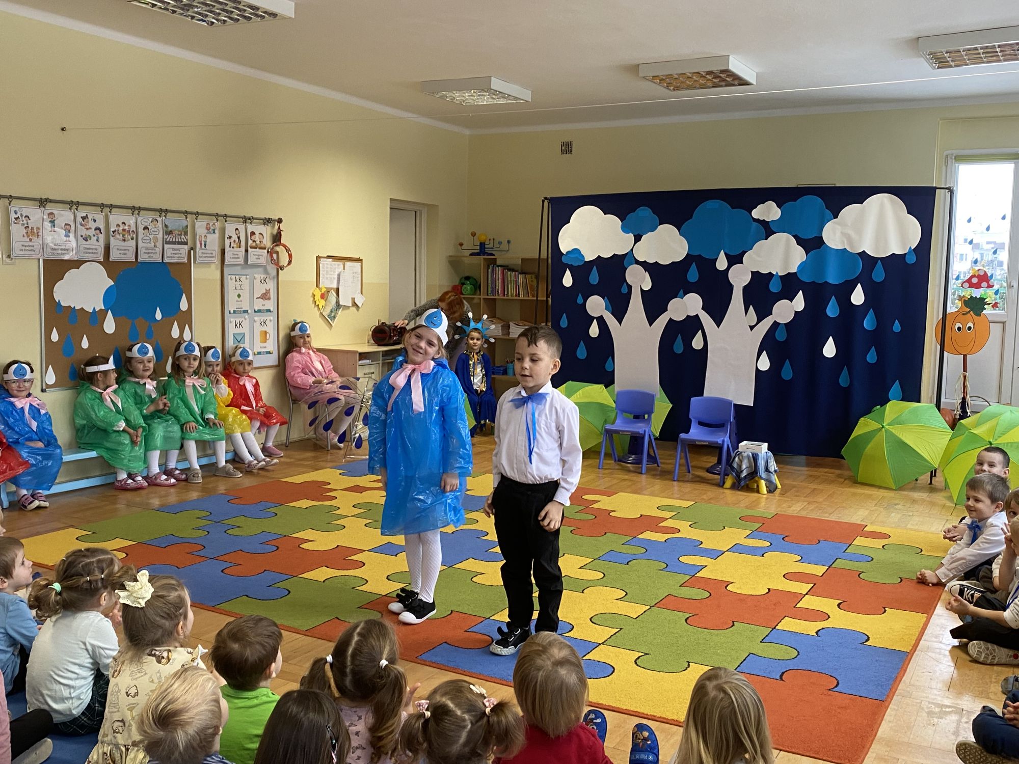 Spotkanie rozpoczęło się od słuchania odgłosów jesiennego deszczu, co wprowadziło wszystkich w niezwykły, nastrojowy klimat. Następnie dzieci z wielkim zaangażowaniem zaprezentowały piosenkę o jesieni. Kolejnym punktem programu była inscenizacja „Deszczowy Król”, w której nasi mali aktorzy wcielili się w role jesiennych bohaterów, pokazując, jak jesienny deszcz może być nie tylko szary, ale także magiczny i pełen niespodzianek.