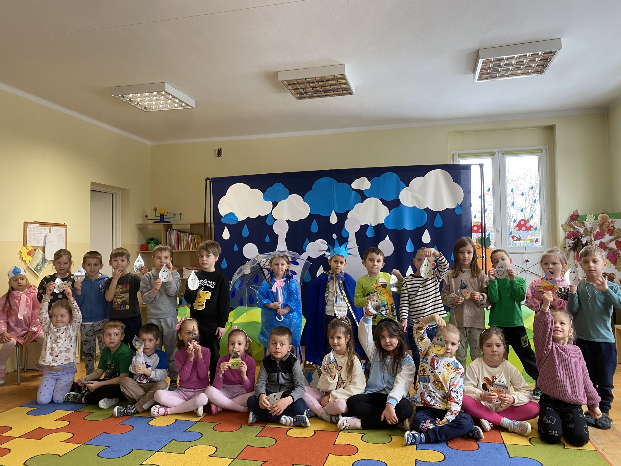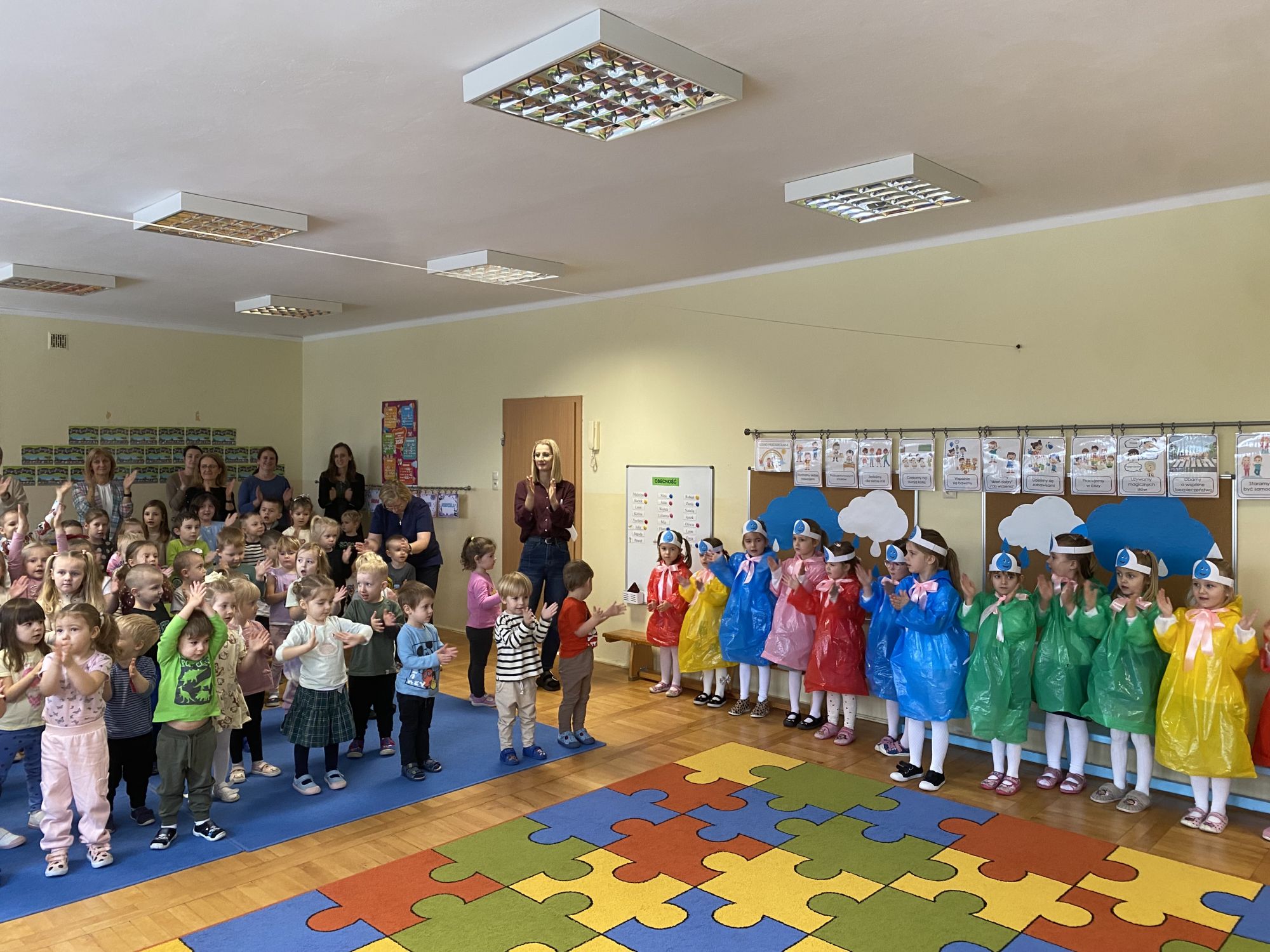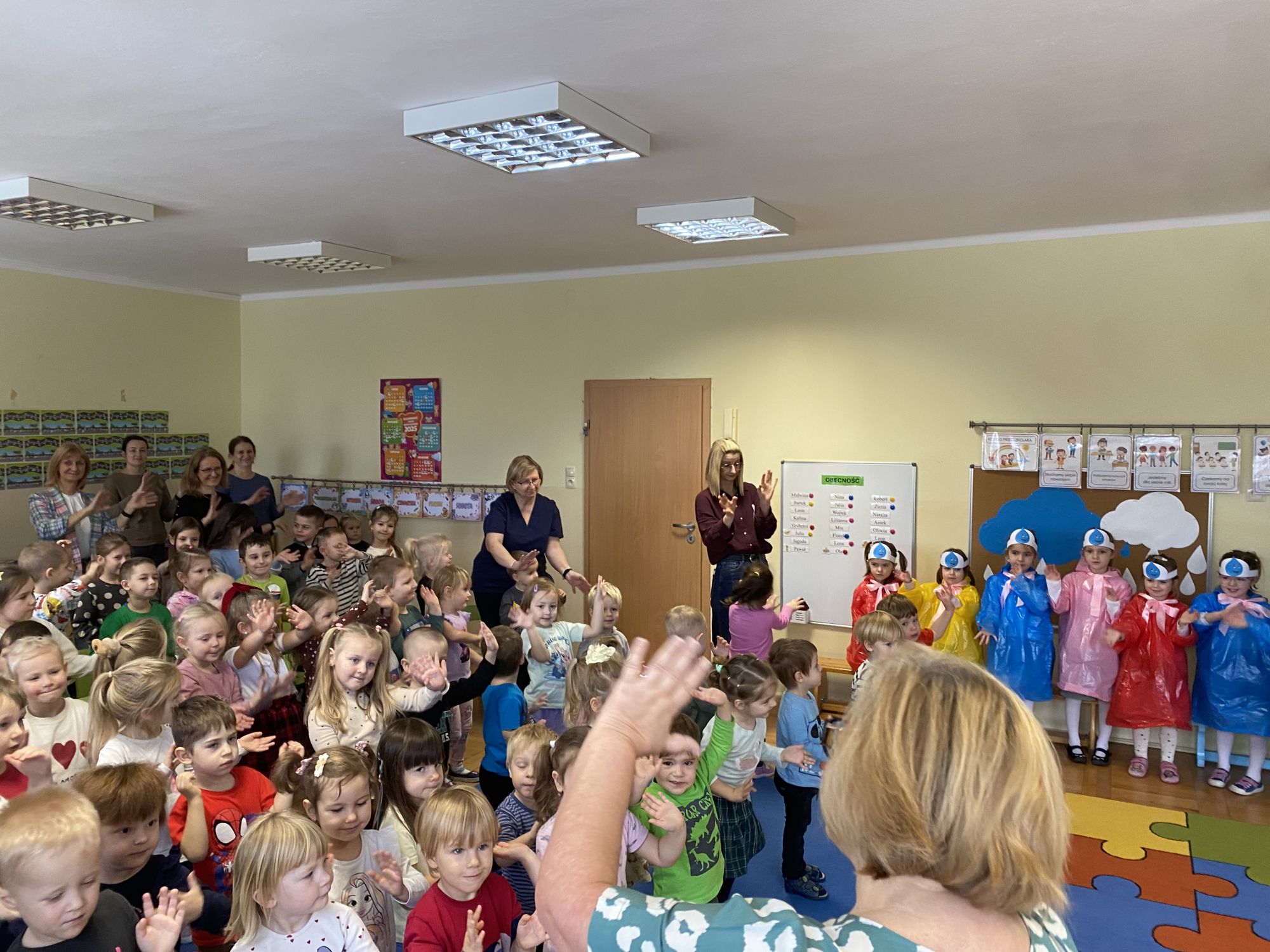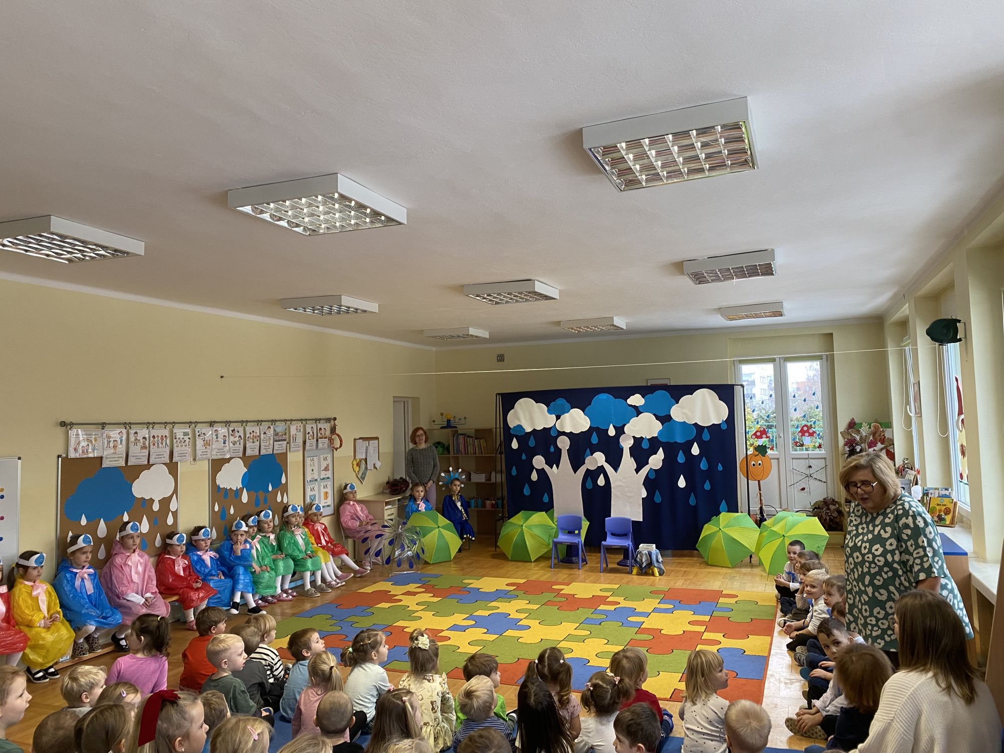 Spotkanie rozpoczęło się od słuchania odgłosów jesiennego deszczu, co wprowadziło wszystkich w niezwykły, nastrojowy klimat. Następnie dzieci z wielkim zaangażowaniem zaprezentowały piosenkę o jesieni. Kolejnym punktem programu była inscenizacja „Deszczowy Król”, w której nasi mali aktorzy wcielili się w role jesiennych bohaterów, pokazując, jak jesienny deszcz może być nie tylko szary, ale także magiczny i pełen niespodzianek.