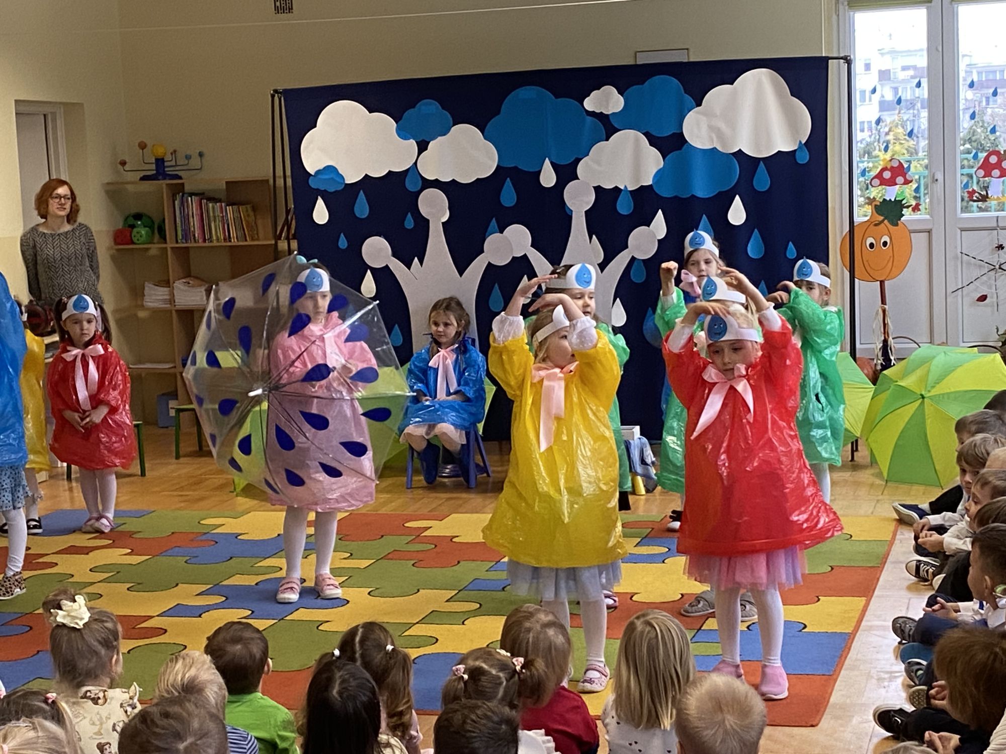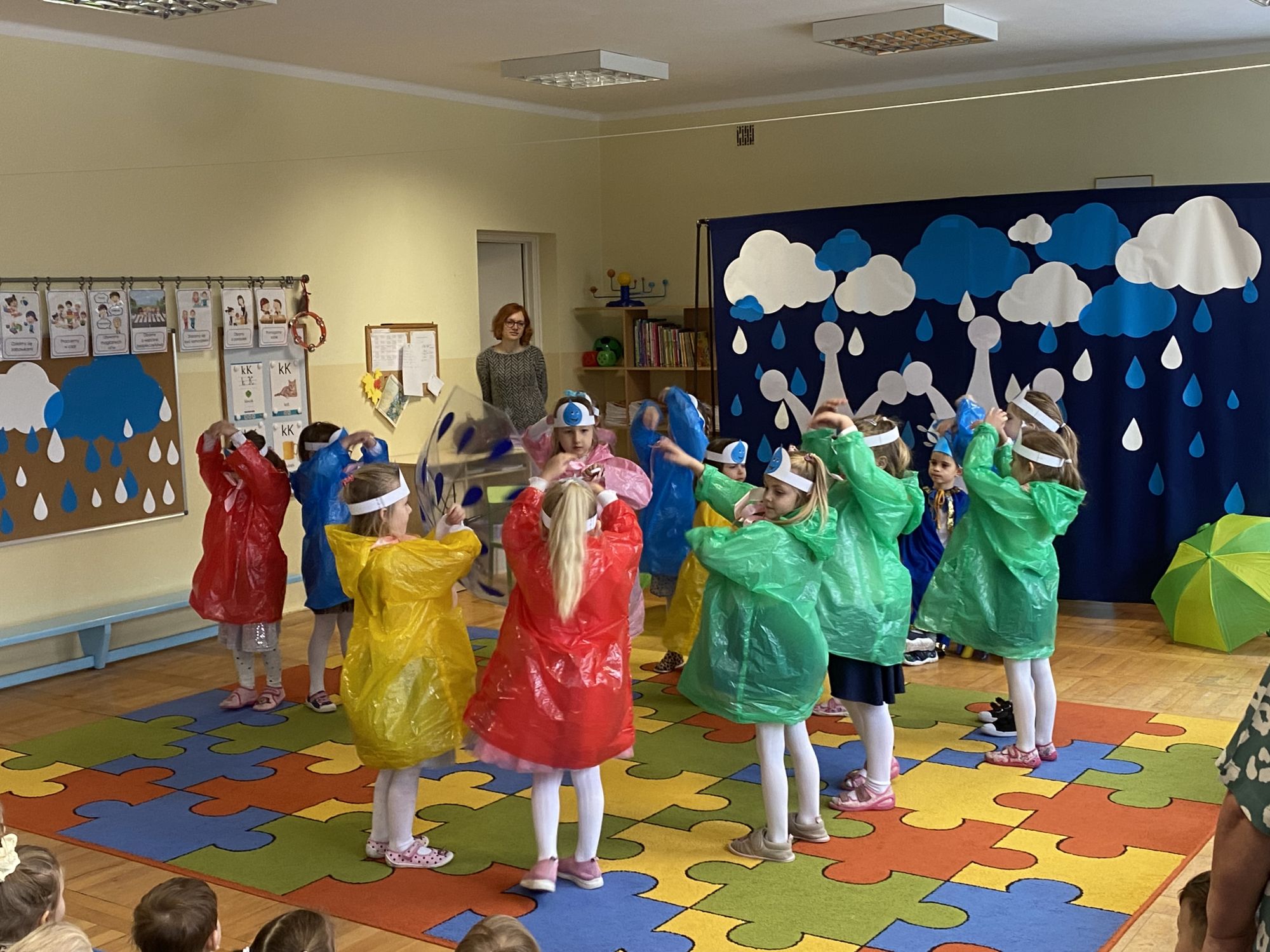 Bardzo miłym akcentem przedstawienia był pełen energii i uśmiechu taniec "Wesołych Deszczowych Kropelek, który wzbudził zachwyt publiczności. Dziewczynki z wielką swobodą i radością zaprezentowały swoje umiejętności taneczne, tworząc barwne, poruszające się jak deszczowa chmurka widowisko.