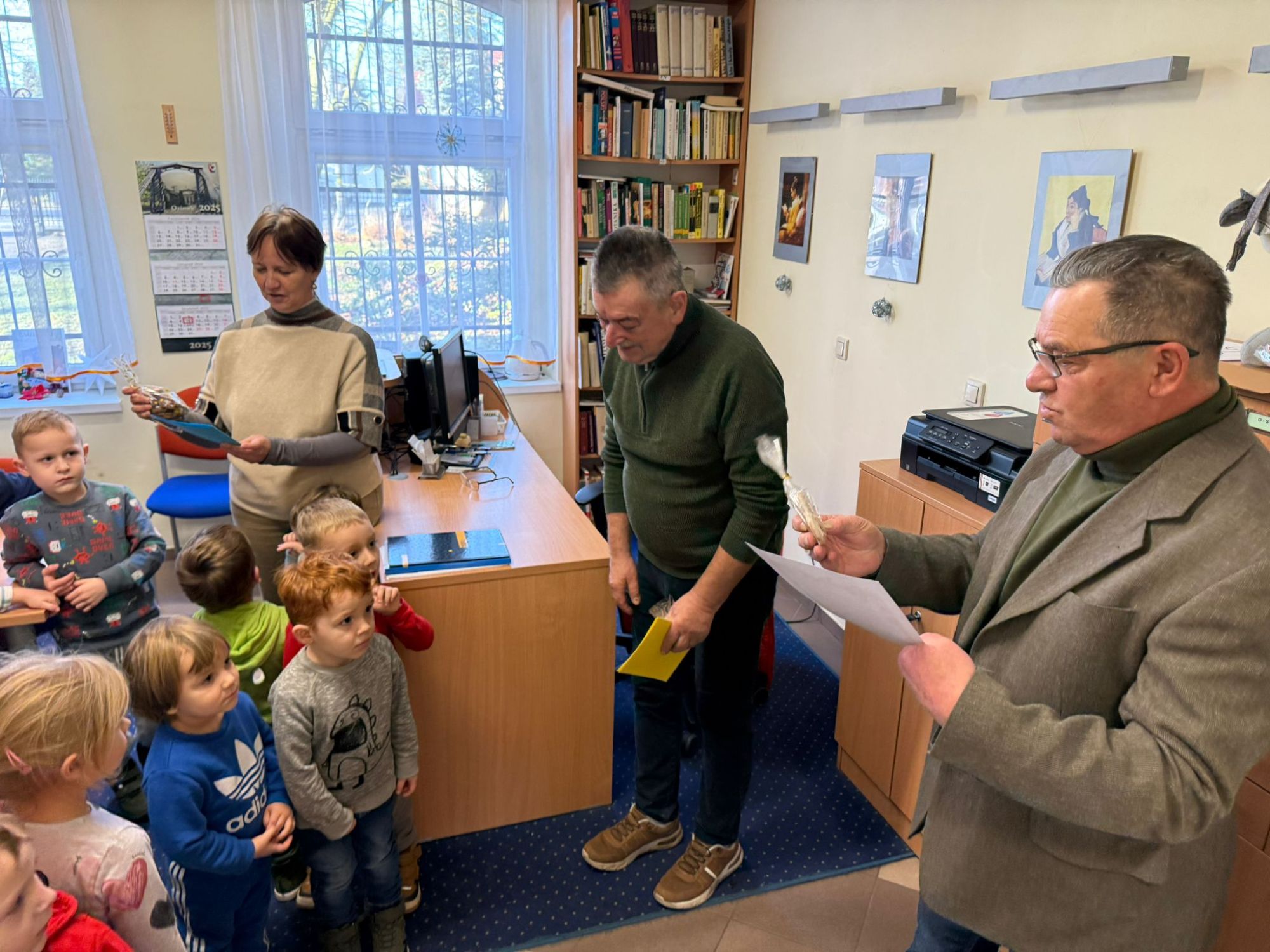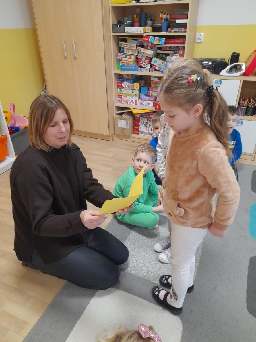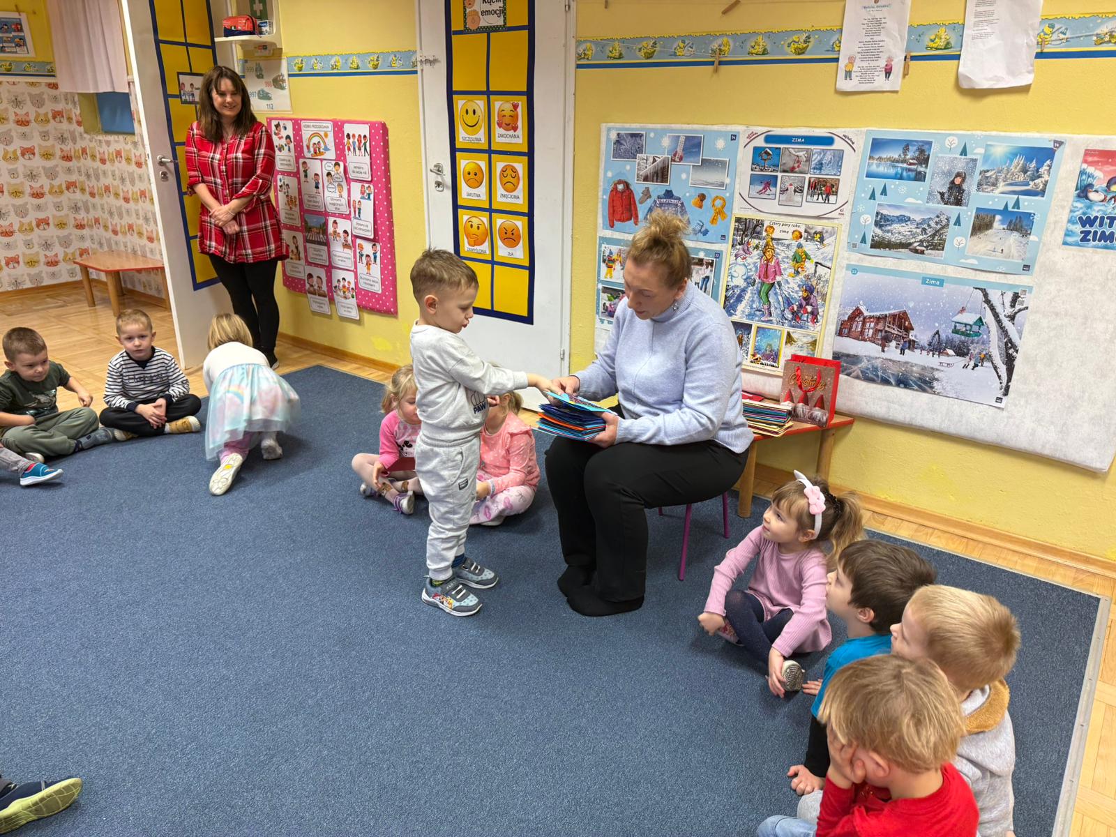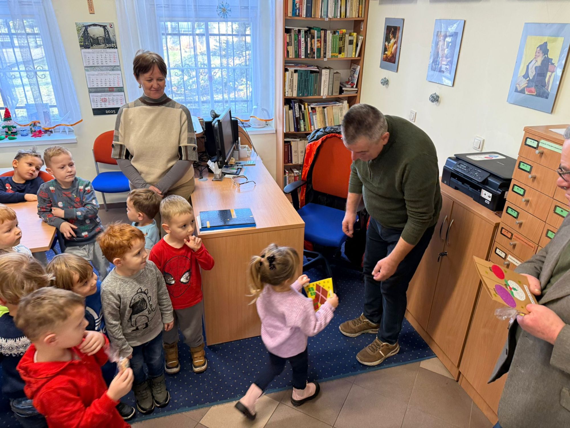 W pierwszych tygodniach grudnia, przedszkolaki z Piąteczki wzięły udział w wyjątkowej akcji wymiany kartek świątecznych w ramach "Innowacji pedagogicznej - Weihnachtskartenaustausch" autorstwa Dominiki Gerlich. Celem przedsięwzięcia było rozwijanie wrażliwosci oraz budowanie relacji z lokalną społecznością i dziećmi z innego przedszkola. Przedszkolaki z wielkim zaangażowaniem przygotowywały kartki świąteczne, wkładając w nie dużo serca i radości. W ramach tej akcji 11 grudnia do naszego przedszkola przyjechała pani Ewa Wąsowicz z Zespołu Szkolono - Przedszkolnego w Grodźcu, w celu wymienienia się z naszymi dziećmi kartkami i życzeniami bożonarodzeniowymi. Sprawiło to naszym wychowankom wiele radości i było dla nich cennym doświadczeniem, uczącym życzliwości i radości płynącej z obdarowywania innych. W piątek 12 grudnia przedszkolanki odwiedziły bibliotekę w Krasiejowie. Spotkanie miało wyjątkowy charakter, ponieważ połączyło w sobie miłość do książek, świąteczną tradycję oraz piękny gest pamięci o osobach zaangażowanych w życie lokalnej społeczności. Na to spotkanie zaproszono sołtysa wsi pana Tadeusza Markulaka, przedstawiciela DFK Krasiejów pana Piotra Szubert oraz bibliotekarkę panią Aldonę Kuśmierską. Dzieci wręczyły im własnoręcznie wykonane kartki świąteczne składając jednocześnie serdeczne życzenia bożonarodzeniowe. Szczególnym momentem spotkania było czytanie opowiadania światecznego przez Pana Piotra i Panią Aldonę. Wszyscy z zainteresowaniem słuchali histroii, która wprowadziła w magiczną atmosferę zbliżających się świąt Bożego Narodzenia. Spotkanie było miłym i wzruszającym momentem, a uśmiechy na twarzach obdarowanych były najlepszym dowodem na to, jak ważne są takie gesty. Podczas wizyty w bibliotece przedszkolaki miały okazję obejrzeć bogate zbiory w bibliotece w Krasiejowie.