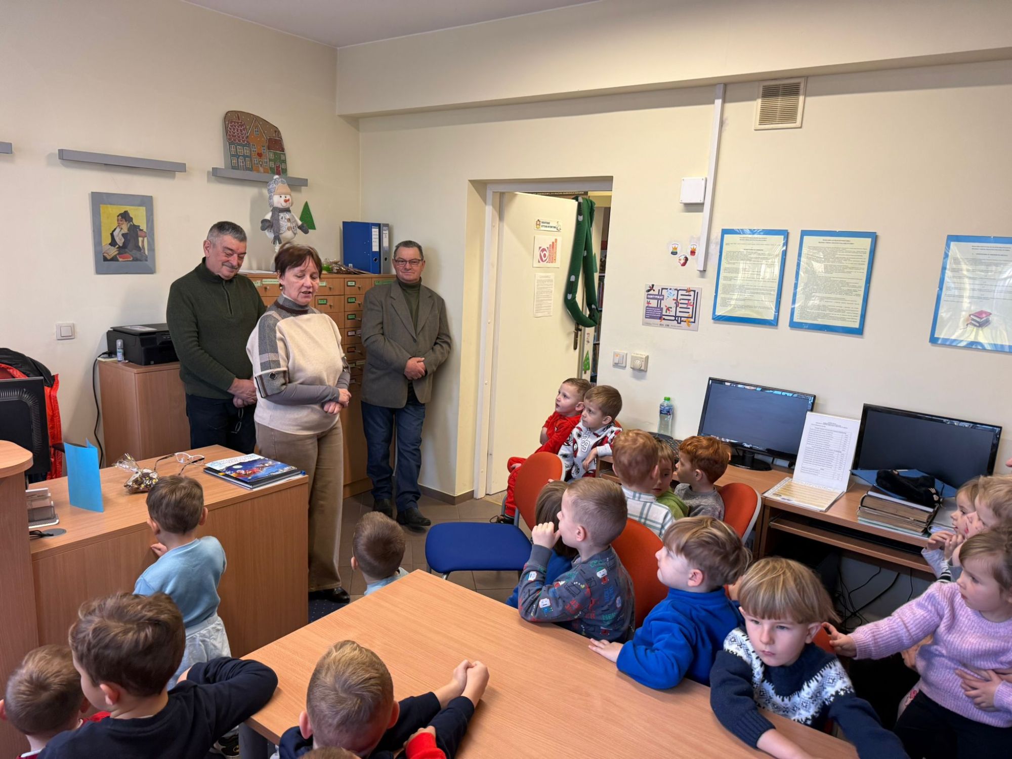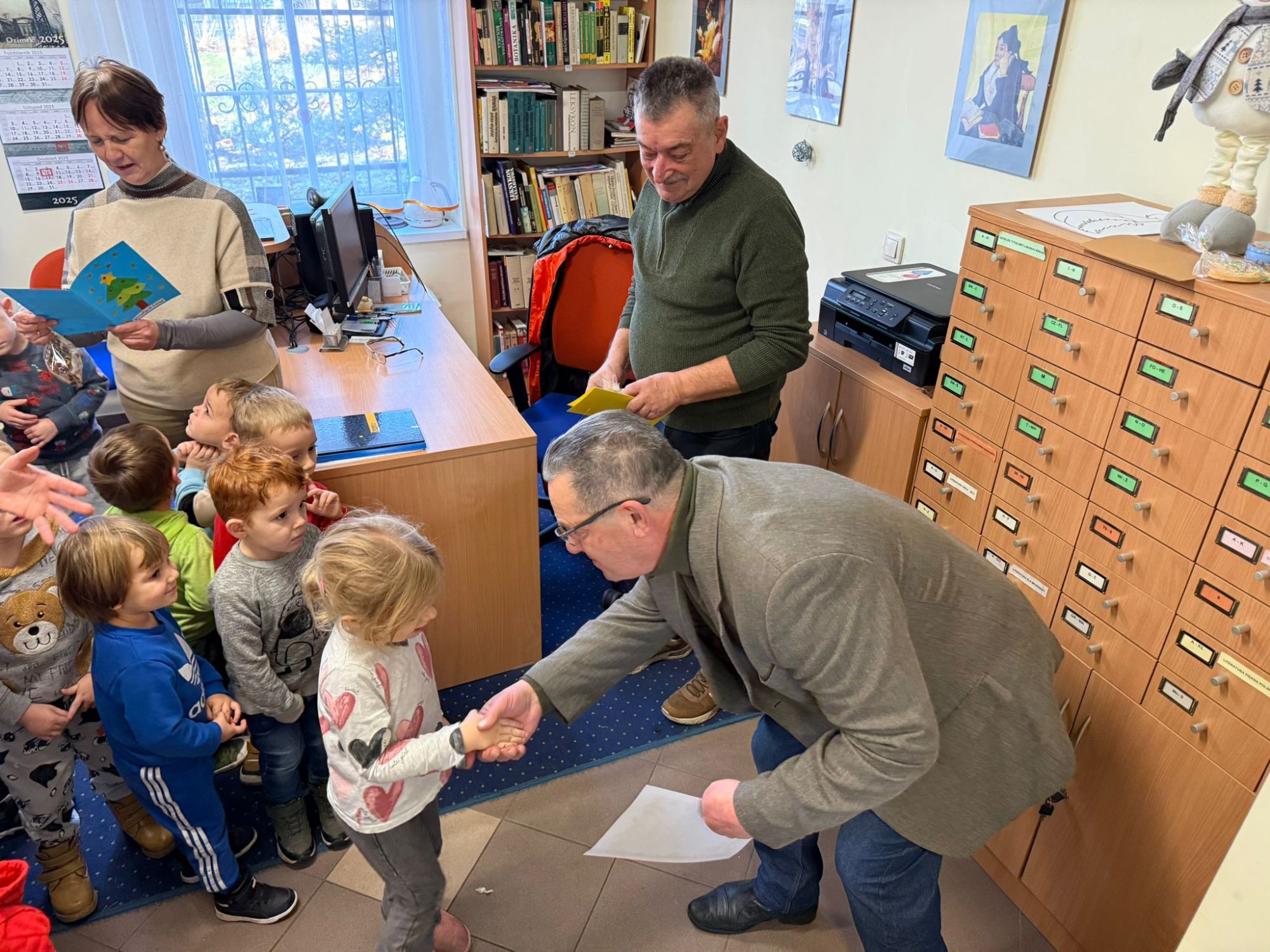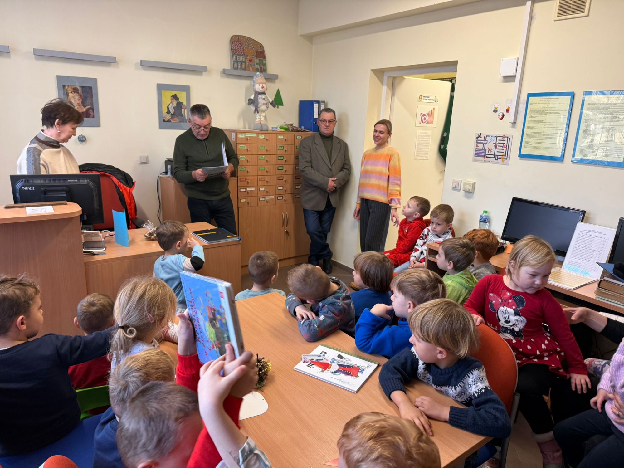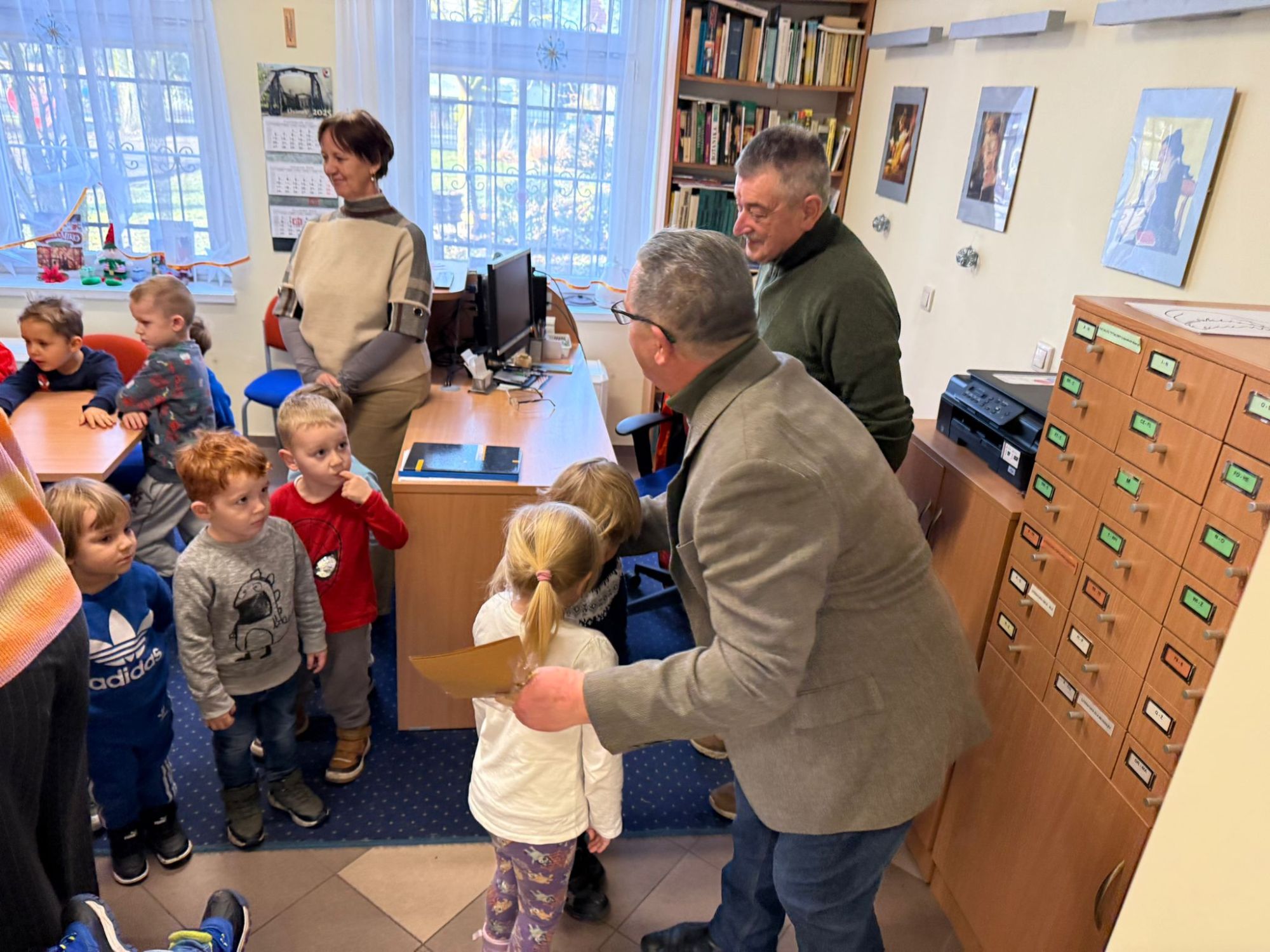 W pierwszych tygodniach grudnia, przedszkolaki z Piąteczki wzięły udział w wyjątkowej akcji wymiany kartek świątecznych w ramach "Innowacji pedagogicznej - Weihnachtskartenaustausch" autorstwa Dominiki Gerlich. Celem przedsięwzięcia było rozwijanie wrażliwosci oraz budowanie relacji z lokalną społecznością i dziećmi z innego przedszkola. Przedszkolaki z wielkim zaangażowaniem przygotowywały kartki świąteczne, wkładając w nie dużo serca i radości. W ramach tej akcji 11 grudnia do naszego przedszkola przyjechała pani Ewa Wąsowicz z Zespołu Szkolono - Przedszkolnego w Grodźcu, w celu wymienienia się z naszymi dziećmi kartkami i życzeniami bożonarodzeniowymi. Sprawiło to naszym wychowankom wiele radości i było dla nich cennym doświadczeniem, uczącym życzliwości i radości płynącej z obdarowywania innych. W piątek 12 grudnia przedszkolanki odwiedziły bibliotekę w Krasiejowie. Spotkanie miało wyjątkowy charakter, ponieważ połączyło w sobie miłość do książek, świąteczną tradycję oraz piękny gest pamięci o osobach zaangażowanych w życie lokalnej społeczności. Na to spotkanie zaproszono sołtysa wsi pana Tadeusza Markulaka, przedstawiciela DFK Krasiejów pana Piotra Szubert oraz bibliotekarkę panią Aldonę Kuśmierską. Dzieci wręczyły im własnoręcznie wykonane kartki świąteczne składając jednocześnie serdeczne życzenia bożonarodzeniowe. Szczególnym momentem spotkania było czytanie opowiadania światecznego przez Pana Piotra i Panią Aldonę. Wszyscy z zainteresowaniem słuchali histroii, która wprowadziła w magiczną atmosferę zbliżających się świąt Bożego Narodzenia. Spotkanie było miłym i wzruszającym momentem, a uśmiechy na twarzach obdarowanych były najlepszym dowodem na to, jak ważne są takie gesty. Podczas wizyty w bibliotece przedszkolaki miały okazję obejrzeć bogate zbiory w bibliotece w Krasiejowie.