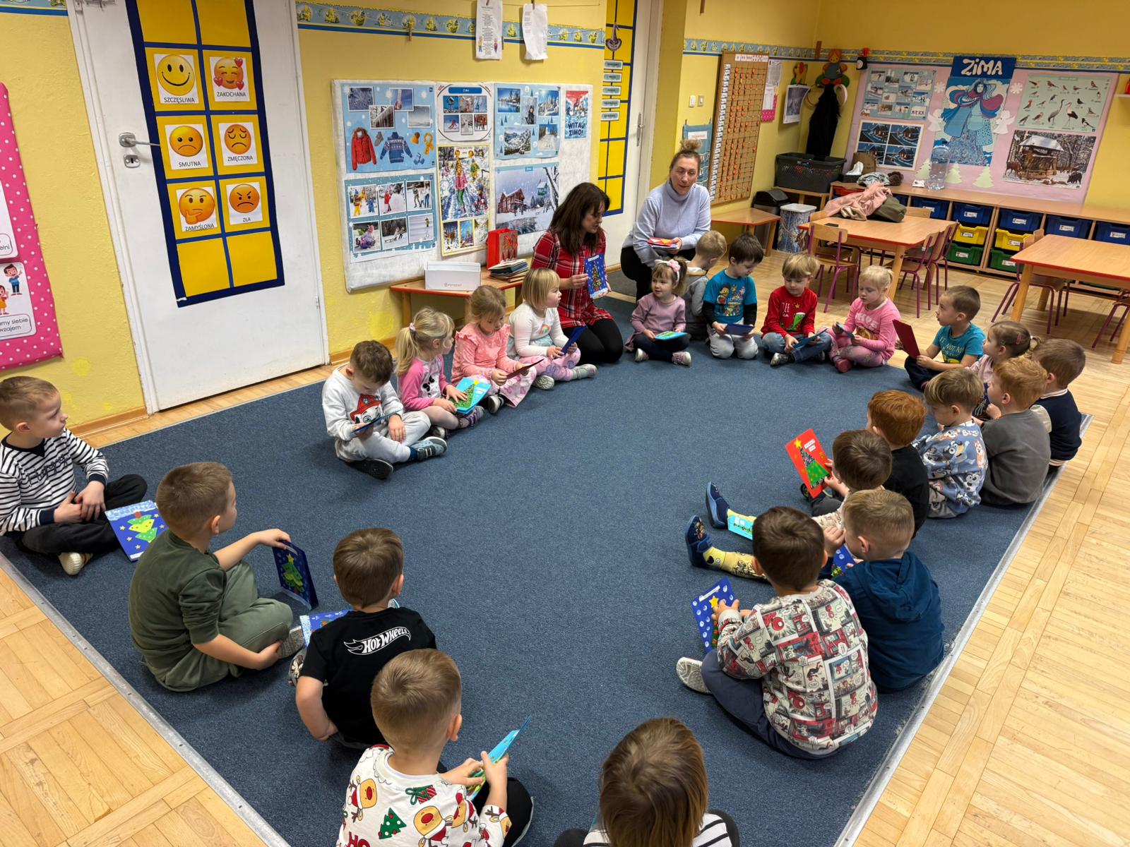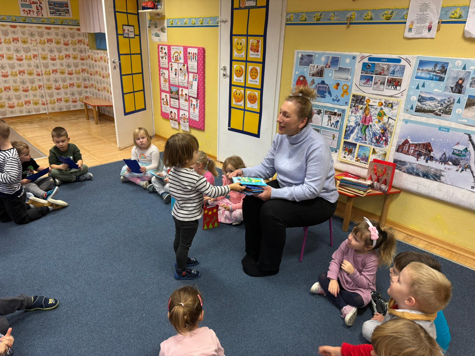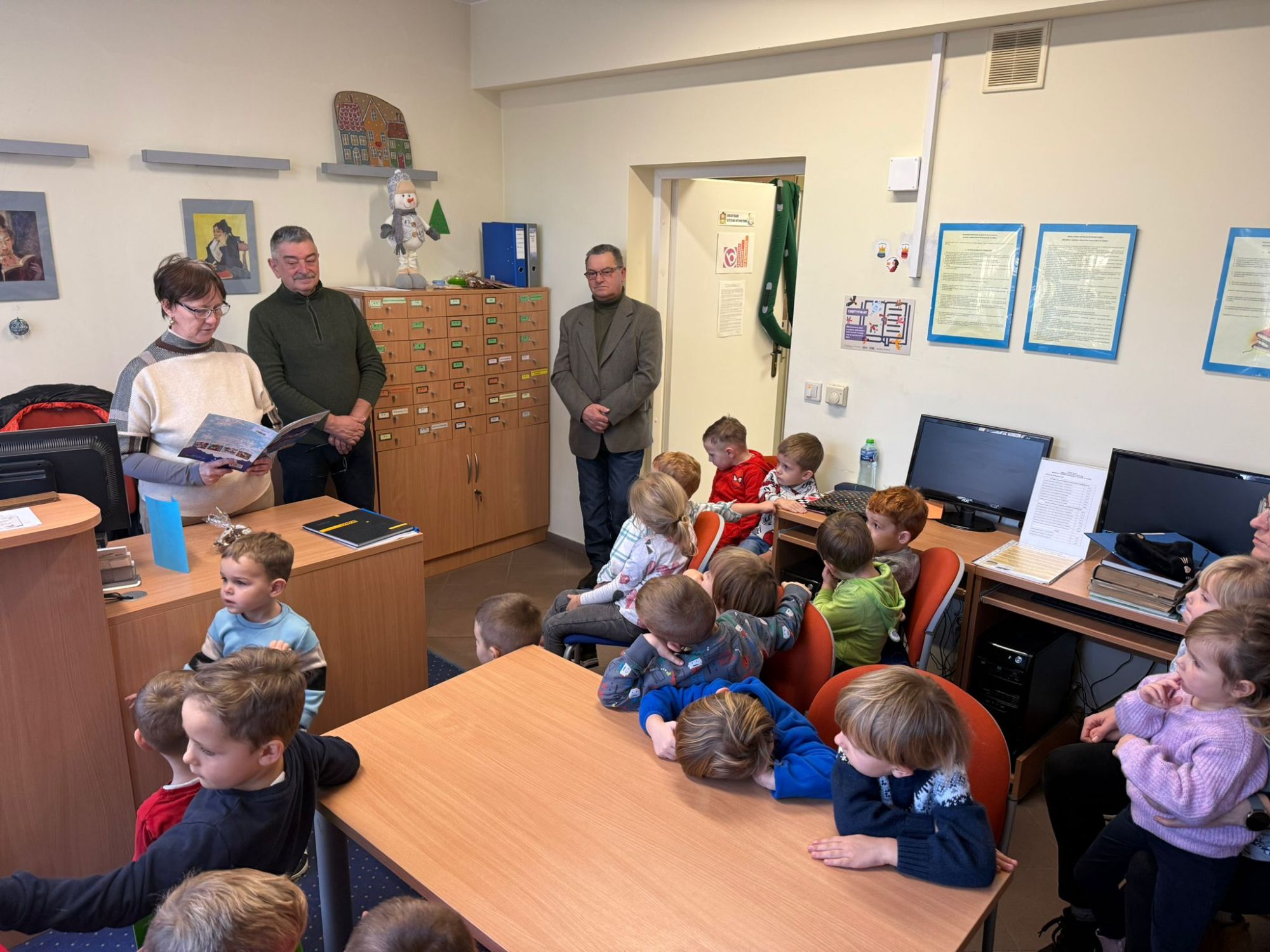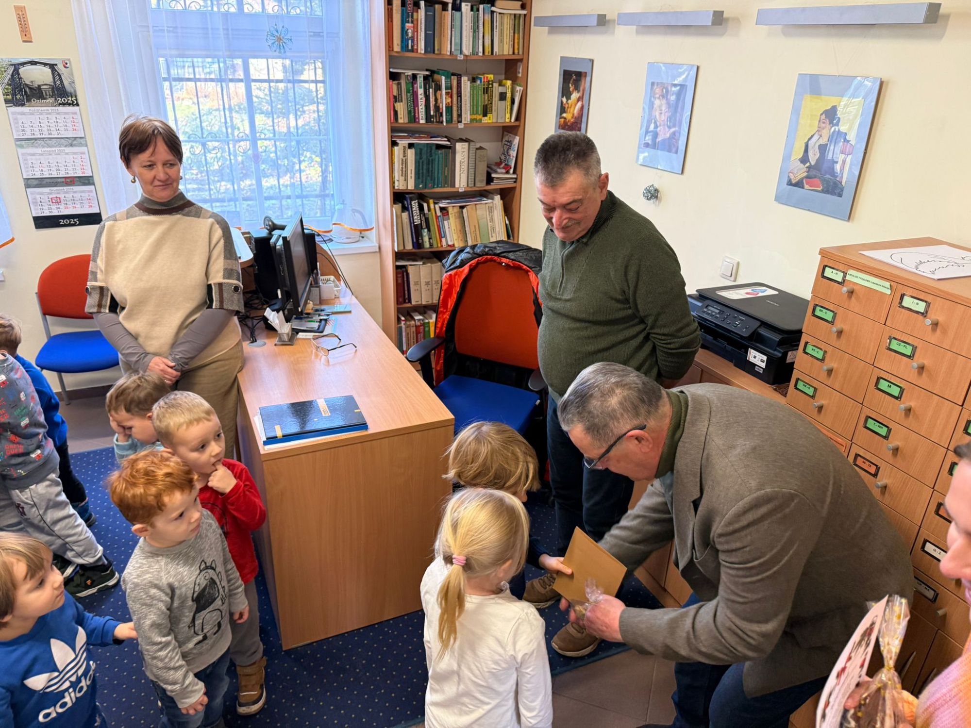 W pierwszych tygodniach grudnia, przedszkolaki z Piąteczki wzięły udział w wyjątkowej akcji wymiany kartek świątecznych w ramach "Innowacji pedagogicznej - Weihnachtskartenaustausch" autorstwa Dominiki Gerlich. Celem przedsięwzięcia było rozwijanie wrażliwosci oraz budowanie relacji z lokalną społecznością i dziećmi z innego przedszkola. Przedszkolaki z wielkim zaangażowaniem przygotowywały kartki świąteczne, wkładając w nie dużo serca i radości. W ramach tej akcji 11 grudnia do naszego przedszkola przyjechała pani Ewa Wąsowicz z Zespołu Szkolono - Przedszkolnego w Grodźcu, w celu wymienienia się z naszymi dziećmi kartkami i życzeniami bożonarodzeniowymi. Sprawiło to naszym wychowankom wiele radości i było dla nich cennym doświadczeniem, uczącym życzliwości i radości płynącej z obdarowywania innych. W piątek 12 grudnia przedszkolanki odwiedziły bibliotekę w Krasiejowie. Spotkanie miało wyjątkowy charakter, ponieważ połączyło w sobie miłość do książek, świąteczną tradycję oraz piękny gest pamięci o osobach zaangażowanych w życie lokalnej społeczności. Na to spotkanie zaproszono sołtysa wsi pana Tadeusza Markulaka, przedstawiciela DFK Krasiejów pana Piotra Szubert oraz bibliotekarkę panią Aldonę Kuśmierską. Dzieci wręczyły im własnoręcznie wykonane kartki świąteczne składając jednocześnie serdeczne życzenia bożonarodzeniowe. Szczególnym momentem spotkania było czytanie opowiadania światecznego przez Pana Piotra i Panią Aldonę. Wszyscy z zainteresowaniem słuchali histroii, która wprowadziła w magiczną atmosferę zbliżających się świąt Bożego Narodzenia. Spotkanie było miłym i wzruszającym momentem, a uśmiechy na twarzach obdarowanych były najlepszym dowodem na to, jak ważne są takie gesty. Podczas wizyty w bibliotece przedszkolaki miały okazję obejrzeć bogate zbiory w bibliotece w Krasiejowie.