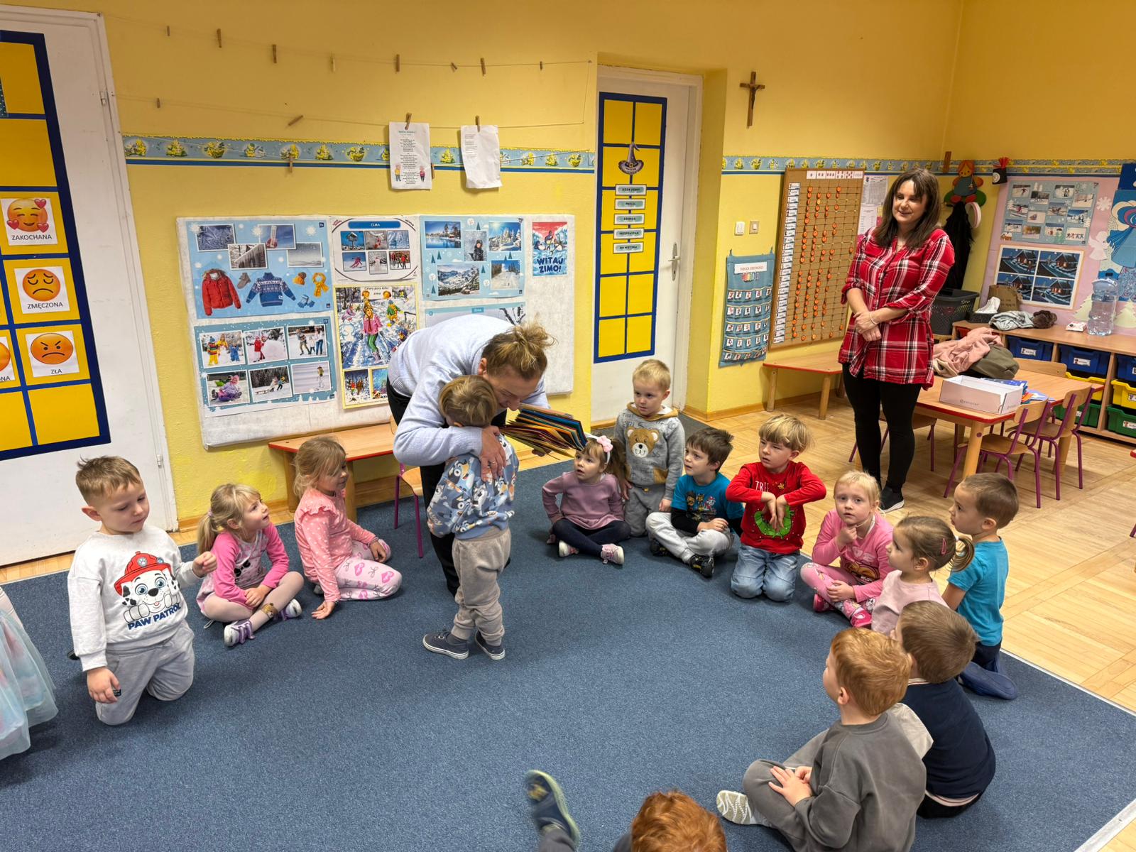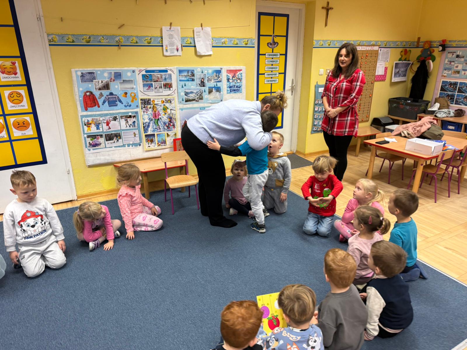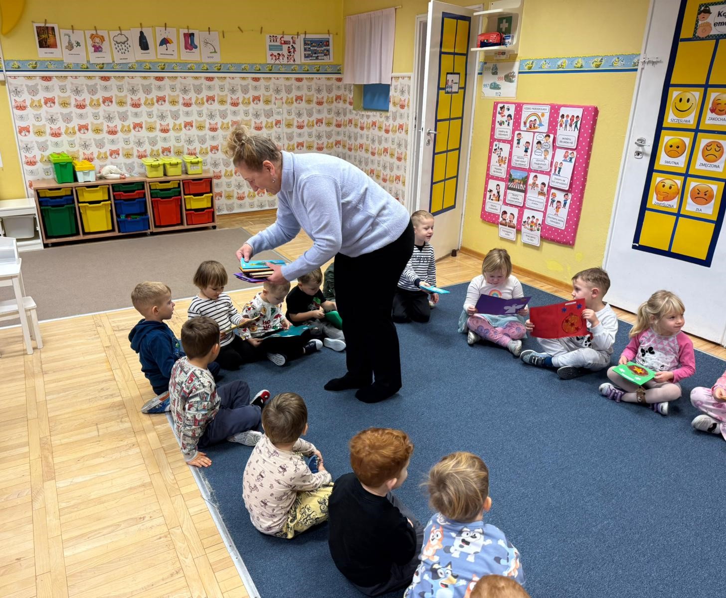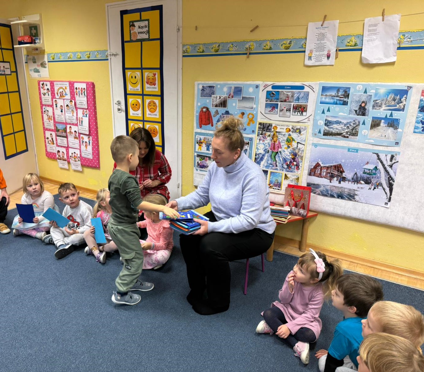 W pierwszych tygodniach grudnia, przedszkolaki z Piąteczki wzięły udział w wyjątkowej akcji wymiany kartek świątecznych w ramach "Innowacji pedagogicznej - Weihnachtskartenaustausch" autorstwa Dominiki Gerlich. Celem przedsięwzięcia było rozwijanie wrażliwosci oraz budowanie relacji z lokalną społecznością i dziećmi z innego przedszkola. Przedszkolaki z wielkim zaangażowaniem przygotowywały kartki świąteczne, wkładając w nie dużo serca i radości. W ramach tej akcji 11 grudnia do naszego przedszkola przyjechała pani Ewa Wąsowicz z Zespołu Szkolono - Przedszkolnego w Grodźcu, w celu wymienienia się z naszymi dziećmi kartkami i życzeniami bożonarodzeniowymi. Sprawiło to naszym wychowankom wiele radości i było dla nich cennym doświadczeniem, uczącym życzliwości i radości płynącej z obdarowywania innych. W piątek 12 grudnia przedszkolanki odwiedziły bibliotekę w Krasiejowie. Spotkanie miało wyjątkowy charakter, ponieważ połączyło w sobie miłość do książek, świąteczną tradycję oraz piękny gest pamięci o osobach zaangażowanych w życie lokalnej społeczności. Na to spotkanie zaproszono sołtysa wsi pana Tadeusza Markulaka, przedstawiciela DFK Krasiejów pana Piotra Szubert oraz bibliotekarkę panią Aldonę Kuśmierską. Dzieci wręczyły im własnoręcznie wykonane kartki świąteczne składając jednocześnie serdeczne życzenia bożonarodzeniowe. Szczególnym momentem spotkania było czytanie opowiadania światecznego przez Pana Piotra i Panią Aldonę. Wszyscy z zainteresowaniem słuchali histroii, która wprowadziła w magiczną atmosferę zbliżających się świąt Bożego Narodzenia. Spotkanie było miłym i wzruszającym momentem, a uśmiechy na twarzach obdarowanych były najlepszym dowodem na to, jak ważne są takie gesty. Podczas wizyty w bibliotece przedszkolaki miały okazję obejrzeć bogate zbiory w bibliotece w Krasiejowie.
