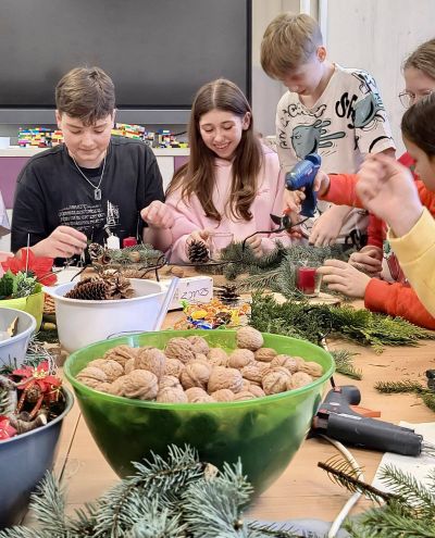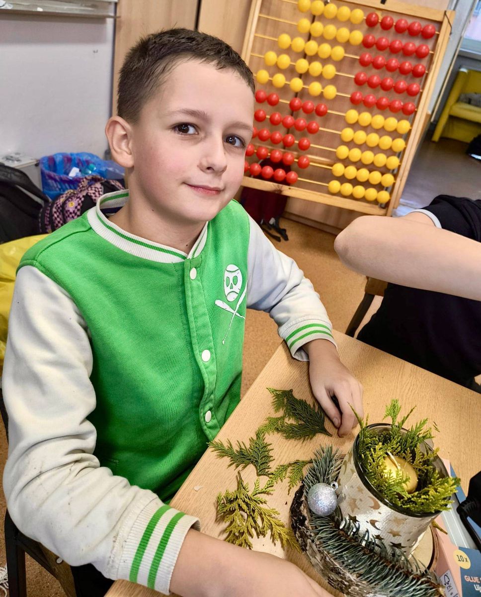 W naszej świetlicy zapanował prawdziwie magiczny, świąteczny klimat! Uczniowie, pełni energii i radosnego zapału, wzięli udział w wyjątkowych warsztatach bożonarodzeniowych zorganizowanych przez Samorząd Uczniowski. Podczas zajęć powstawały niezwykłe, własnoręcznie wykonane ozdoby świąteczne — błyszczące dekoracje i piękne stroiki z pachnących, zielonych gałązek. Zapach świąt unosił się w całej świetlicy! Dzieci wykazały się ogromną kreatywnością, pomysłowością i starannością. Powstały prawdziwe małe dzieła sztuki — każdy stroik i każda ozdoba to efekt ich pracy, serca i wyobraźni. Zobaczcie sami!