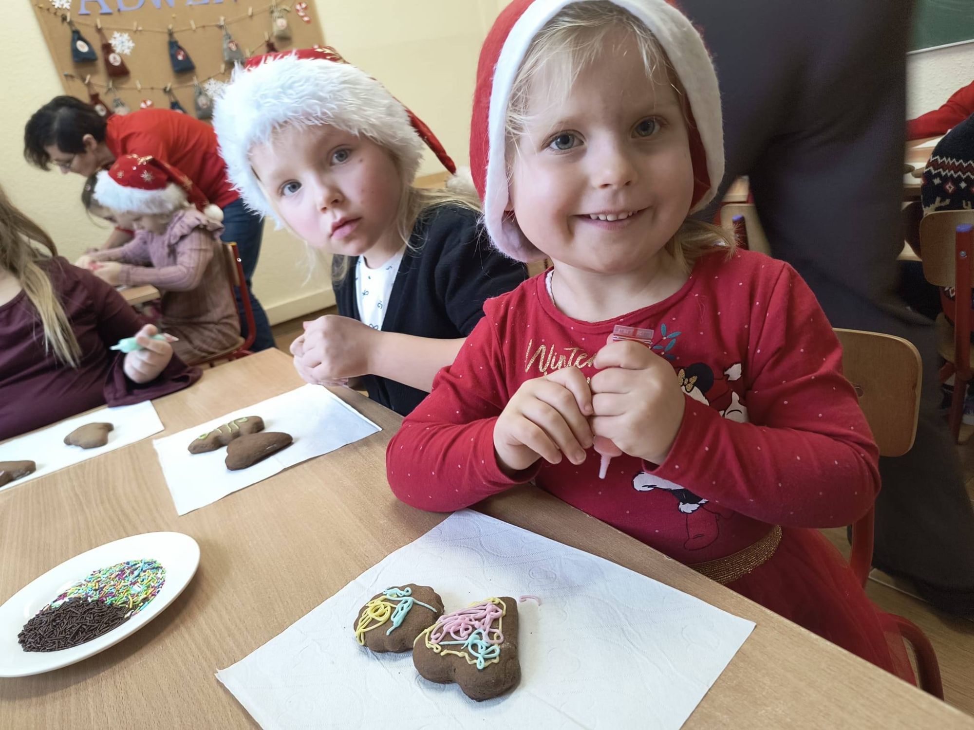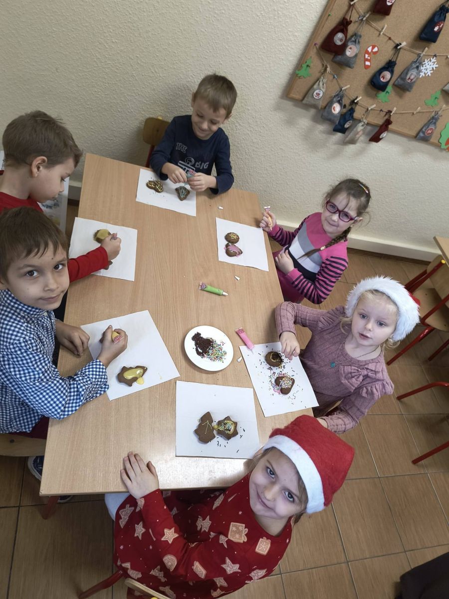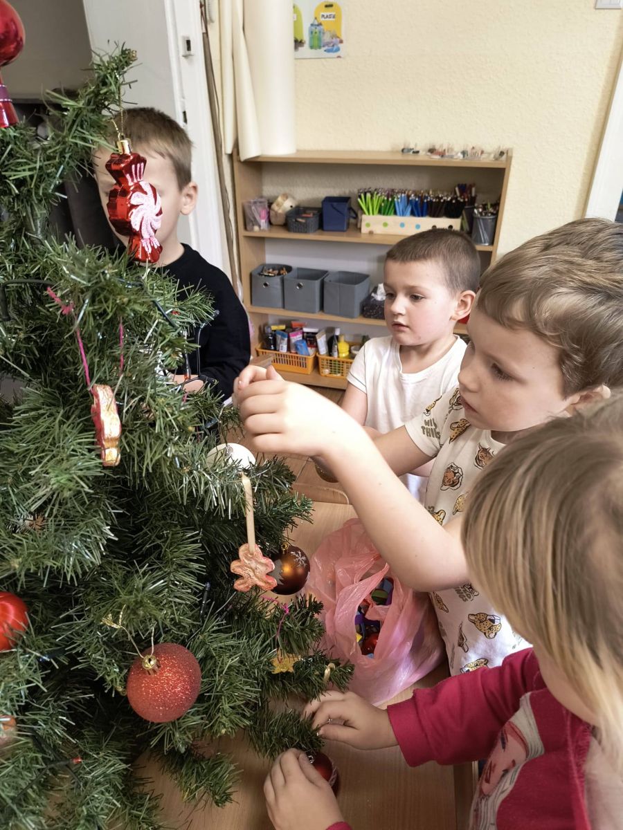 Z początkiem grudnia i Adwentu w naszym oddziale przedszkolnym zrobiło się naprawdę świątecznie! Dzieci z ogromną radością zabrały się za przygotowania — najpierw ulepiły i pomalowały ozdoby z masy solnej, które później zawiesiły na choince. Następnie wspólnie ubierały drzewko, dodając do niego mnóstwo uśmiechu i świątecznej energii. Podczas przygotowań powstał też kolorowy, papierowy łańcuch — tworzony z rozmowami, śmiechem i prawdziwym zaangażowaniem. Nie zabrakło również wyjątkowego gościa — odwiedził nas Święty Mikołaj! Dzieci dzieliły się wrażeniami, zadawały pytania, a radości nie było końca. Gościliśmy także panią Agatę z biblioteki, która przeniosła nas w świąteczny świat dzięki pięknej opowieści przedstawionej w formie teatrzyku kamishibai. To właśnie wtedy odbyła się wspólna dekoracja pierniczków, która sprawiła wszystkim mnóstwo słodkiej radości. Cieszymy się, że możemy wspólnie przeżywać ten piękny, przedświąteczny czas — pełen magii, twórczej zabawy i radosnych chwil.