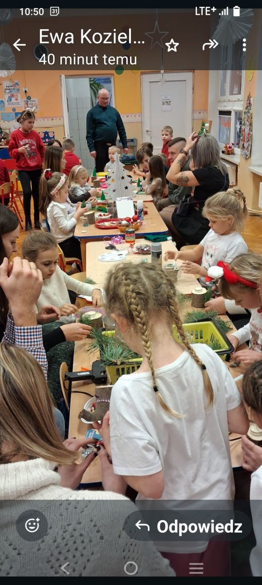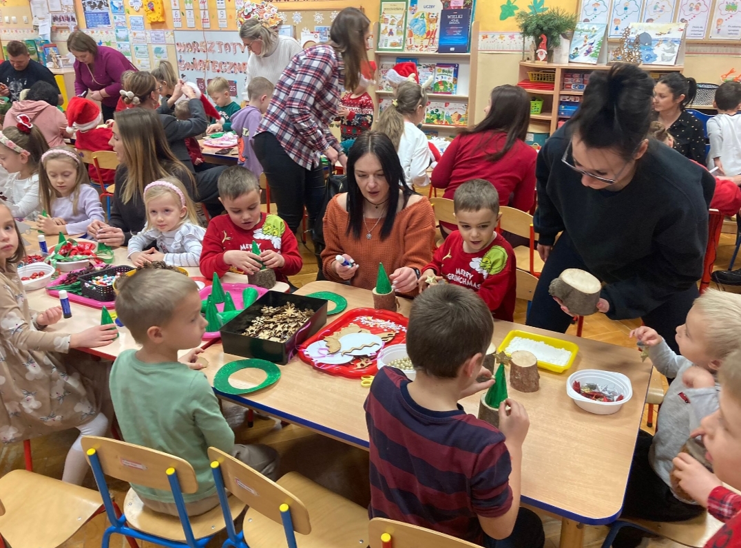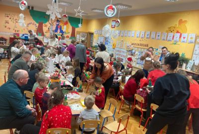 Święta Bożego Narodzenia to szczególny czas. Zapach pomarańczy, piernika i przystrojona choinka – to buduje magiczny świąteczny klimat. I właśnie po to, aby i Przedszkolu Publicznym Nr 1 w Ozimku zagościła świąteczna atmosfera w ostatnim tygodniu przed świętami w dwóch najstarszych grupach zostały zorganizowane warsztaty Bożonarodzeniowe z udziałem rodziców. Celem było wykonanie ozdób świątecznych, świąteczne zabawy oraz słodki poczęstunek. Rodzice i dzieci z zapałem wykonywali piękne ozdoby, wykazując przy tym wiele pomysłowości i kreatywności. Wspólna twórczość w atmosferze zabawy, zaangażowanie, przeżyte emocje, a co najważniejsze czas, który dzieci spędziły z rodzicami to bardzo cenne doświadczenie dla obu stron.