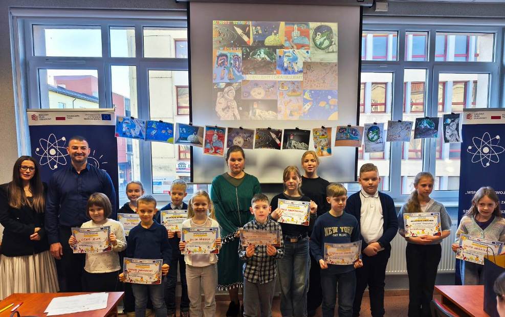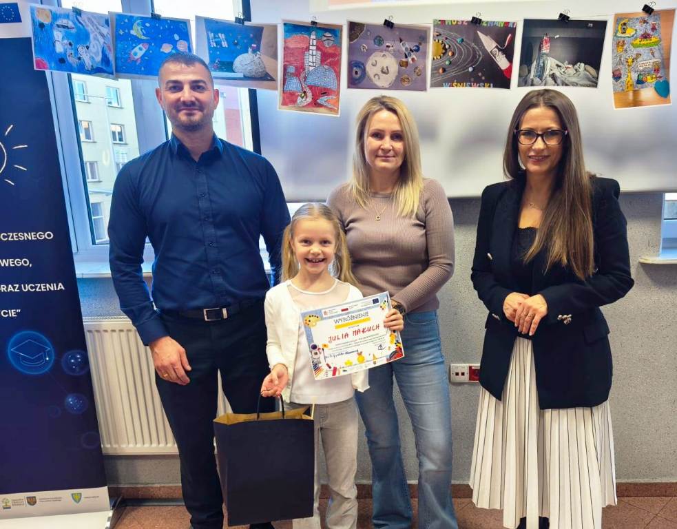 No i stało się. Nasza utalentowana uczennica klasy II a – Julia Makuch odleciała w kosmos puszczając wodze swojej fantazji podczas wykonywania pracy na kosmiczny konkurs. Ten „odlot” zapewnił jej wyróżnienie w konkursie plastycznym „Polak w kosmosie - polski astronauta w przyszłości”. Organizatorem konkursu było Starostwo Powiatowe w Opolu w ramach projektu „Wsparcie rozwoju nowoczesnego kształcenia zawodowego, szkolnictwa wyższego oraz uczenia się przez całe życie” w powiecie opolskim. Odbierając nagrodę na gali w Starostwie Opolskim Julia miała również okazję uczestniczyć w warsztatach artystycznych prowadzonych przez panią Sandrę Berken, podczas których uczestnicy tworzyli prototypy robotów, pojazdów i urządzeń, które mogłyby być wykorzystane w kosmosie. Nasza Julka i z tym zadaniem poradziła sobie znakomicie. Cóż, jej fantazja i kreatywność nie ma granic…