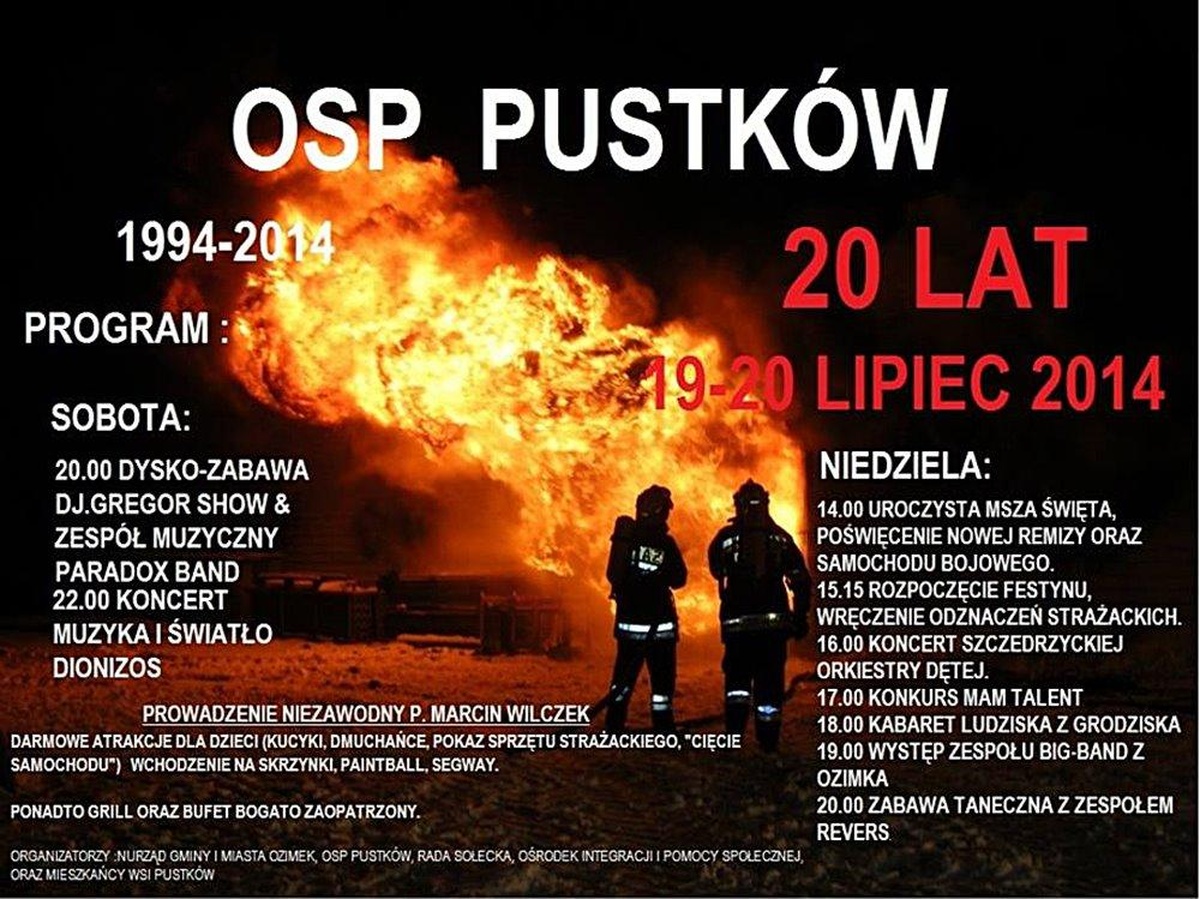 Serdecznie zapraszamy na uroczystości 20-lecia OSP Pustków, które odbędą się w dniach 19-20 lipca 2014 w Pustkowiu. Organizatorzy przygotowali liczne atrakcje. Więcej na plakacie.