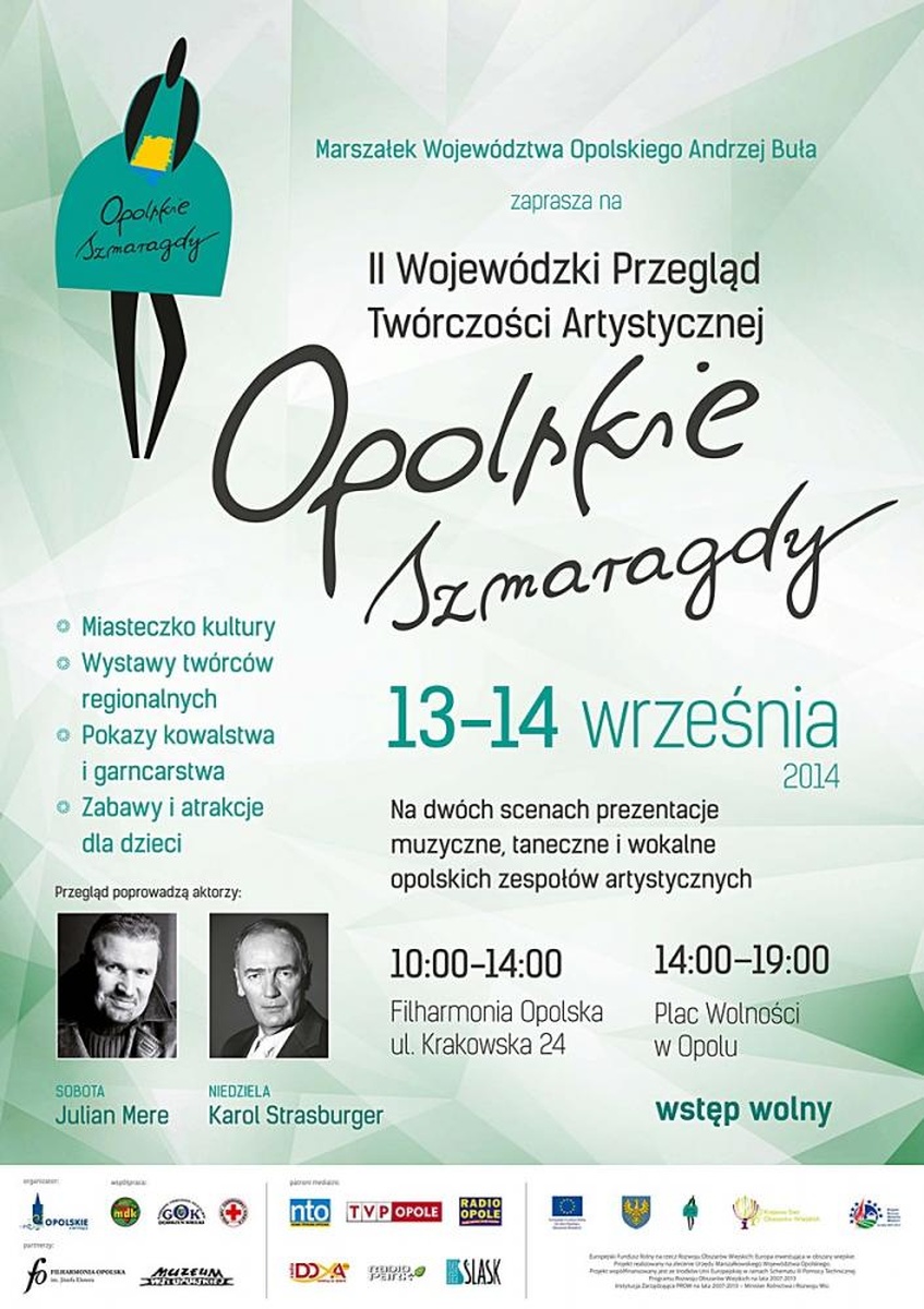 Już po raz drugi regionalni artyści będą mieli szansę zaprezentować swoją twórczość podczas Wojewódzkiego Przeglądu Twórczości Artystycznej Opolskie Szmaragdy. W programie tegorocznej edycji przewidziano występy na dwóch scenach: w Filharmonii Opolskiej oraz na Placu Wolności w Opolu, a także wystawy twórców regionalnych w Miasteczku kultury. Przegląd w dniach 13- 14 września 2014 r. poprowadzą aktorzy Karol Strasburger oraz Julian Mere.