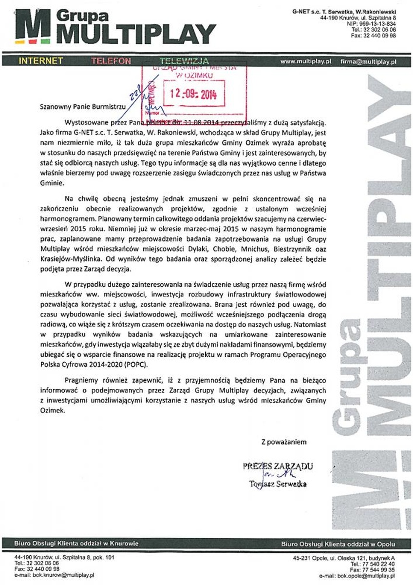 w związku z pismem Prezesa Zarządu Grupy Multiplay Tomasza Serwatka dot. inwestycji rozbudowy infrastruktury światłowodowej na terenie Gminy Ozimek zachęcam mieszkańców miejscowości Biestrzynnik, Chobie, Dylaki, Mnichus oraz Krasiejów-Myślinka, aby podczas badań zapotrzebowania na usługi Grupy Multiplay wyrazili pozytywną aprobatę.