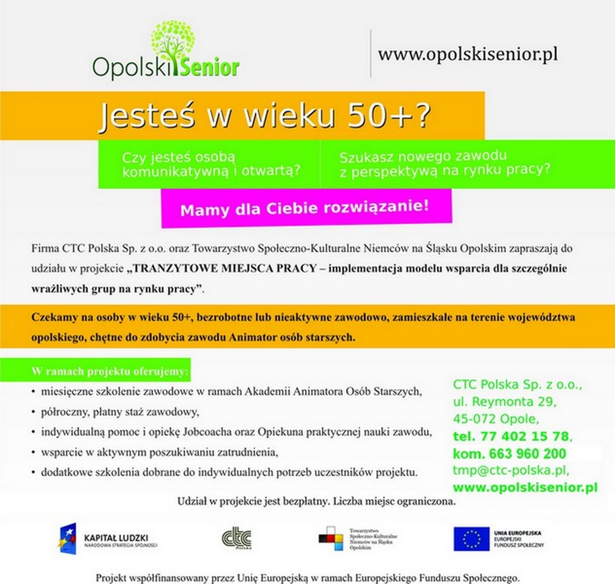 Wszystkich zainteresowanych uczestnictwem w projekcie zapraszamy do Biura Projektu: CTC Polska Sp. z o.o., ul. Reymonta 29, 45-072 Opole, tel. 77 402 15 78, e-mail: tmp@ctc-polska.pl,