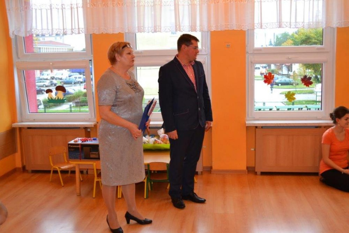 Każdy maluszek otrzymał "rożek obfitości- tytę" przygotowany przez swoje Panie z grupy. Na uroczystość zaproszono naszego włodarza Burmistrza Ozimka Marka Korniaka, który podarował dzieciom zestaw mini audio.
