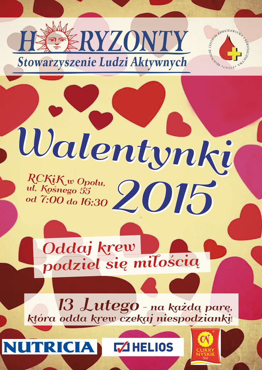 Stowarzyszenie Ludzi Aktywnych "Horyzonty" wraz z Regionalnym Centrum Krwiodawstwa i Krwiolecznictwa w Opolu zapraszają do wzięcia udziału akcji – „Oddaj krew - podziel się miłością”. Na każdą parę, która zjawi się dnia 13 lutego 2015 roku (piątek) w Regionalne Centrum Krwiodawstwa i Krwiolecznictwa w Opolu na ul. Kośnego 55 i odda krew, czekają niespodzianki!