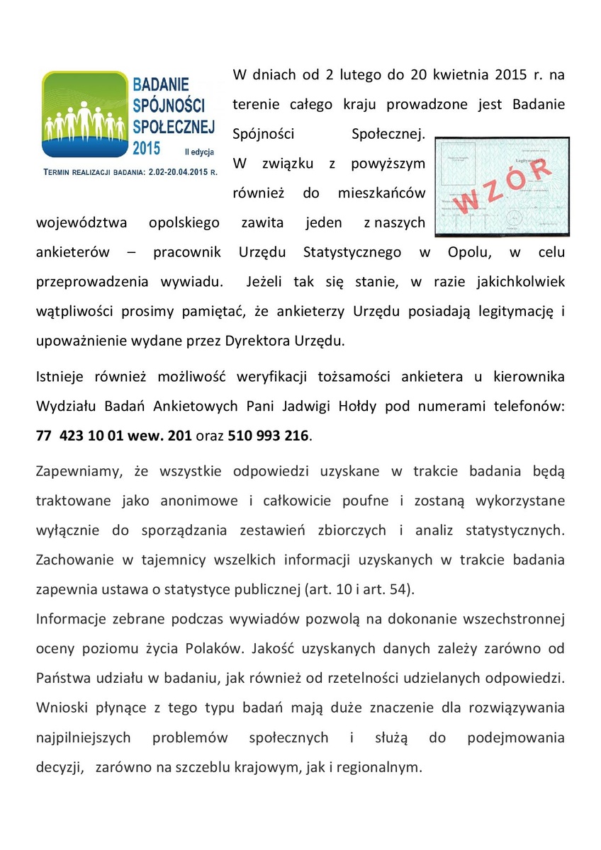 W dniach od 2 lutego do 20 kwietnia 2015 r. na terenie całego kraju prowadzone jest Badanie Spójności Społecznej. W związku z powyższym również do mieszkańców województwa opolskiego zawita jeden z naszych ankieterów – pracownik Urzędu Statystycznego w Opolu, w celu przeprowadzenia wywiadu. Jeżeli tak się stanie, w razie jakichkolwiek wątpliwości prosimy pamiętać, że ankieterzy Urzędu posiadają legitymację i upoważnienie wydane przez Dyrektora Urzędu.